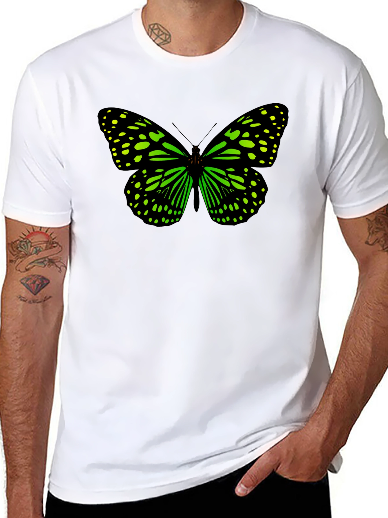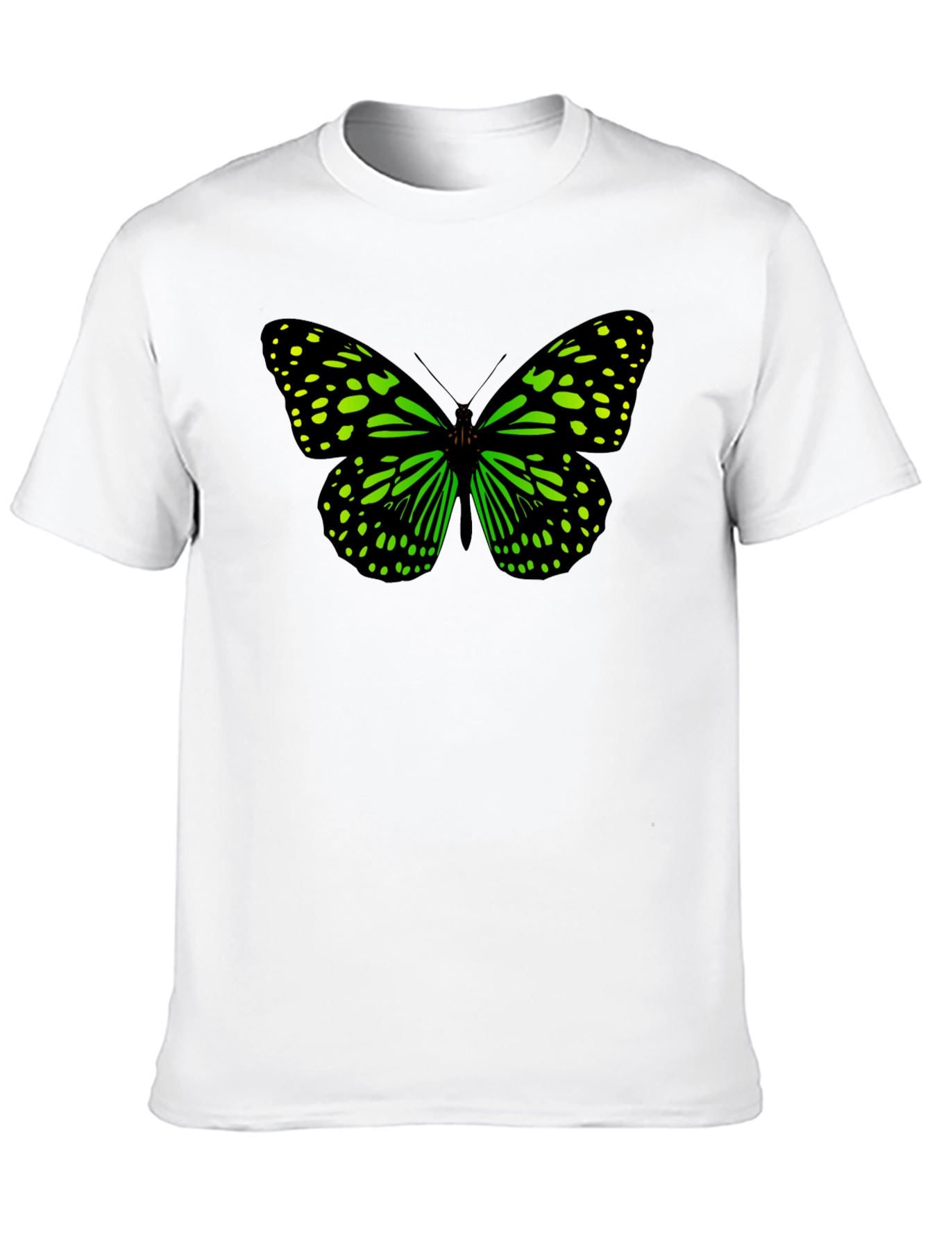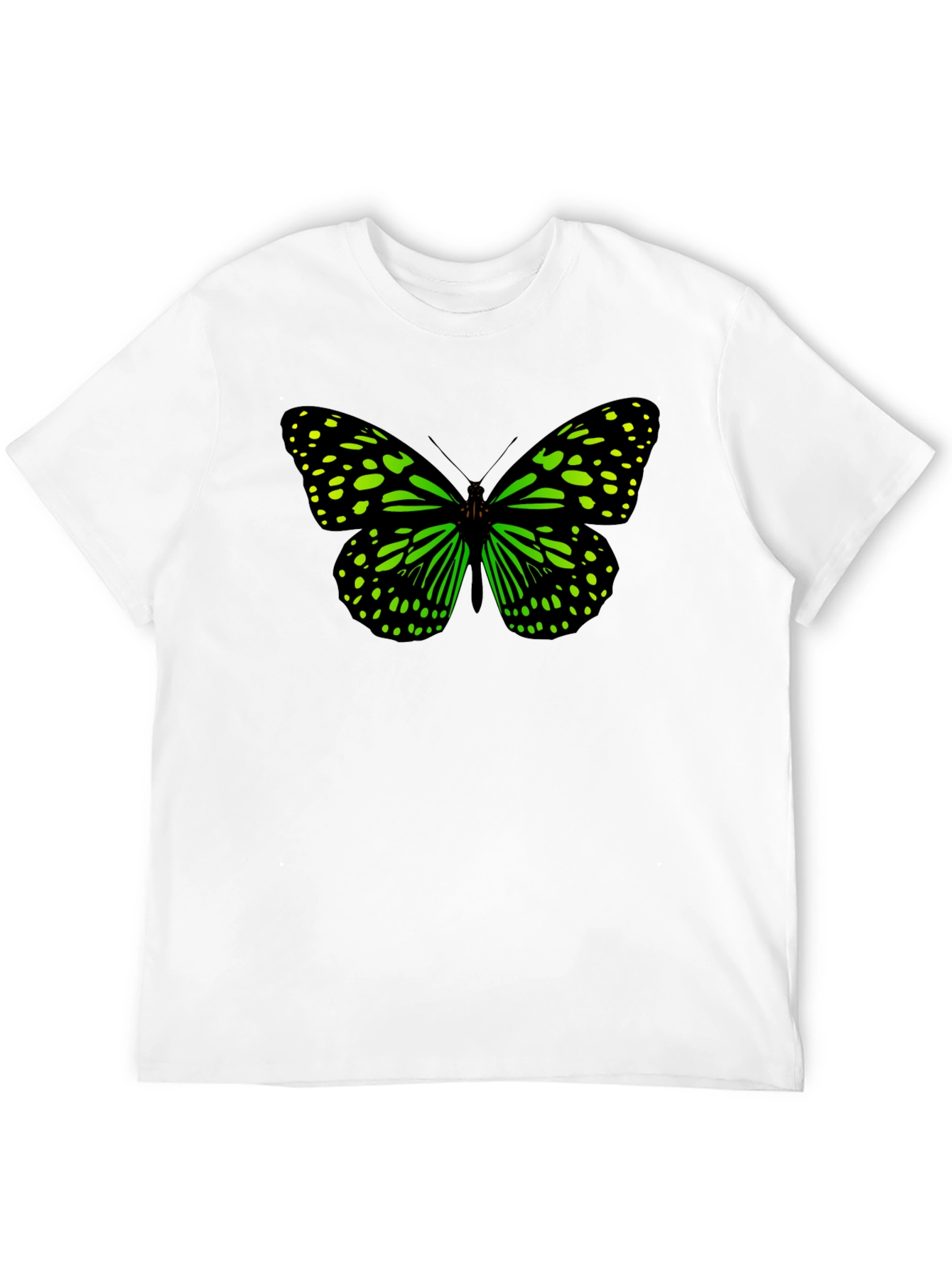 This stylish black t-shirt features a striking butterfly graphic on the front. The butterfly design is rendered in vibrant green and black, creating a bold and eye-catching contrast against the dark background of the shirt. Made from a comfortable and breathable fabric, this tee is perfect for everyday wear. Its casual yet unique design makes it suitable for various occasions, from casual outings to relaxed weekends. Show off your love for nature and fashion with this standout graphic tee.