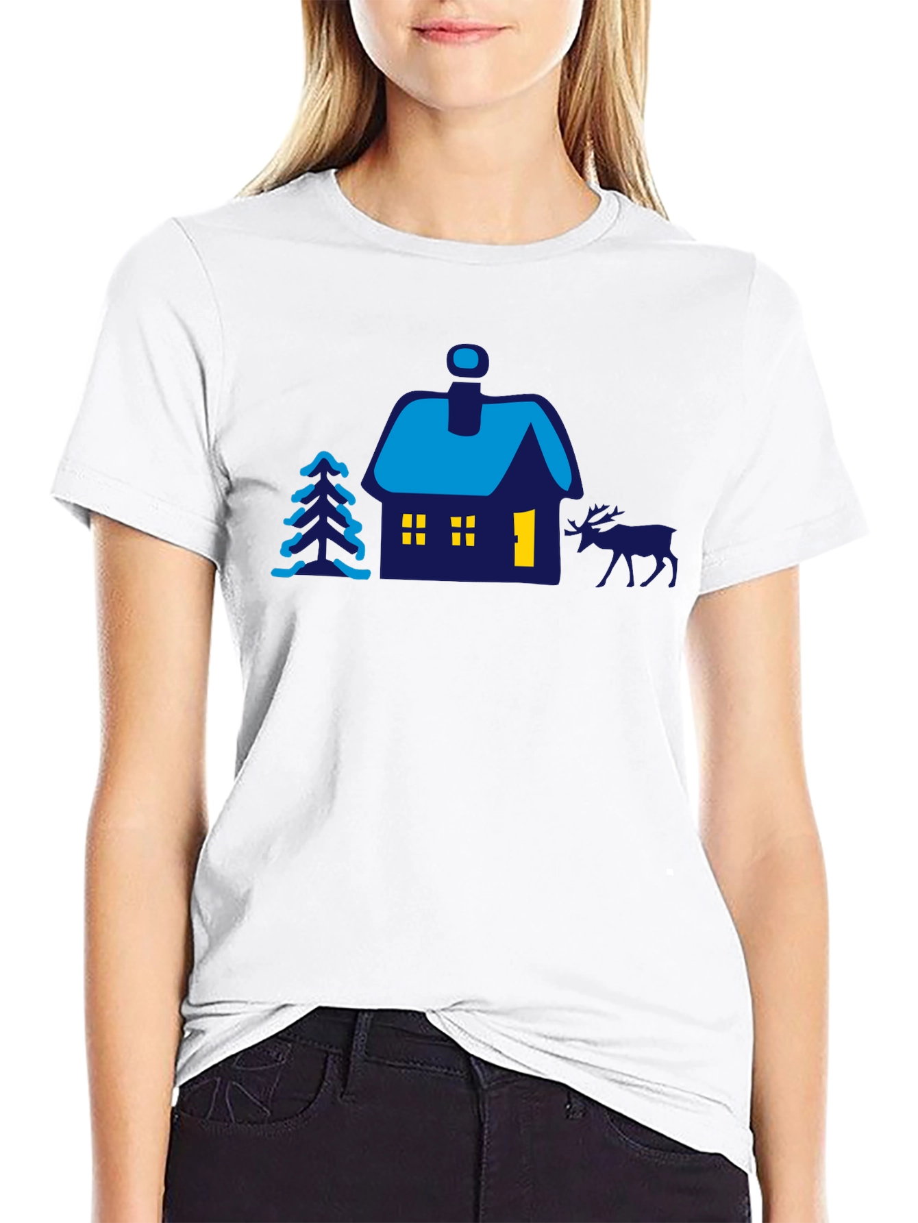 Stay cozy in style with this men's black T-shirt featuring a charming cabin scene graphic. The playful design includes a quaint cabin with lit windows and a smoking chimney, a stylized Christmas tree, and a reindeer silhouette, all rendered in shades of blue and yellow. This tee is perfect for adding a touch of whimsy to your wardrobe. Made from comfortable fabric, this shirt is ideal for casual wear, holiday gatherings, or simply expressing your love for the outdoors. Get yours today and bring the festive spirit wherever you go!