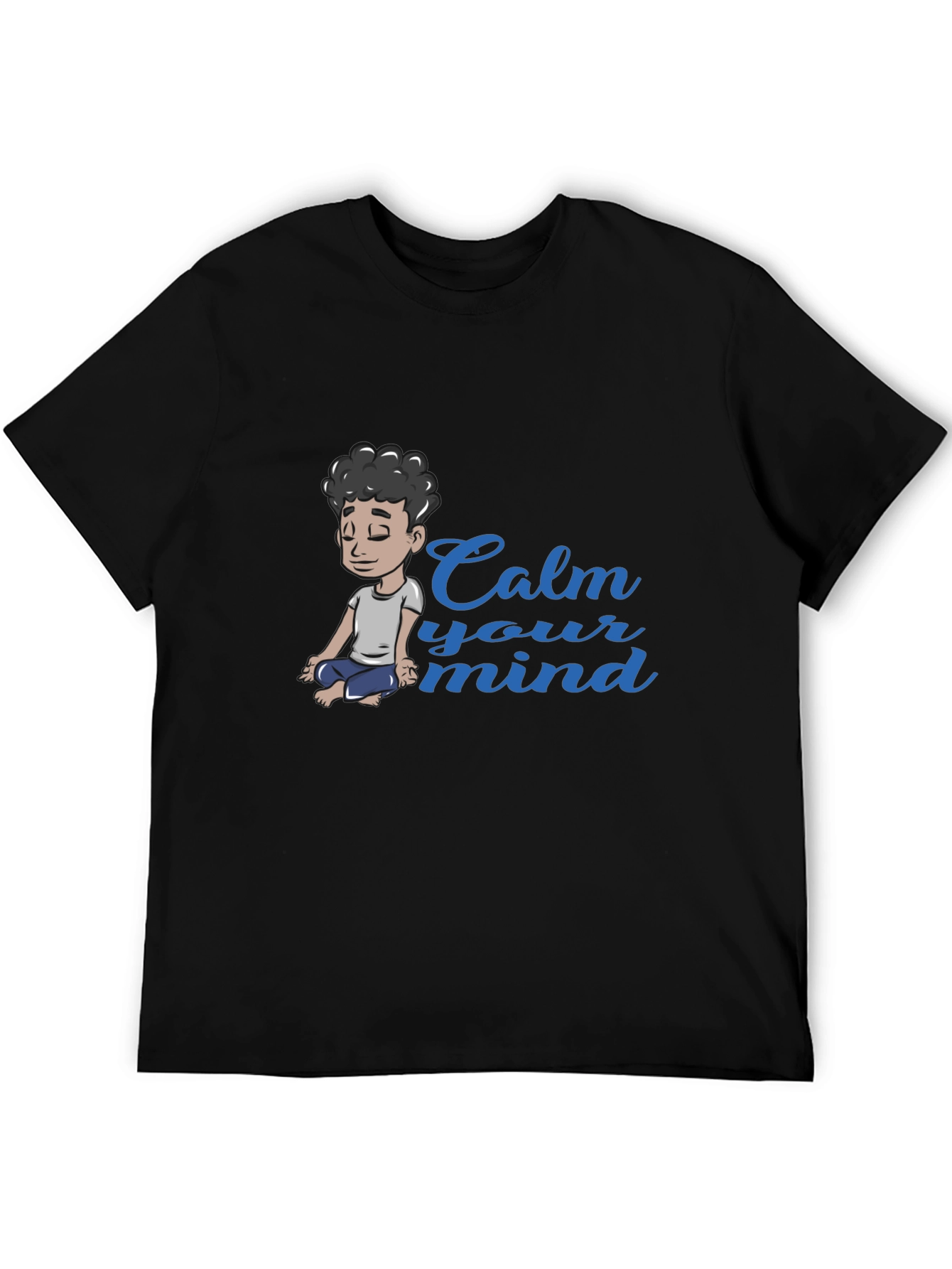 This striking black t-shirt features a cartoon graphic of a person meditating, accompanied by the text "Calm your mind" in an elegant blue font. The design promotes mindfulness and relaxation. Made from a comfortable-looking fabric, this tee is perfect for casual wear, yoga sessions, or as a reminder to stay centered throughout the day. It's a stylish and meaningful addition to any wardrobe, ideal for those seeking a touch of serenity in their everyday life. A must-have for anyone promoting mental wellness.