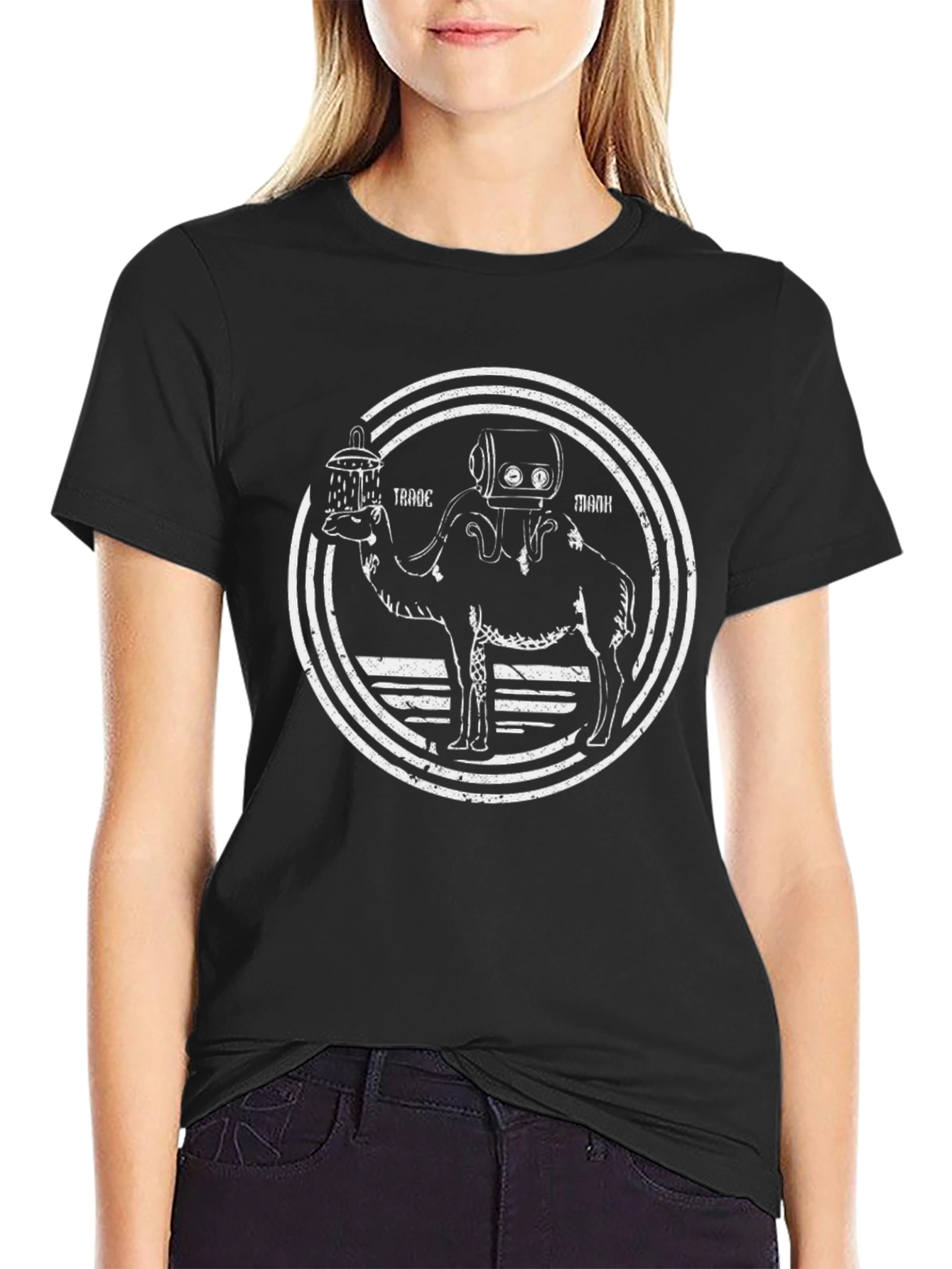 Show off your quirky side with this black graphic tee! Featuring a unique design of a camel carrying a robot-like figure inside a circular 'Trade Mark' emblem. The print has a vintage-inspired, slightly distressed look. Made from a soft fabric blend, this tee is perfect for casual wear. Pair it with jeans or shorts for a relaxed, cool look. Great for anyone who loves unique, eye-catching designs. A fun conversation starter and a comfortable addition to your wardrobe.
