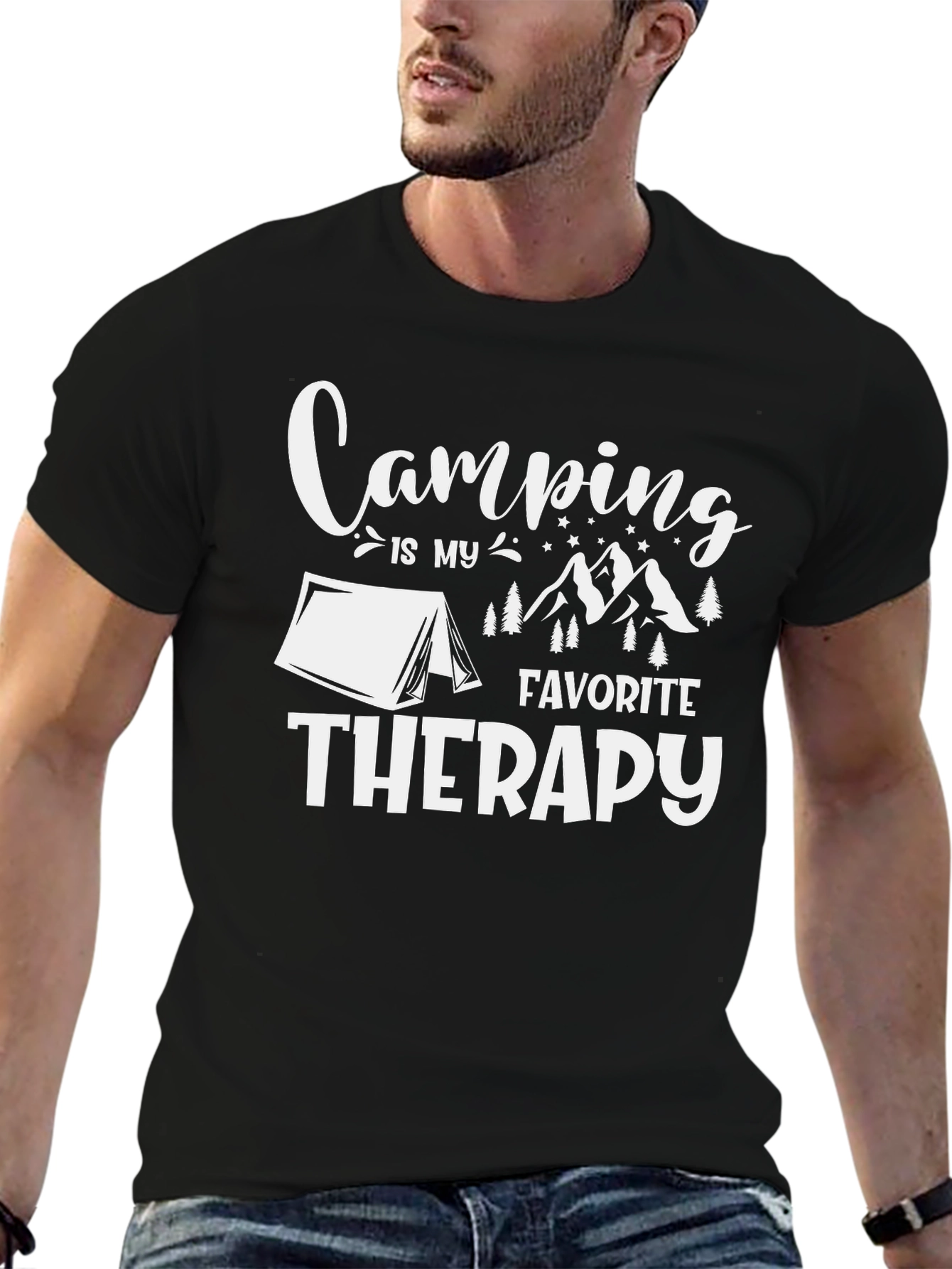 Show off your love for the outdoors with this stylish black t-shirt! The shirt features a bold, white graphic print that reads "Camping IS MY FAVORITE THERAPY," accompanied by playful illustrations of a tent, trees, and mountains. Made from what appears to be a soft and breathable fabric, this tee promises all-day comfort whether you're hitting the trails or relaxing at the campsite. Perfect for camping enthusiasts, nature lovers, or anyone who finds solace in the great outdoors. Grab yours now and let everyone know that camping is your happy place!