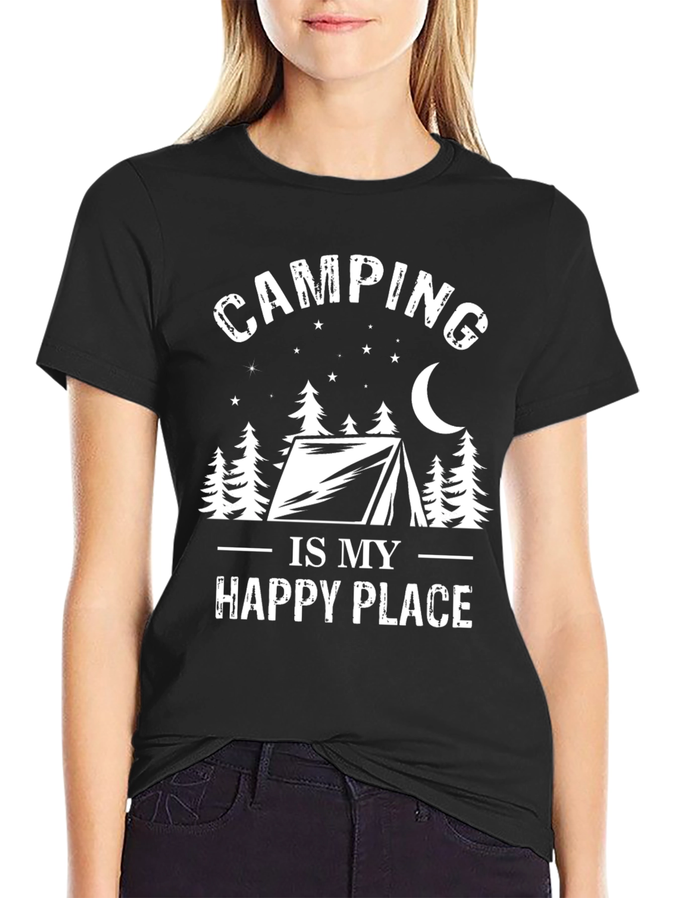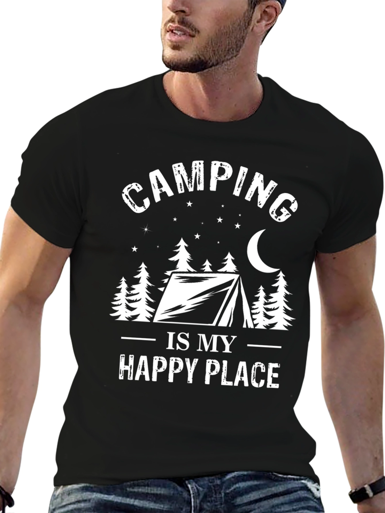 Embrace your love for the outdoors with this stylish graphic tee. This black T-shirt features a bold white print with the phrase "Camping Is My Happy Place," accompanied by an illustration of a tent, trees, stars, and a crescent moon. Made from a soft, comfortable fabric, this shirt is perfect for casual wear or layering under a jacket on cooler evenings. Whether you're an avid camper or simply enjoy the serenity of nature, this T-shirt is a great way to express your passion. Wear it on your next outdoor adventure, to a camping-themed party, or as an everyday reminder of your favorite place.