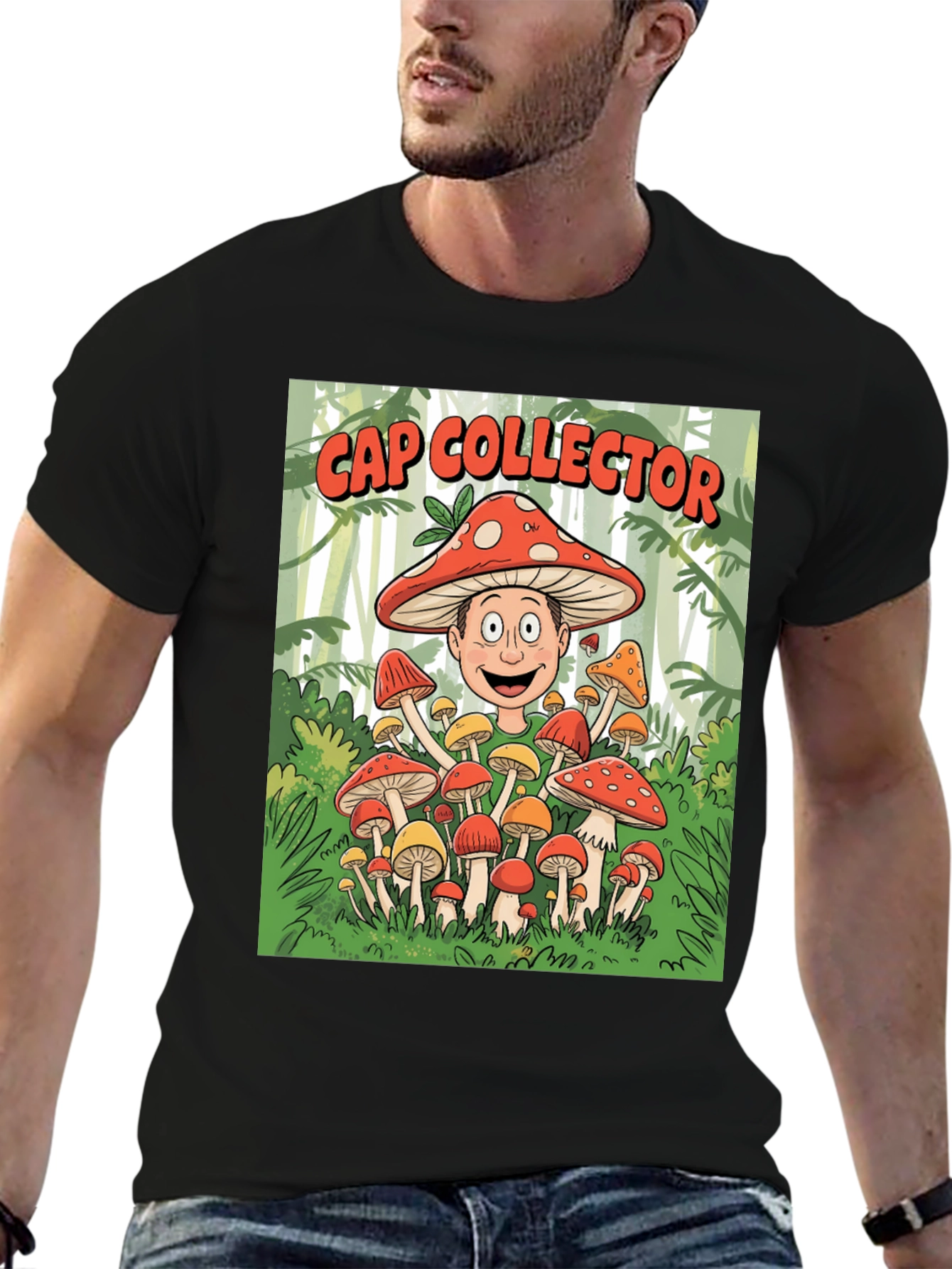 This black t-shirt features a fun and whimsical design. At its center, a cartoon character with a mushroom cap hat stands amidst a forest floor teeming with various mushrooms. Above the image, the words "Cap Collector" are emblazoned in bold red letters. Made from soft, breathable fabric, this tee offers both comfort and style. The playful graphic makes it an ideal choice for casual wear, outings with friends, or anyone with an appreciation for nature-inspired art. It's a statement piece that sparks conversation and showcases a unique personality.