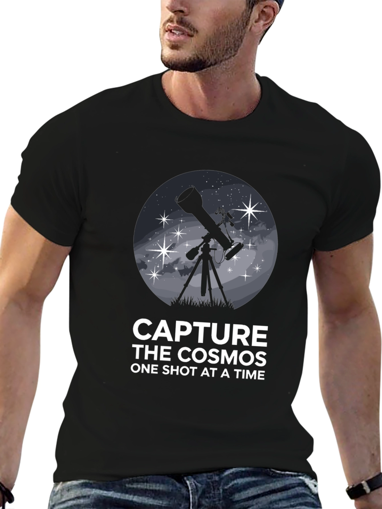 Explore the universe in style with this eye-catching t-shirt! Featuring a striking graphic of a telescope silhouetted against a starlit cosmos, it's perfect for astronomy lovers. The phrase "Capture the Cosmos One Shot at a Time" adds a touch of inspiration. Made from comfortable black material, this tee is ideal for casual wear or a night of stargazing. Show off your passion for the cosmos with this unique and stylish t-shirt. Grab yours today!