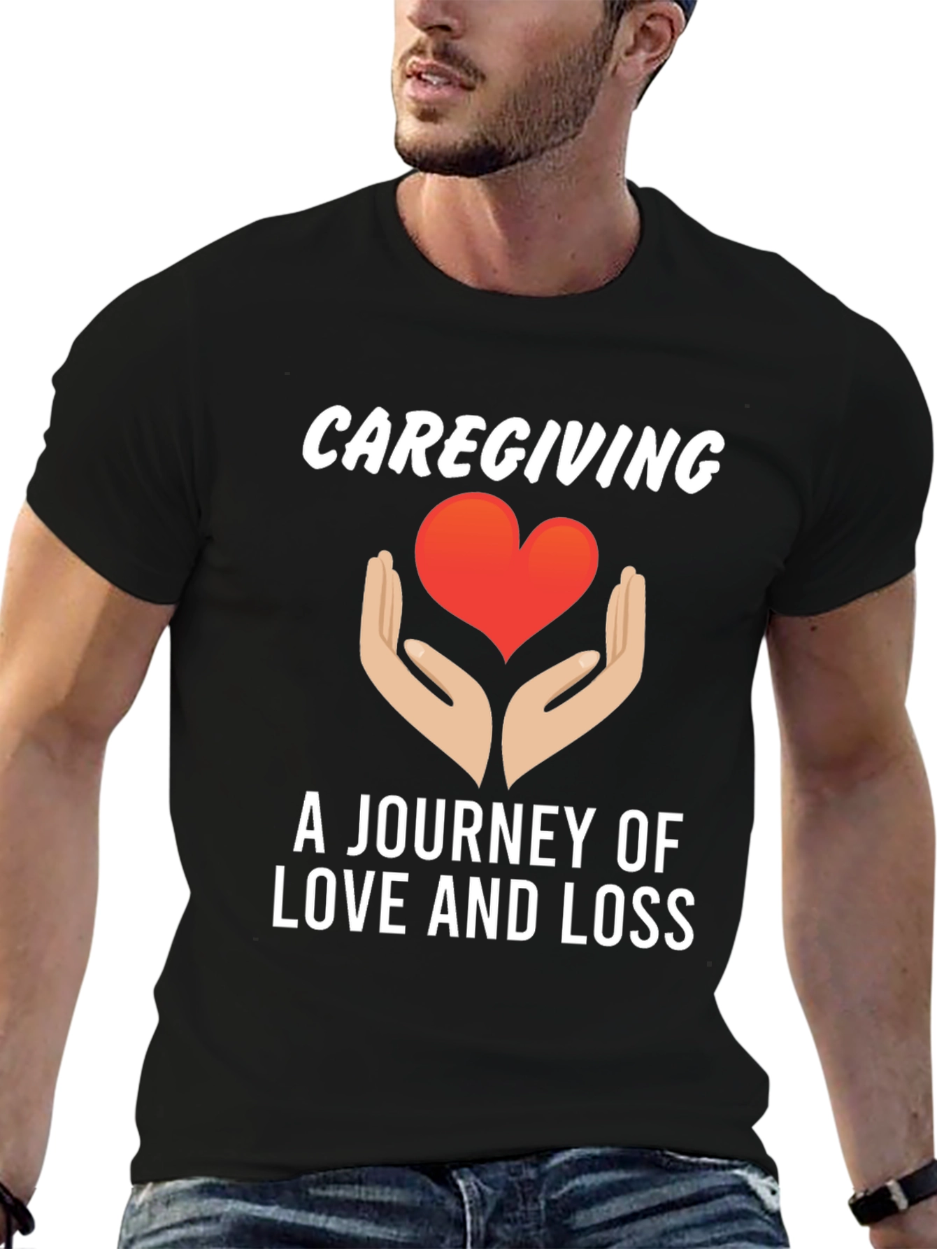 Show your support with this meaningful black t-shirt. Featuring the phrase "Caregiving: A Journey of Love and Loss", this tee includes a heart cradled by two hands, symbolizing compassion and care. Made from a comfortable, breathable fabric, this shirt is perfect for raising awareness, showing solidarity, or simply expressing your support for caregivers. A thoughtful gift or a way to start conversations about the challenges and rewards of caregiving.