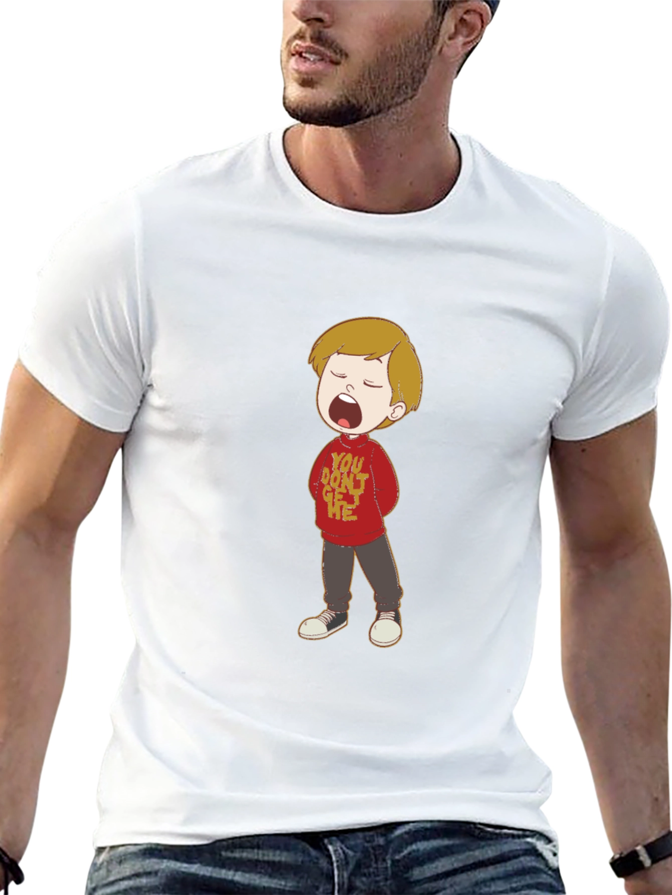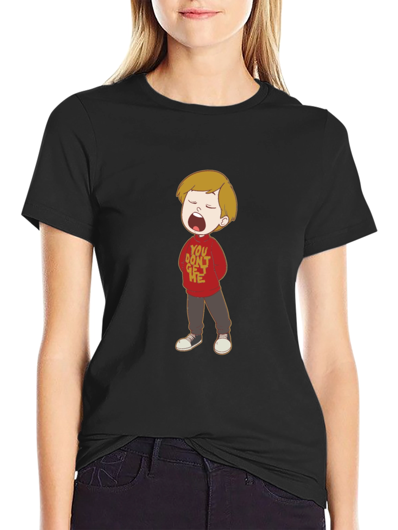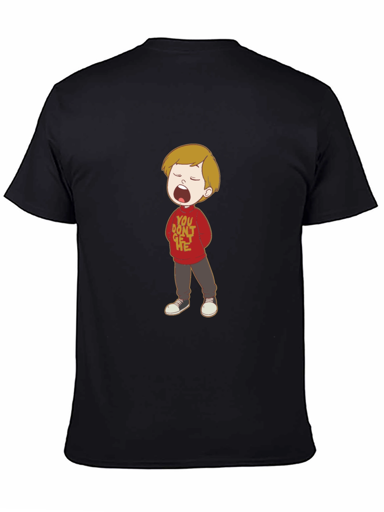 This stylish black tee features a colorful cartoon graphic of a boy with an open mouth, wearing a red sweater with text. The shirt appears to be made from a soft and comfortable cotton blend, ideal for everyday wear. The design is unique and eye-catching, perfect for those who love playful and expressive clothing. Pair it with jeans or shorts for a casual look, or dress it up with a blazer for a more fashionable outfit. A great conversation starter and a fun addition to any wardrobe.