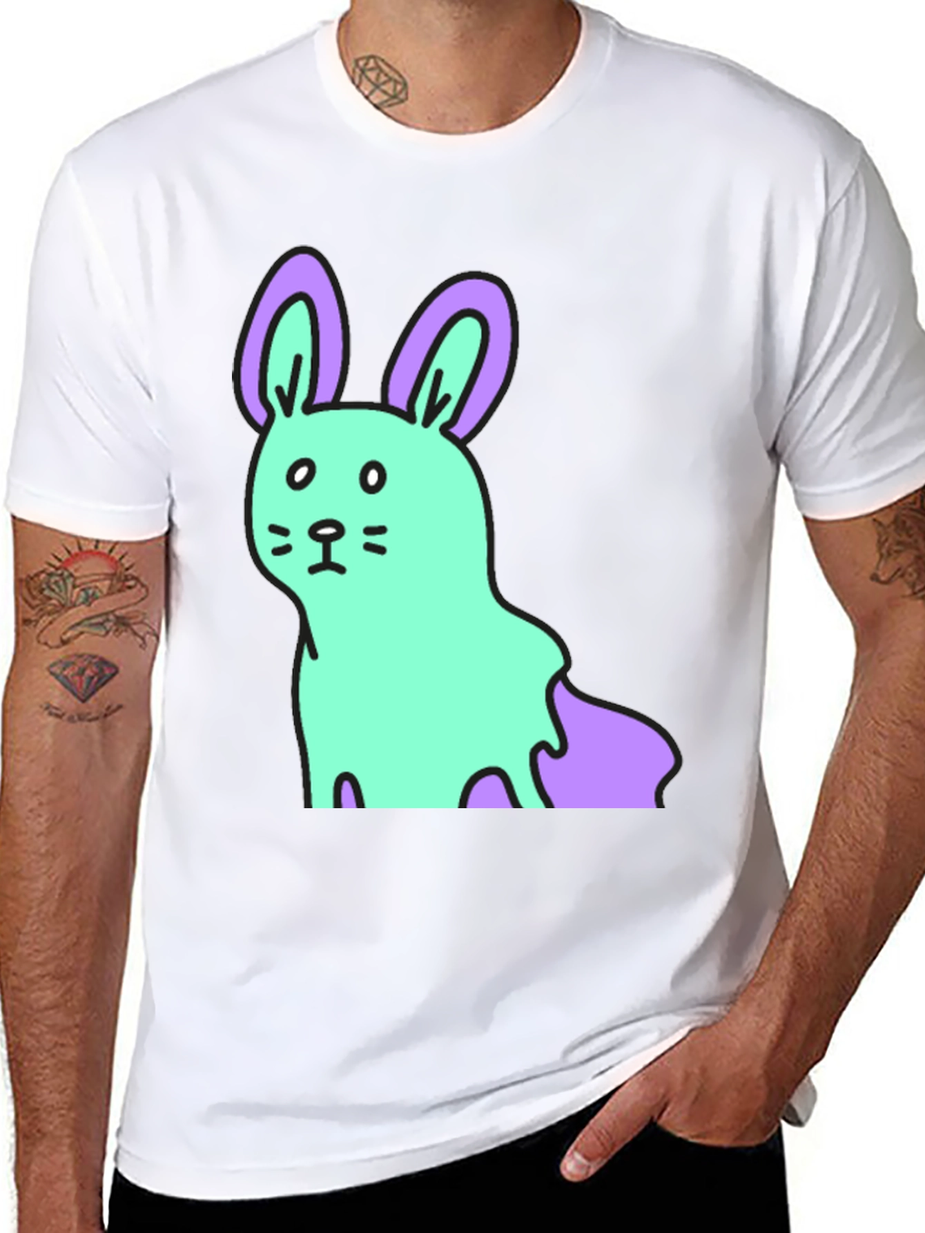Show off your playful side with this unique black t-shirt. Featuring a vibrant cartoon bunny graphic, this tee is sure to turn heads. The bunny design includes an adorable face and floppy ears, with a blend of light blue and purple colors. Made from a comfortable cotton blend, this shirt is perfect for casual outings, lounging at home, or expressing your quirky style. The classic crew neck and short sleeves make it a versatile addition to any wardrobe. Express yourself with this fun and fashionable tee!