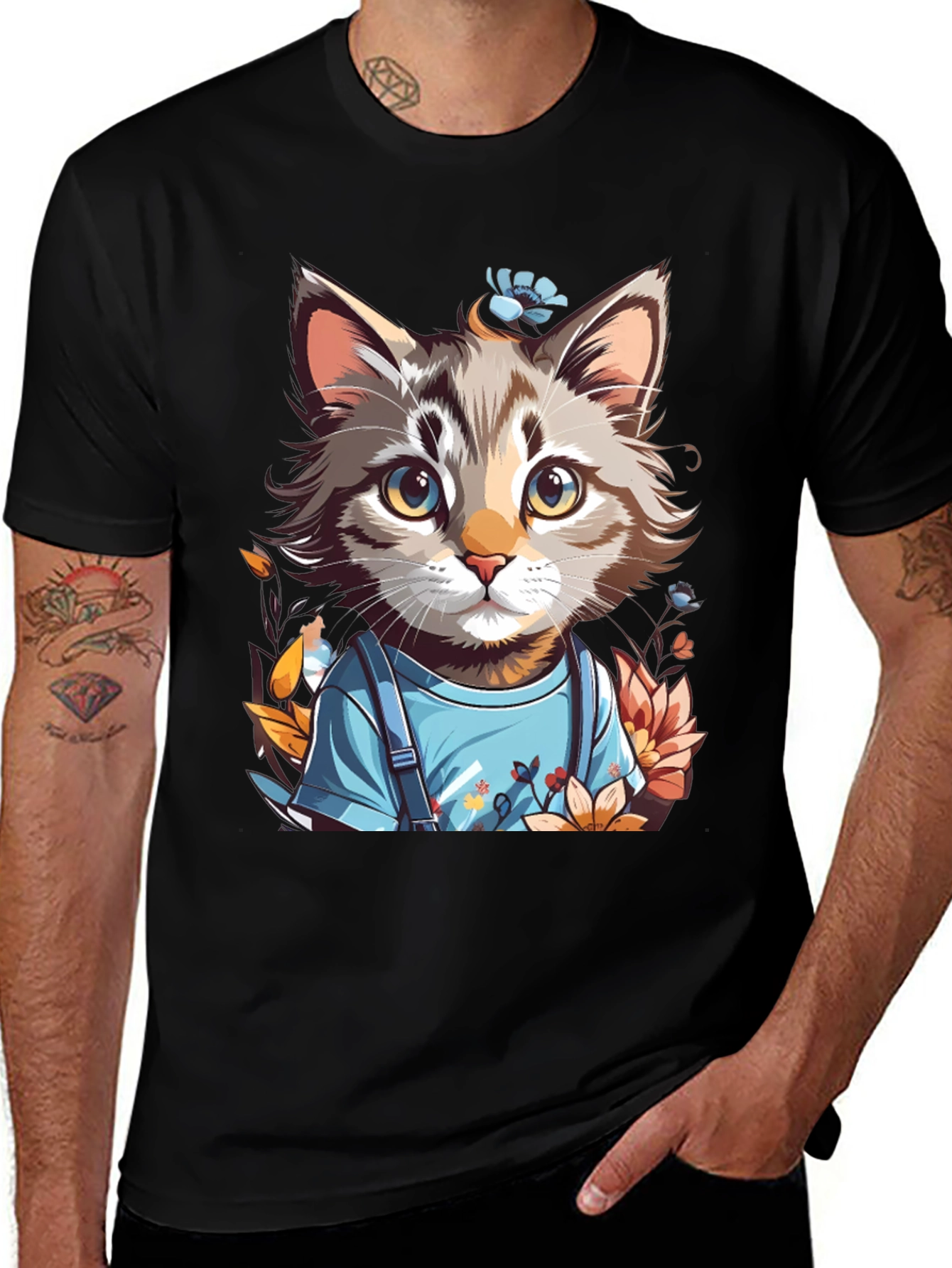 This black t-shirt features an adorable cartoon cat graphic. The cat is depicted with a whimsical, artistic style. The design showcases a cute kitten wearing a blue shirt with suspenders, surrounded by colorful flowers and foliage. This tee is perfect for cat lovers and those who appreciate unique, eye-catching designs. Made from a soft, breathable fabric, this t-shirt is comfortable for all-day wear. Ideal for casual outings, relaxed weekends, or as a fun gift, this t-shirt adds a touch of playful charm to any wardrobe. Get yours today!
