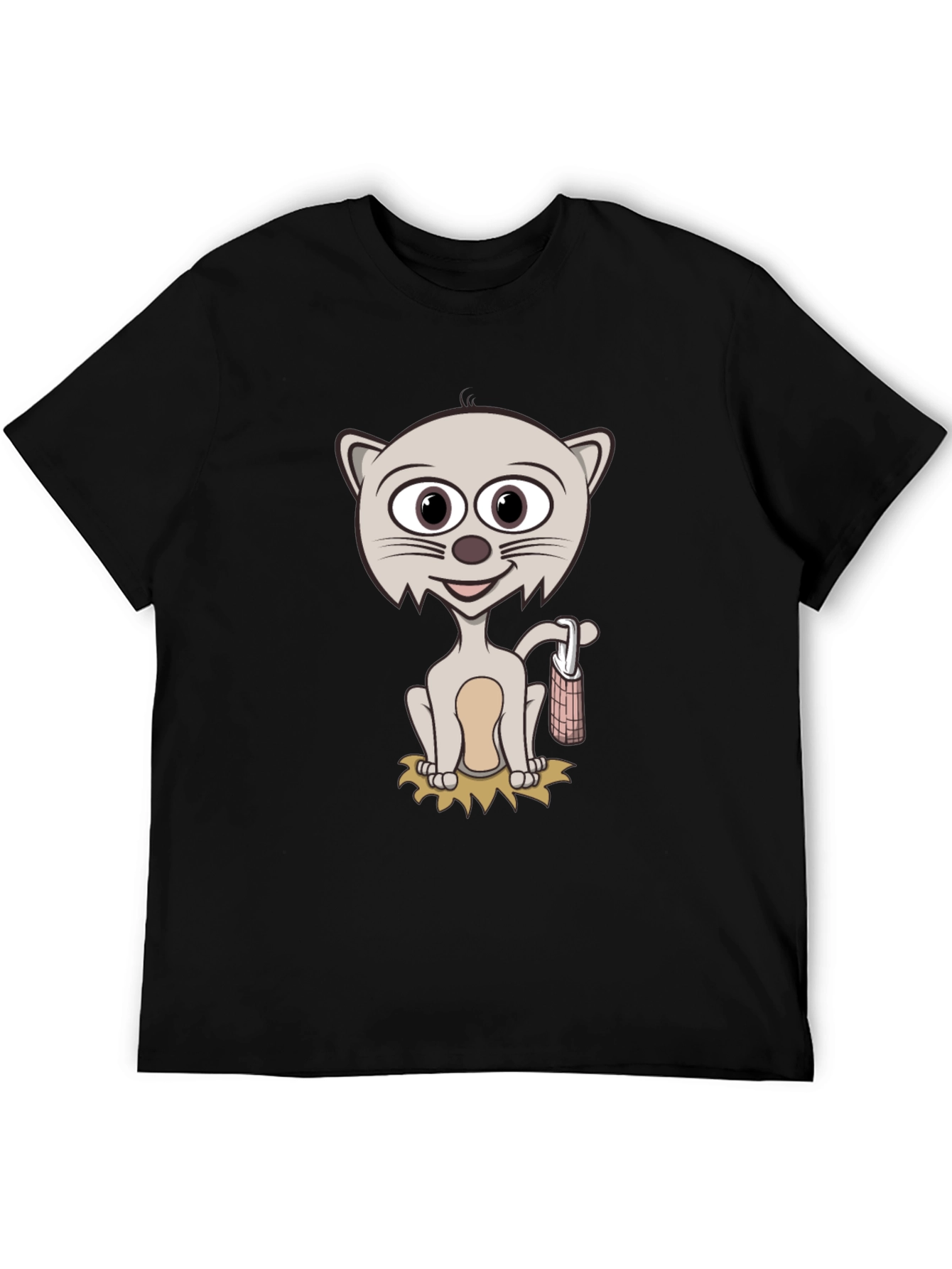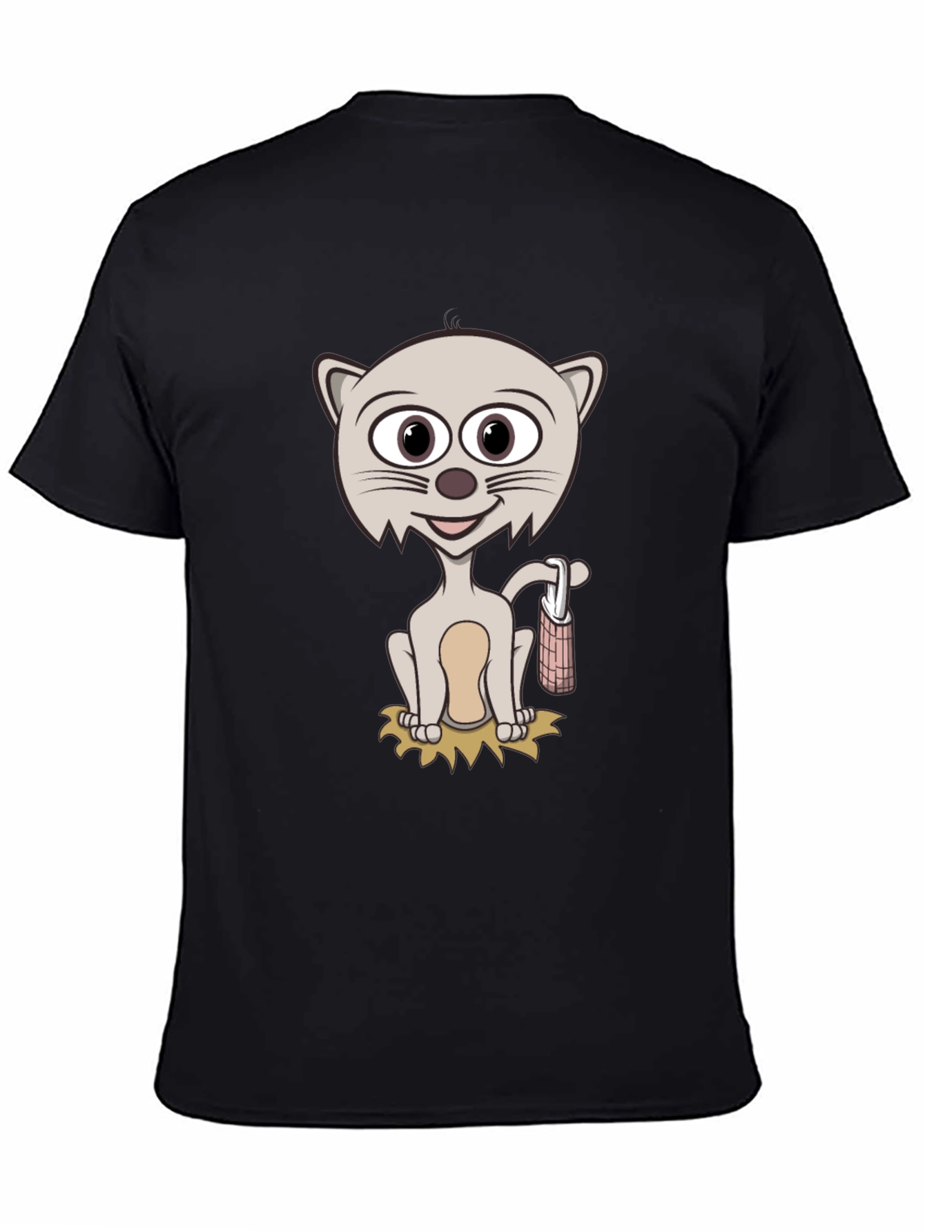 Showcase your fun side with this unique black t-shirt! The tee features a cartoon cat graphic, complete with charming details and a playful pose. Made from a comfortable material, this short-sleeved shirt offers both style and wearability. The design is eye-catching, perfect for casual outings, relaxed weekends, or adding a touch of whimsy to your everyday wardrobe. Pair it with jeans, shorts, or your favorite bottoms for an effortless and distinctive look. A great conversation starter and a must-have for cartoon and cat lovers alike!