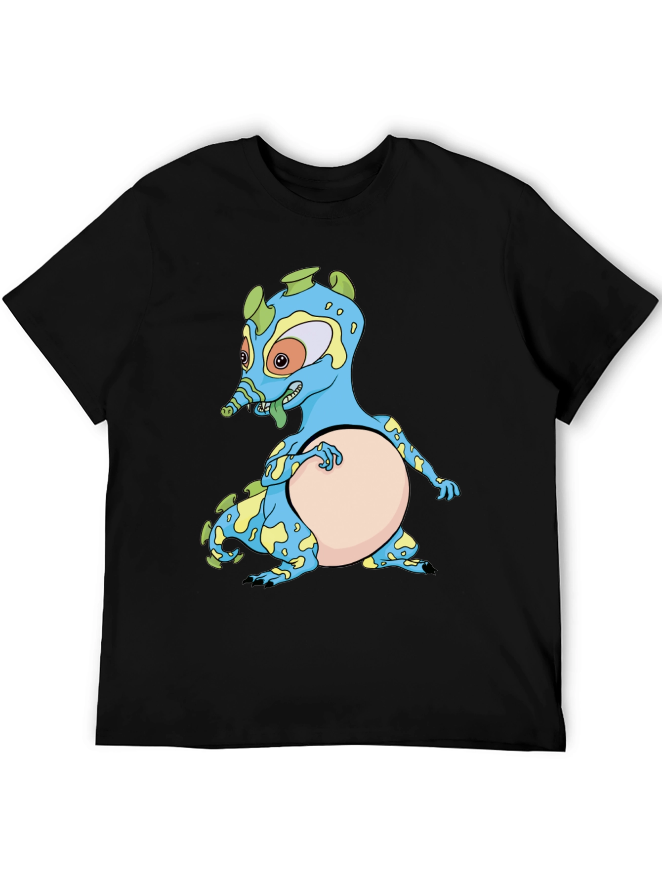 Show off your unique style with this eye-catching black t-shirt. The shirt features a vibrant cartoon design of a quirky, blue alien-like creature with striking yellow accents. This playful graphic adds a fun and edgy touch to the classic tee. Made from a comfortable-looking fabric, this shirt is perfect for casual wear, making a bold statement wherever you go. It's ideal for those who love expressing themselves through distinctive and whimsical fashion. Stand out from the crowd and embrace your individuality with this standout t-shirt.