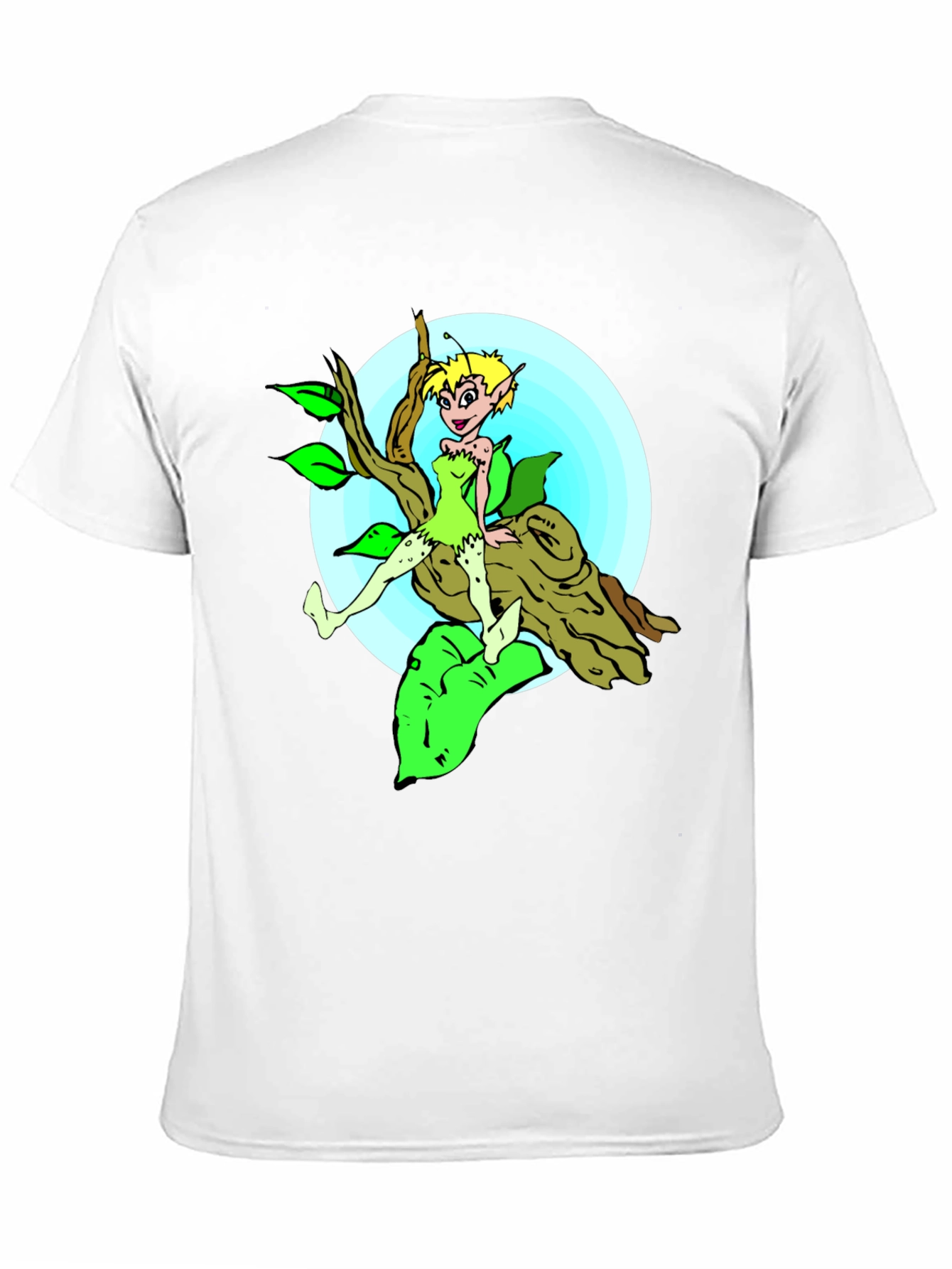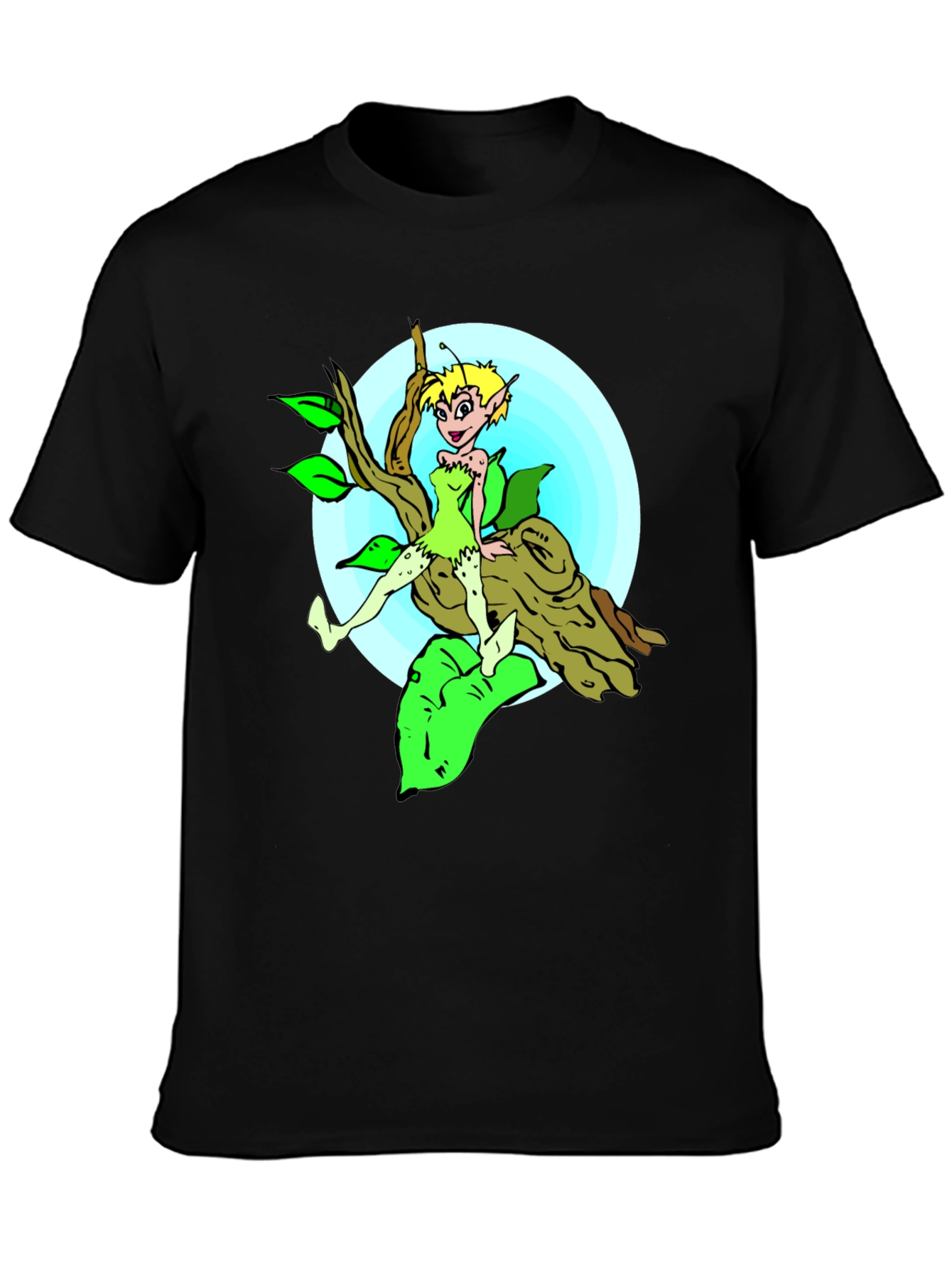 Show off your whimsical side with this unique black graphic tee. The shirt features a colorful cartoon illustration of a fairy perched upon a tree branch against a soft blue backdrop. The vibrant greens, browns, and blues of the design pop against the classic black of the tee. Made from a comfortable, breathable fabric, this t-shirt is perfect for casual wear. It's a fun and playful addition to any wardrobe, ideal for expressing your personality and bringing a touch of fantasy to your everyday style. Great for casual outings, lounging at home, or as a quirky gift!