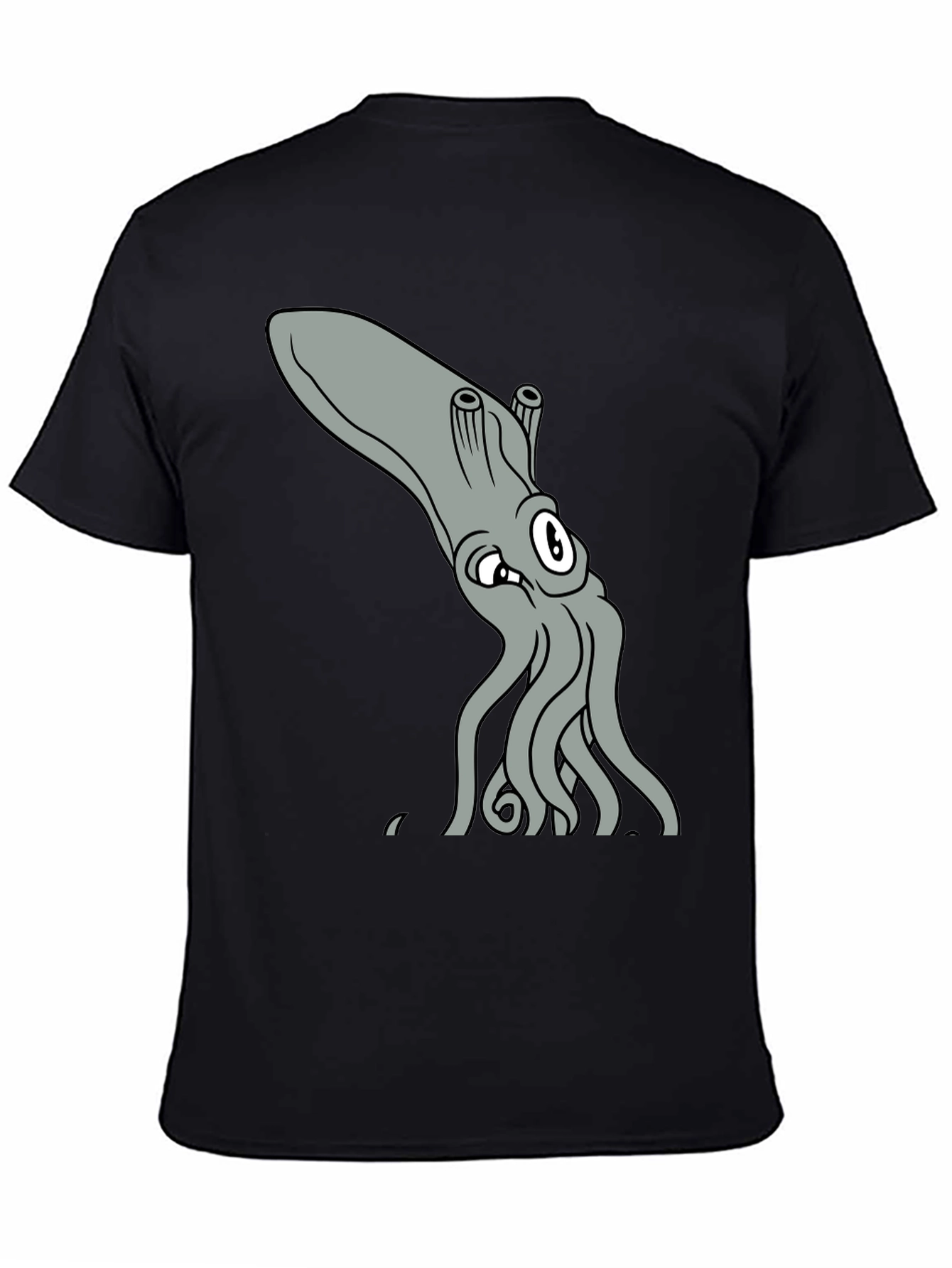Show off your quirky style with this black t-shirt featuring a cartoon squid graphic. The tee showcases a grey, cartoon-style squid with large eyes and multiple tentacles. Made from a soft and comfortable material, this shirt is perfect for everyday wear. Whether you're a fan of marine life, unique designs, or just want a cool casual tee, this shirt is sure to turn heads and spark conversation. Great for casual outings, lounging, or as a fun gift for the squid enthusiast in your life. Get yours today and add a touch of whimsy to your wardrobe!