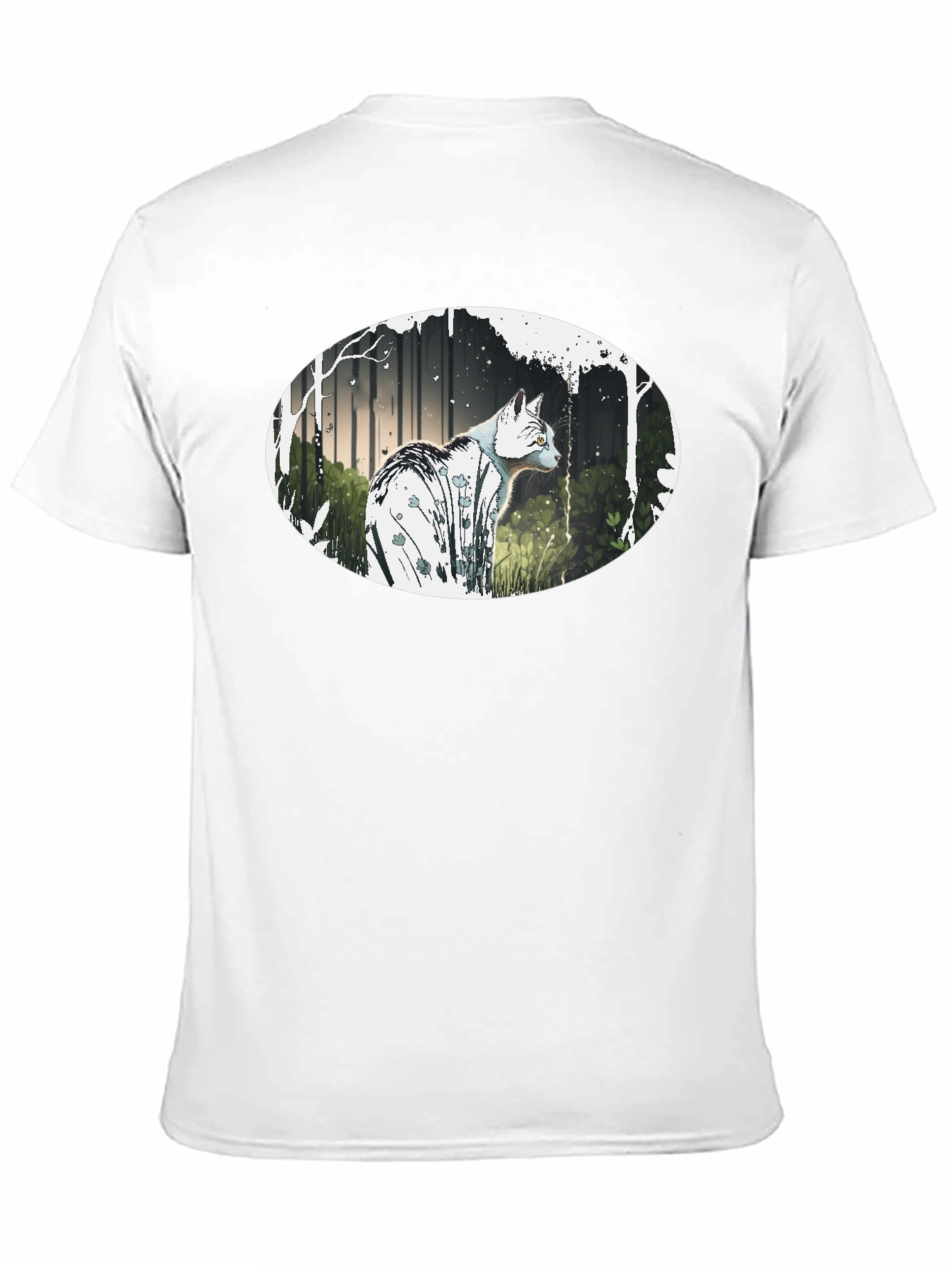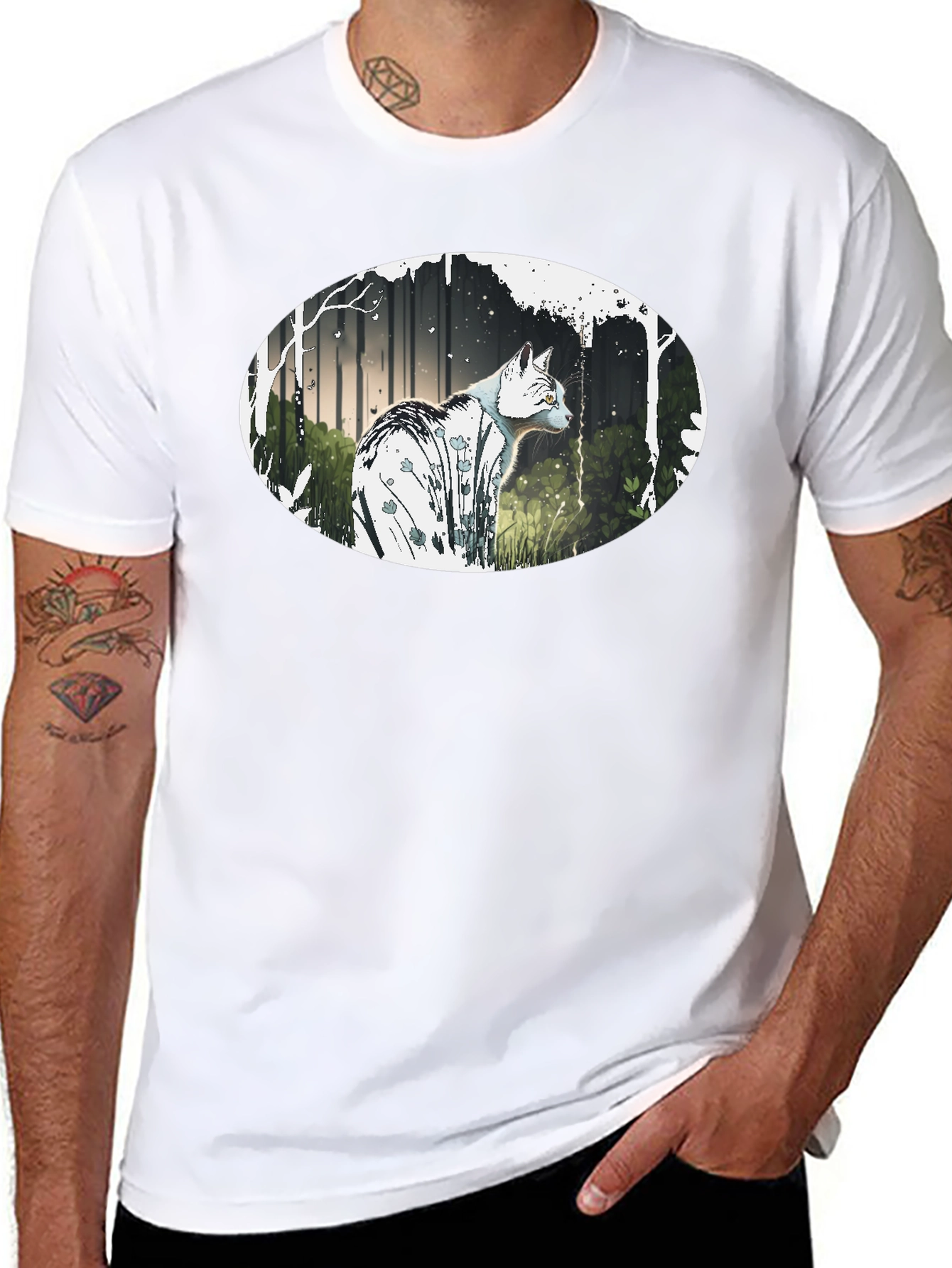 Embrace nature with this striking black t-shirt featuring a unique cat illustration. The design showcases a serene cat amidst a forest scene, creating a captivating visual. Crafted from soft and comfortable fabric, this tee is perfect for everyday wear. The detailed graphic print adds an artistic touch, making it a standout piece in your wardrobe. Ideal for casual outings, nature lovers, or anyone who appreciates distinctive apparel. Show off your unique style with this eye-catching cat and forest themed t-shirt. Experience both comfort and artistry with this wearable masterpiece.