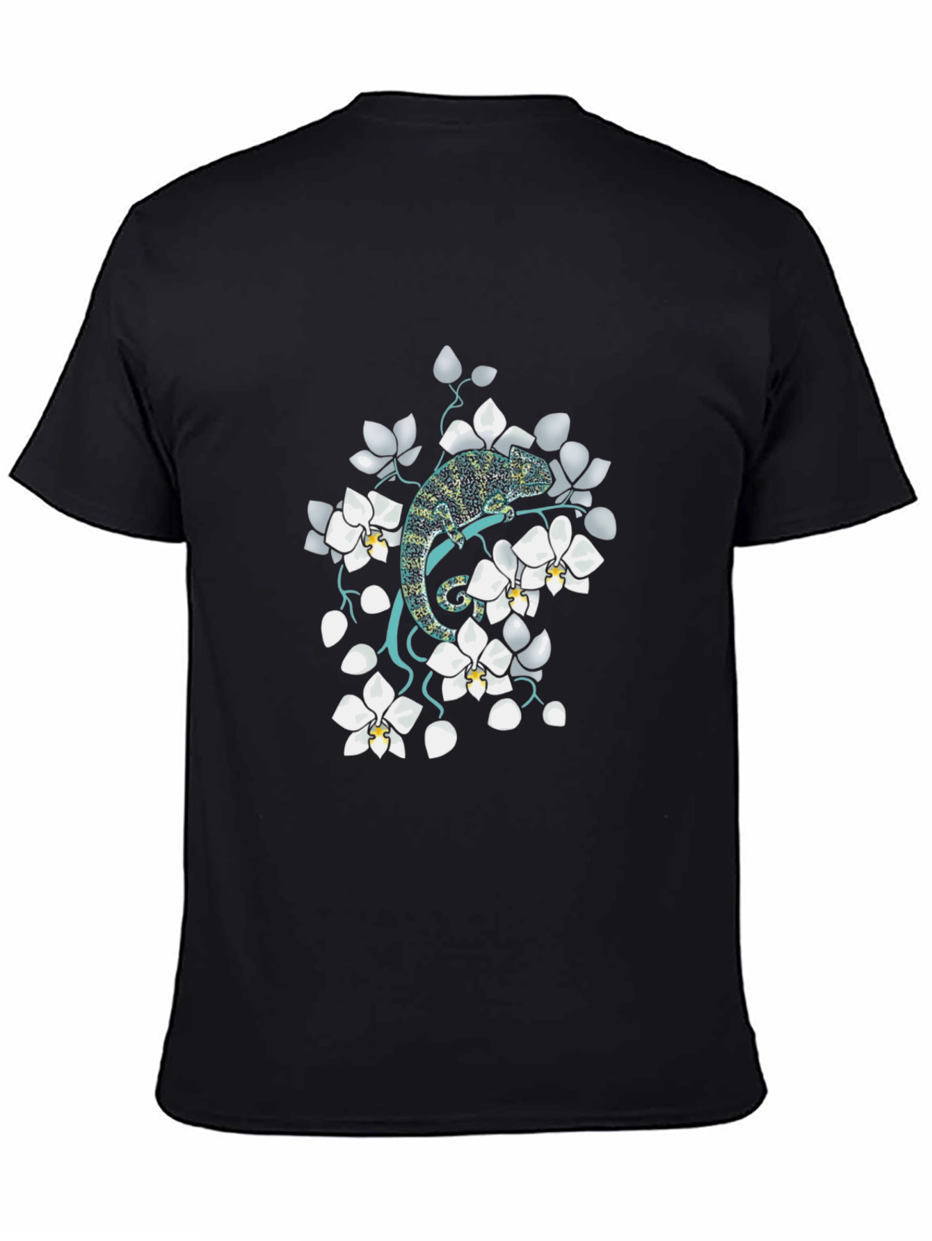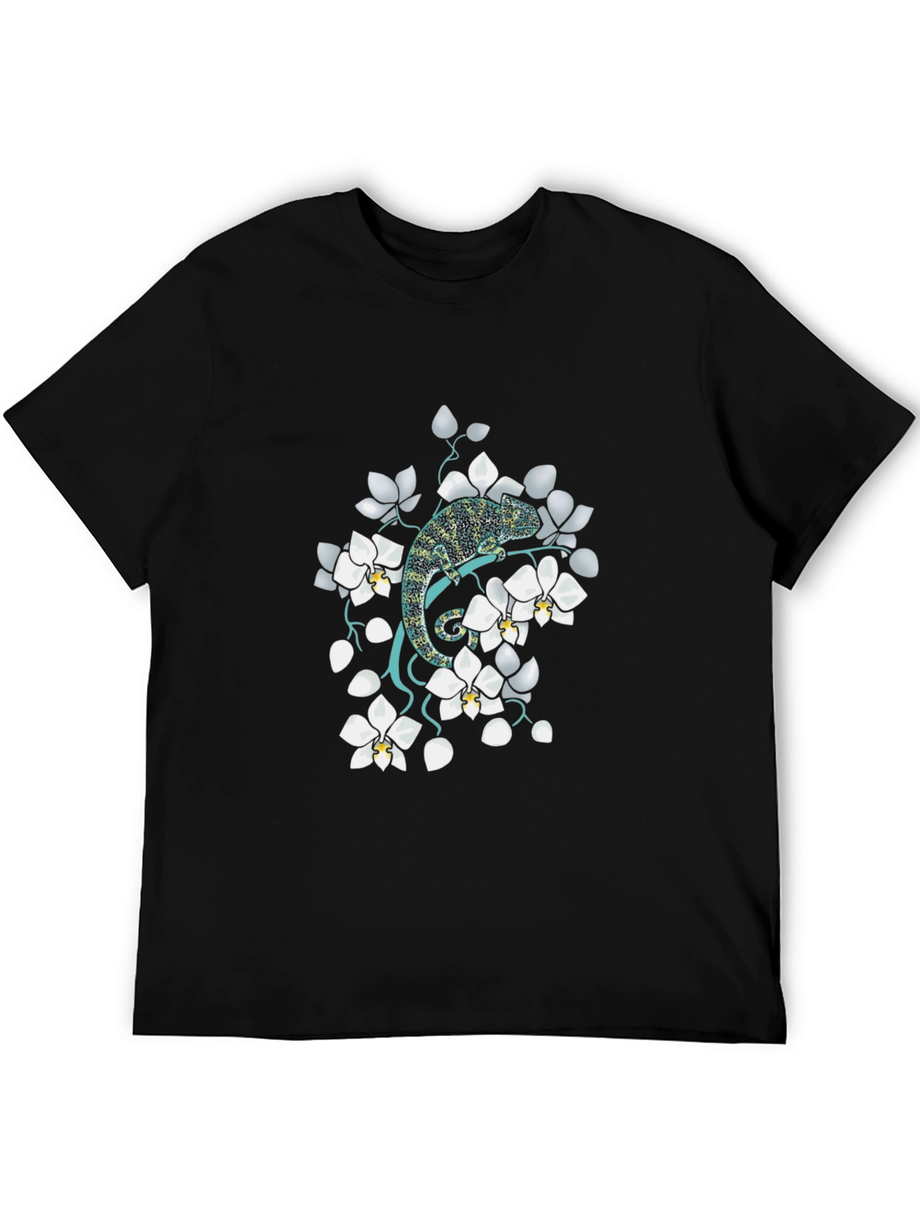 Showcase your unique style with this eye-catching black t-shirt featuring a vibrant chameleon graphic surrounded by delicate white flowers. The eye-catching design pops against the dark fabric, making it a versatile piece for casual wear. Crafted from comfortable materials, this tee offers a relaxed fit for all-day comfort. Perfect for adding a touch of personality to any outfit, wear it while hanging out with friends, attending a casual event, or simply lounging around. It's a great conversation starter and a must-have addition to your wardrobe. Get yours today!