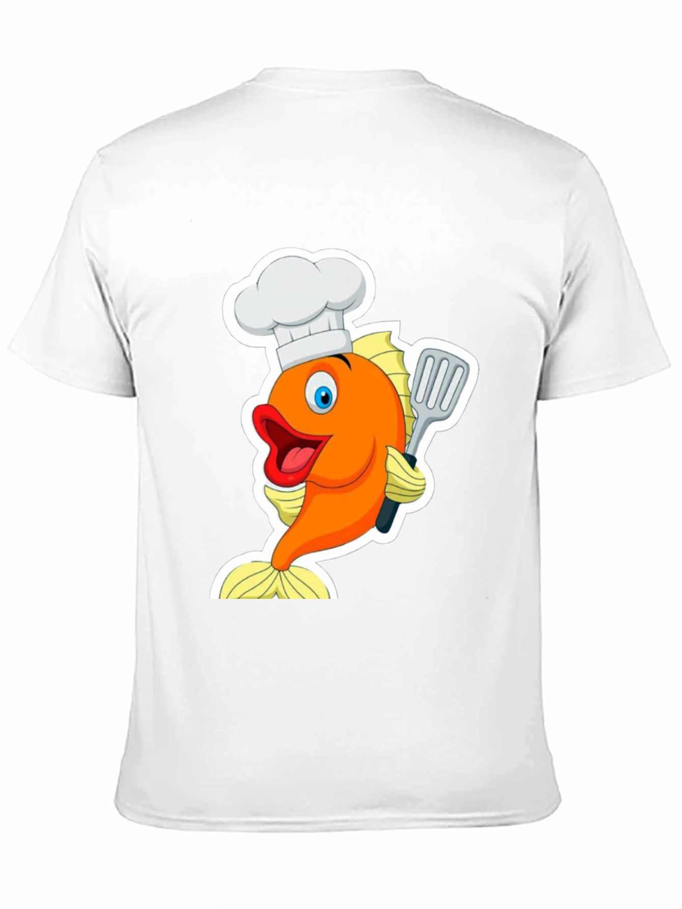 This fun black t-shirt features a cartoon graphic of a happy orange fish wearing a chef's hat and holding a spatula. The whimsical design is printed prominently on the front, making it a great conversation starter. The shirt appears to be made of a comfortable material, perfect for everyday wear. Ideal for those who love cooking, fishing, or simply enjoy quirky and eye-catching apparel. Stand out with this unique and playful t-shirt that combines culinary charm with cartoon fun!