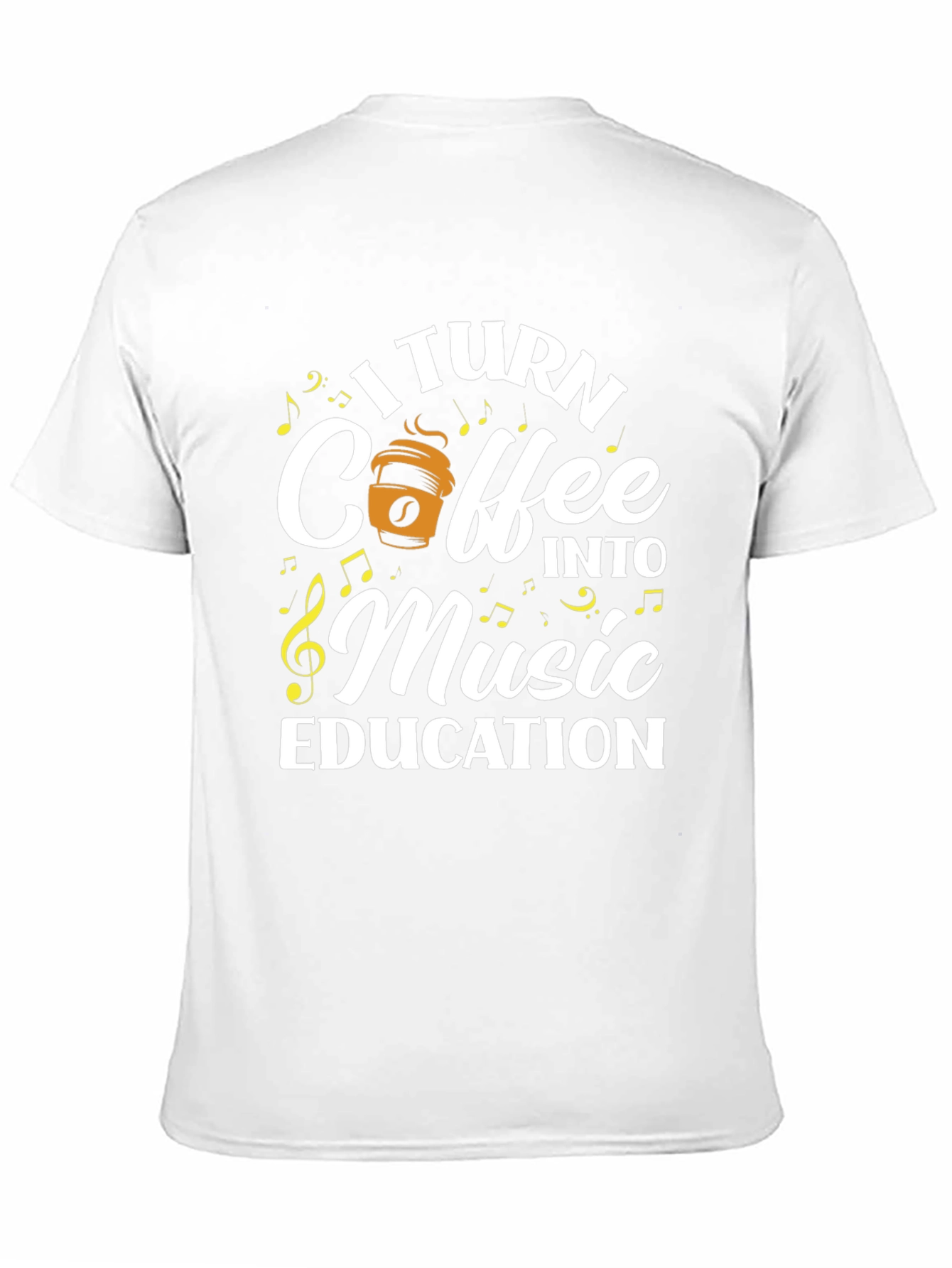 This black t-shirt features a playful and creative design with the statement "I TURN Coffee INTO Music EDUCATION." The graphic incorporates musical notes and a coffee cup, suggesting a fun and relatable concept, maybe for educators or coffee lovers. Made from a soft-looking fabric, this tee offers both comfort and style. It's perfect for casual wear, music teachers, students, or anyone who appreciates a good cup of coffee and the power of music. Make a statement with this quirky and expressive t-shirt, perfect for expressing your passion for music and coffee.