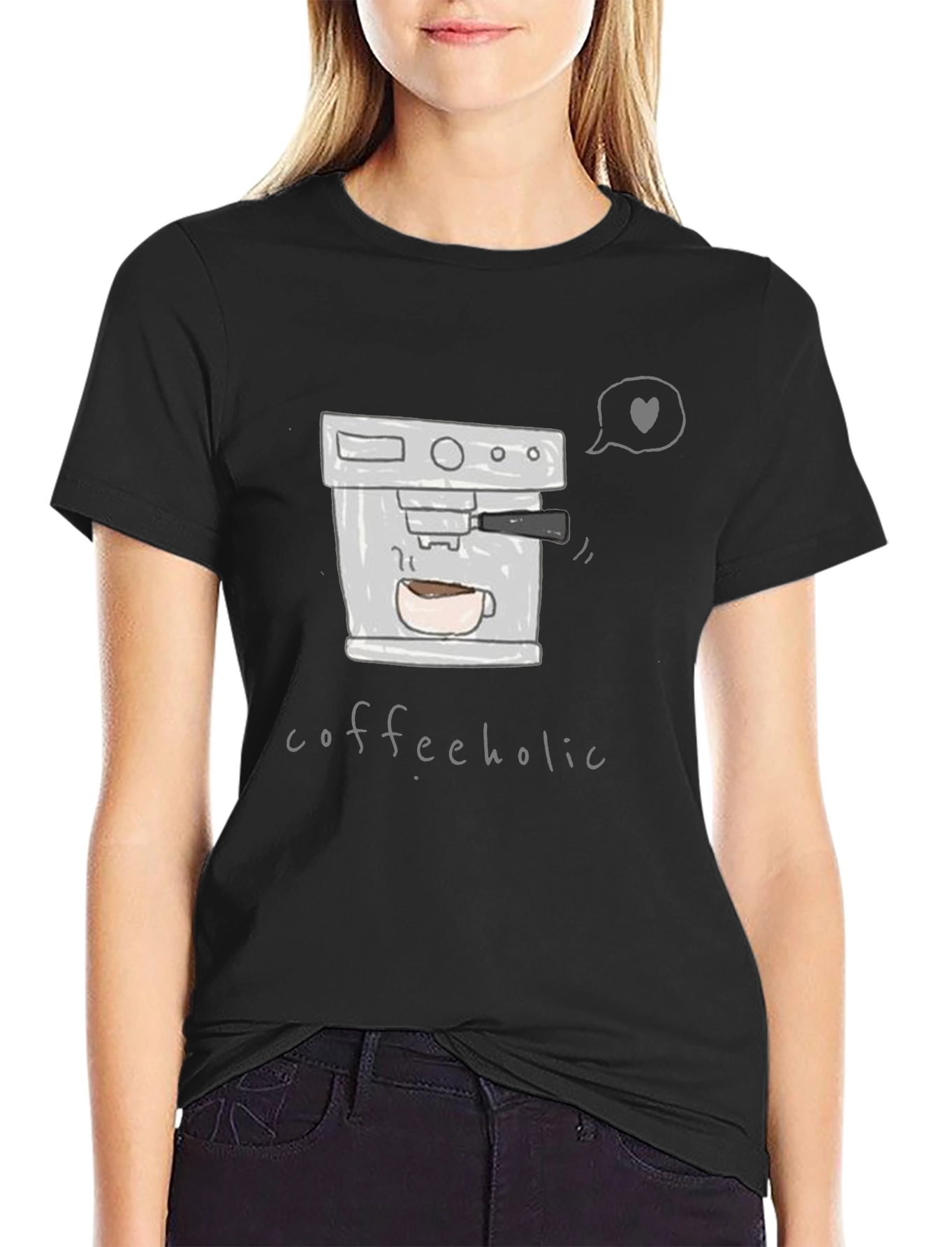 Express your love for coffee with this unique black t-shirt. Featuring a creative graphic print of a coffee machine, a coffee cup and the word "coffeeholic", this tee is perfect for coffee enthusiasts. The design is simple yet eye-catching, making it a standout piece in your casual wardrobe. Made from comfortable materials, this t-shirt offers a relaxed fit for everyday wear. Whether you're grabbing a cup of joe or lounging at home, this shirt lets you showcase your caffeine addiction in style. A must-have for any coffee lover's collection.