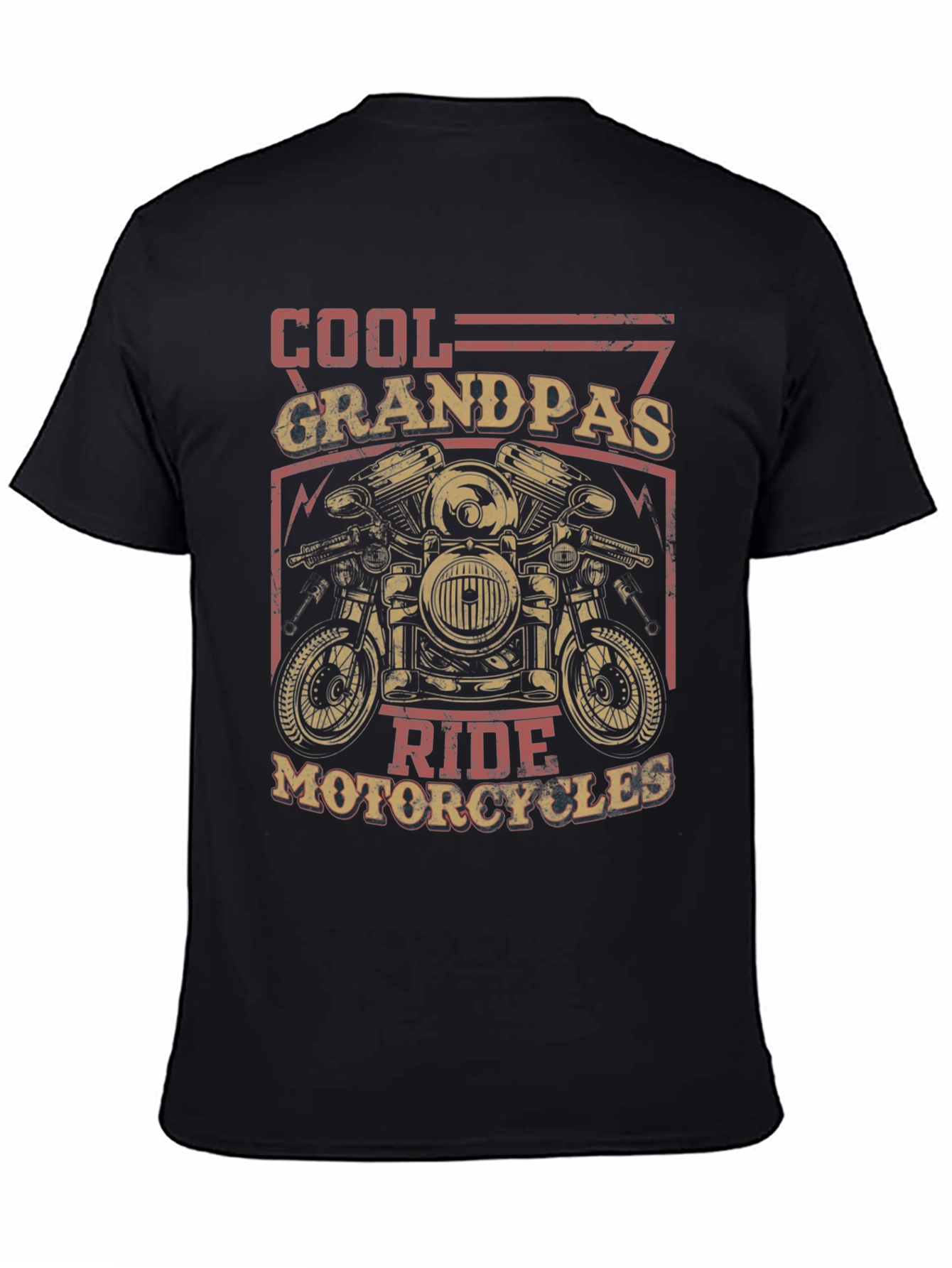 Show off your cool grandpa style with this unique graphic t-shirt. This black tee features a vintage-inspired design with the phrase "Cool Grandpas Ride Motorcycles" emblazoned across the chest. A detailed motorcycle graphic adds to the vintage aesthetic. Made from a comfortable fabric, this tee is perfect for casual wear or a day out on the road. Express your love for motorcycles and your status as a cool grandpa with this standout t-shirt. Perfect for gifting to grandfathers with a passion for riding.