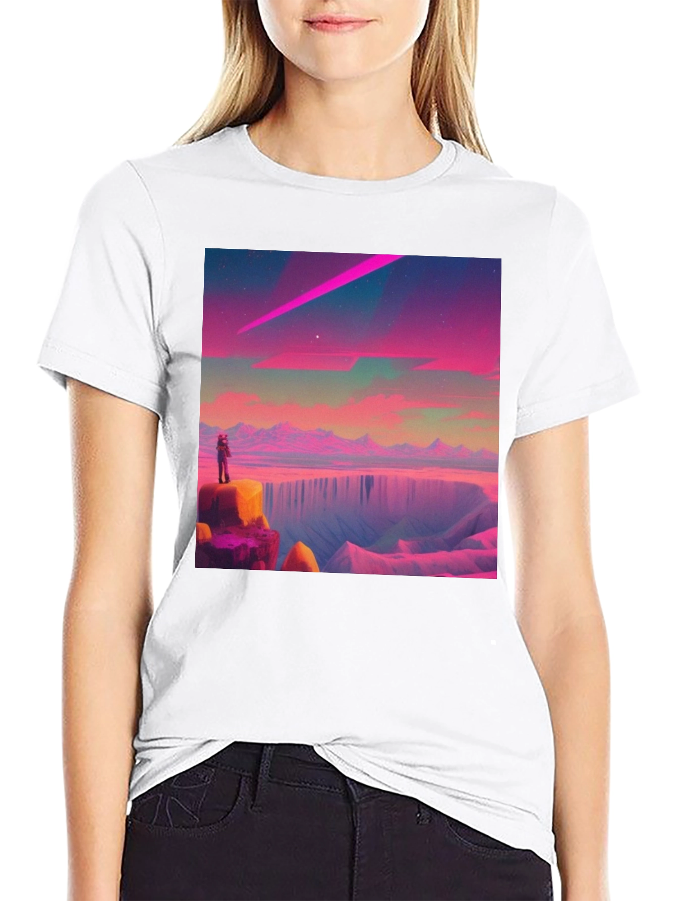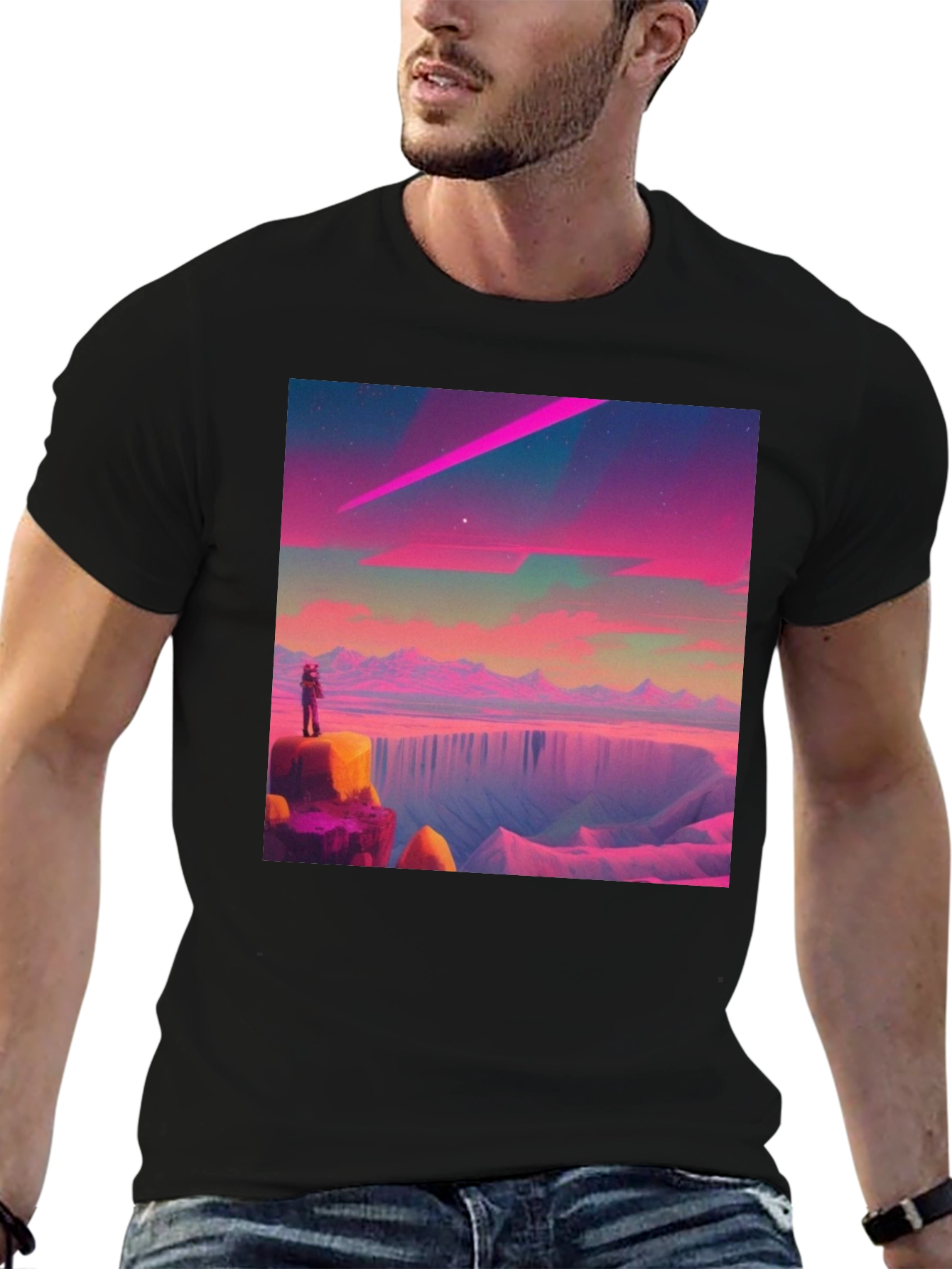 Elevate your style with this unique black t-shirt featuring a vibrant graphic design. The eye-catching print showcases a surreal, dreamlike landscape with a lone figure gazing upon a horizon of pink mountains and a striking purple comet. Made from comfortable, breathable cotton, this tee offers a relaxed fit perfect for everyday wear. Stand out from the crowd and express your individuality with this statement piece, ideal for casual outings, concerts, or simply lounging in style. Add a touch of artistic flair to your wardrobe with this must-have graphic tee.