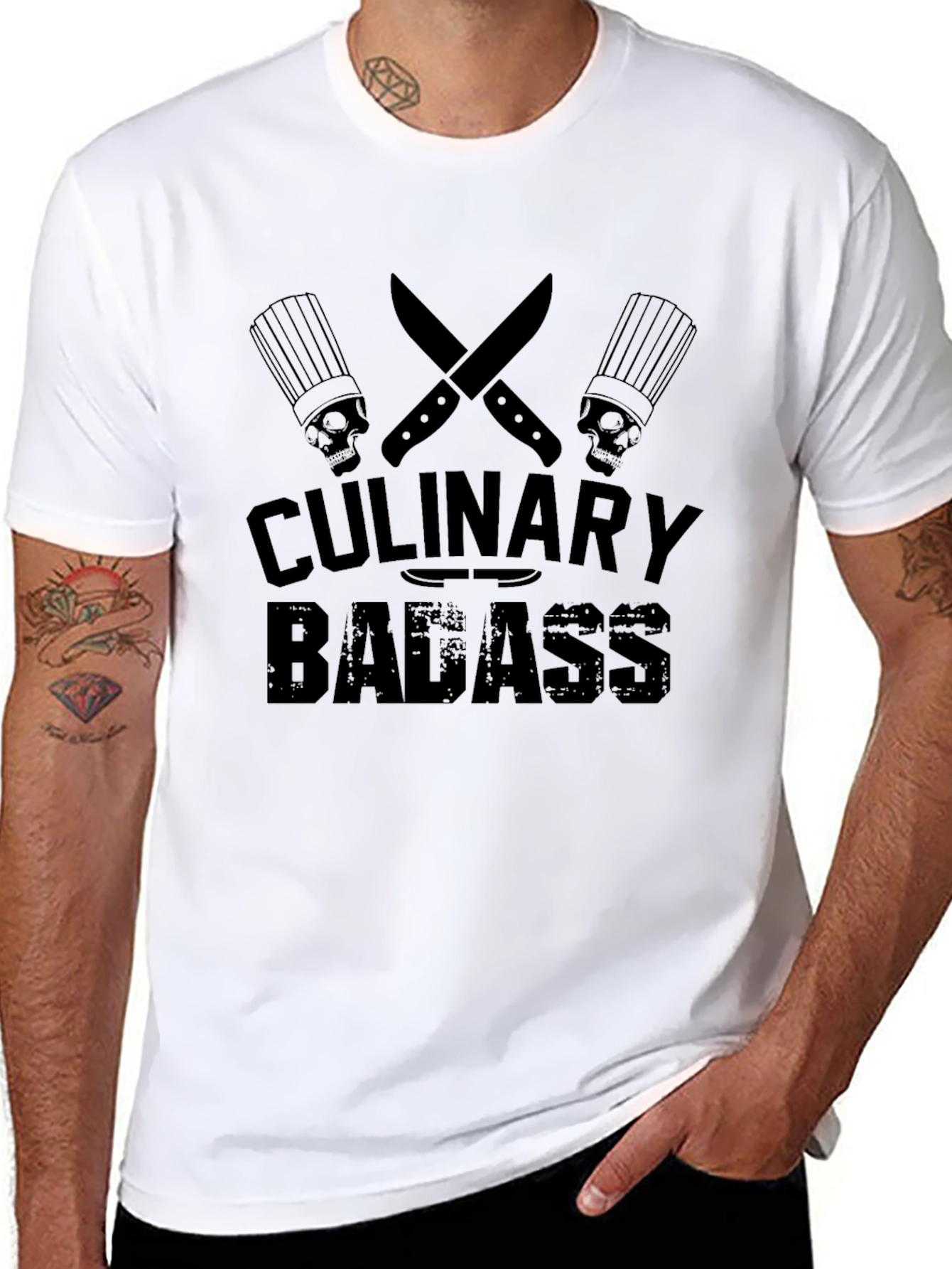 Show off your culinary skills with this badass black t-shirt. This edgy shirt features a bold graphic design with crossed knives, chef hats with skulls, and the words "Culinary Badass" in a distressed font. The design is perfect for chefs, cooks, or anyone who loves to dominate in the kitchen. Made from comfortable, breathable fabric, this short-sleeved tee is perfect for everyday wear or as a statement piece at your next cooking event. It’s a unique gift for the culinary professional in your life. Rock this shirt and let everyone know you're a culinary force to be reckoned with.