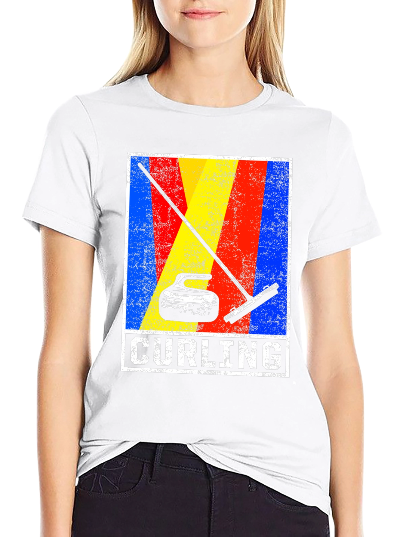 Show off your love for the ice sport with this stylish curling t-shirt! The design features a curling stone and broom, set against a vibrant backdrop of blue, yellow, and red stripes. The word 'Curling' is printed below in bold, distressed white letters. The shirt is made from a comfortable, black cotton blend, perfect for casual wear or showing support at your next curling match. A great gift for curlers and winter sports enthusiasts. Comfortable fit for both men and women.