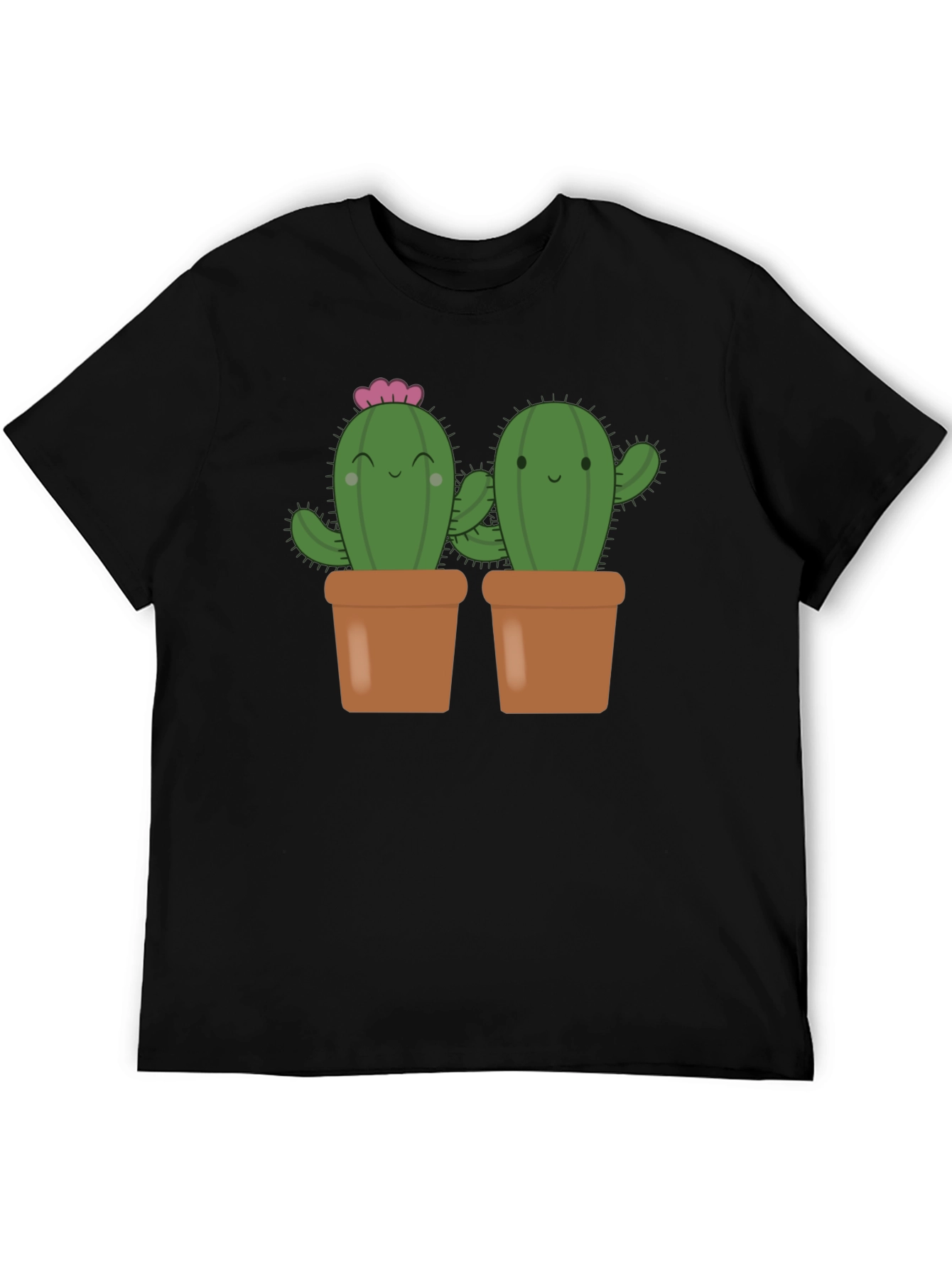 Add a touch of whimsy to your wardrobe with this charming black t-shirt featuring a delightful design. The shirt showcases two adorable cartoon cacti, each planted in a cute brown pot. One cactus is adorned with a lovely pink flower. The graphic design is vibrant and eye-catching, making this t-shirt a fun and playful choice for casual wear. Made from a comfortable and breathable fabric, this t-shirt is perfect for everyday wear, whether you're running errands, hanging out with friends, or simply relaxing at home. This unique and stylish tee is sure to bring a smile to your face and brighten up any outfit. Embrace the fun side of fashion with this must-have cactus t-shirt!