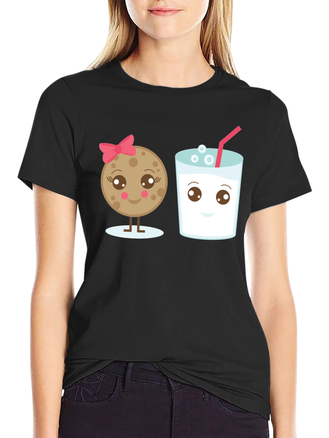 This adorable black t-shirt features a playful graphic of a cute cookie with a pink bow and a glass of milk, both sporting charming faces. Made from what appears to be a soft, comfortable fabric, this tee is perfect for casual wear. The delightful design adds a touch of whimsy to any outfit, making it an excellent choice for those who love fun and unique apparel. Wear it to school, the park, or while lounging at home – this t-shirt is sure to bring a smile to your face and those around you. A great gift idea for the young at heart! This t-shirt is a fun and stylish addition to any wardrobe.