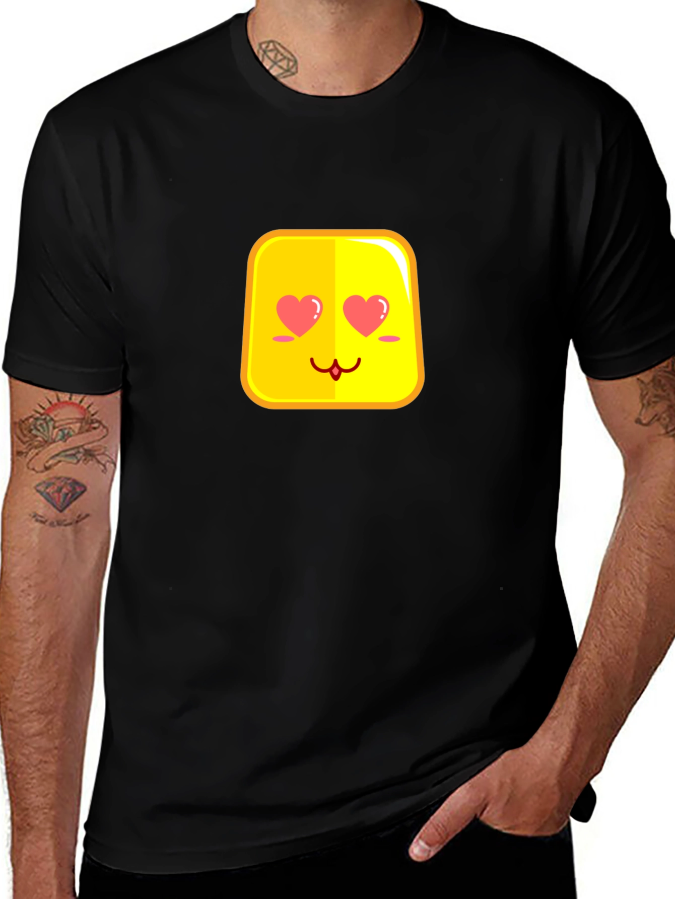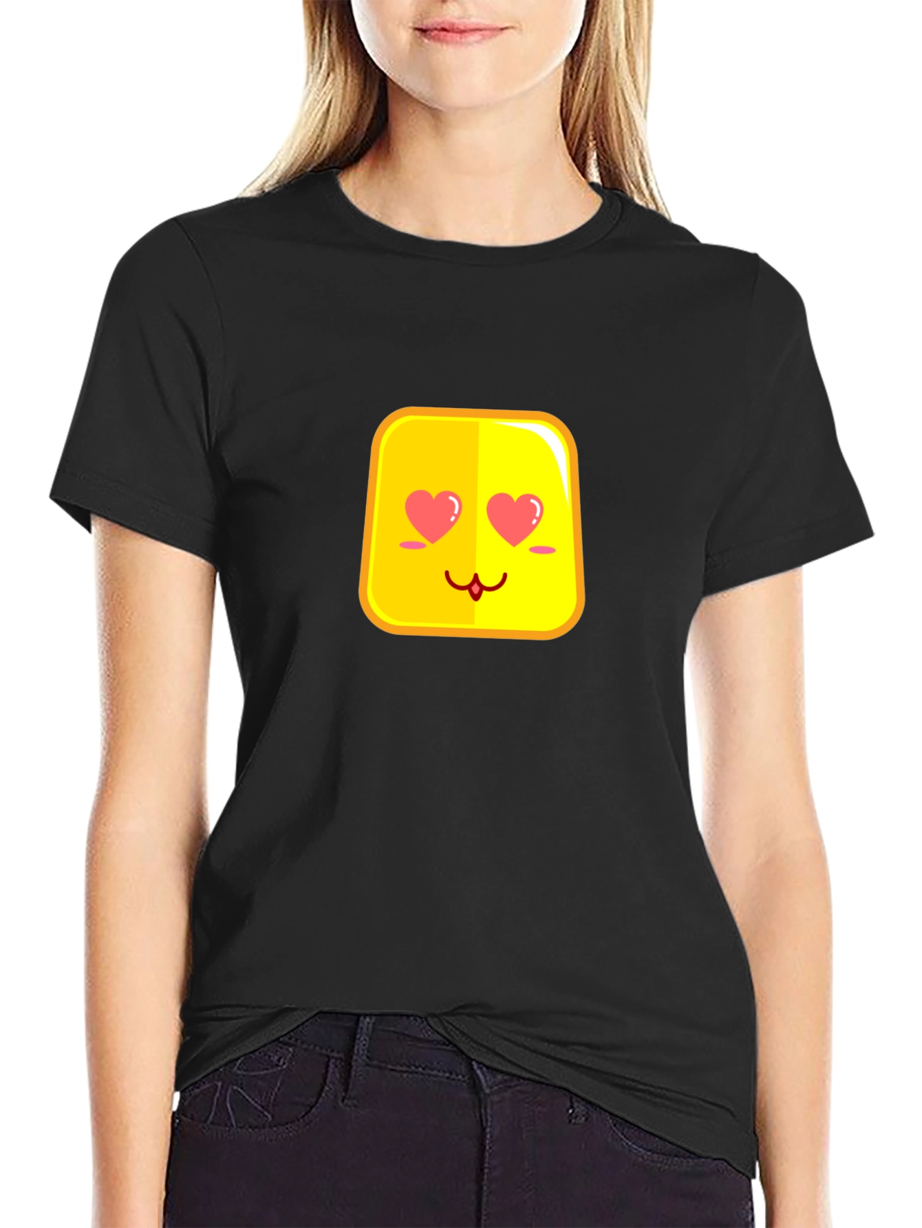 Show off your adorable side with this black T-shirt featuring a cute yellow emoji with heart eyes. Made from a soft, comfortable fabric, this tee is perfect for casual wear. The playful design is sure to bring smiles and spread love wherever you go. Ideal for expressing your fun-loving personality, this T-shirt is a great addition to any wardrobe. Wear it to casual outings, parties, or simply while relaxing at home. It's a charming and stylish way to showcase your personality.