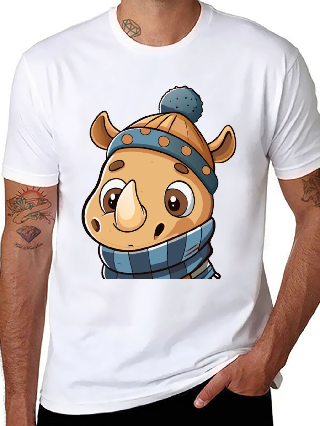 Stay warm and stylish with this adorable rhino t-shirt! Featuring a charming cartoon rhino wearing a cozy winter hat and scarf, this shirt is perfect for animal lovers and winter enthusiasts alike. The design is printed on a soft, black t-shirt, making it a comfortable and versatile addition to your wardrobe. Show off your playful side with this unique and eye-catching t-shirt. Ideal for casual wear, holiday gatherings, or as a fun gift for friends and family. Get yours today and embrace the winter season in style!