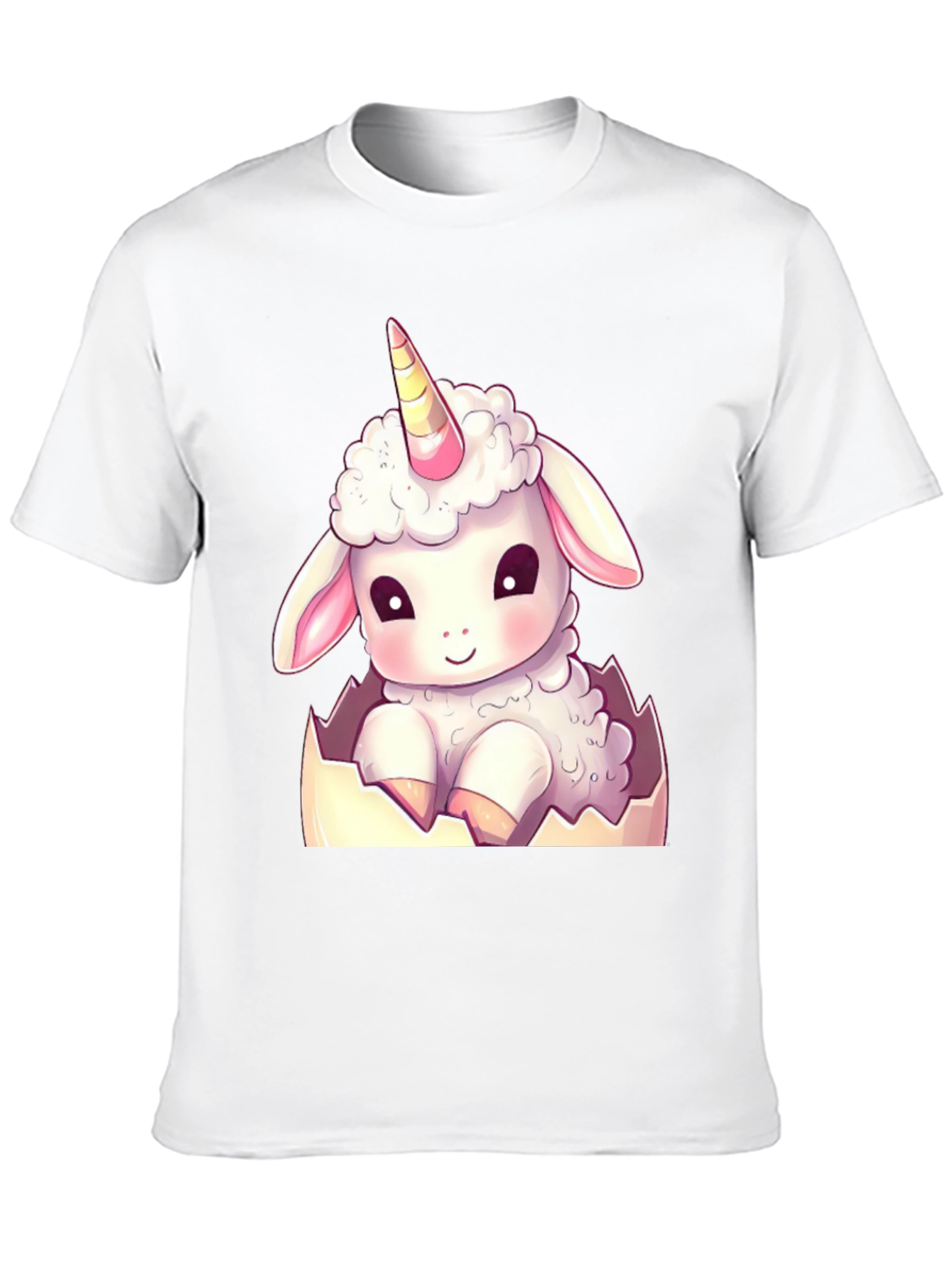This charming black t-shirt features a delightful graphic print of a unicorn sheep hatching from an eggshell. The adorable design showcases a fluffy white sheep with a pastel-colored unicorn horn, nestled snugly inside a cracked egg. The print is vibrant and eye-catching, making it a fun and playful addition to any wardrobe. Crafted from a soft and comfortable fabric, this t-shirt is perfect for everyday wear. Ideal for animal lovers and those who appreciate whimsical designs, this tee is sure to bring a smile to anyone's face. Dress it up with a jacket or keep it casual with jeans - it's versatile for any occasion.