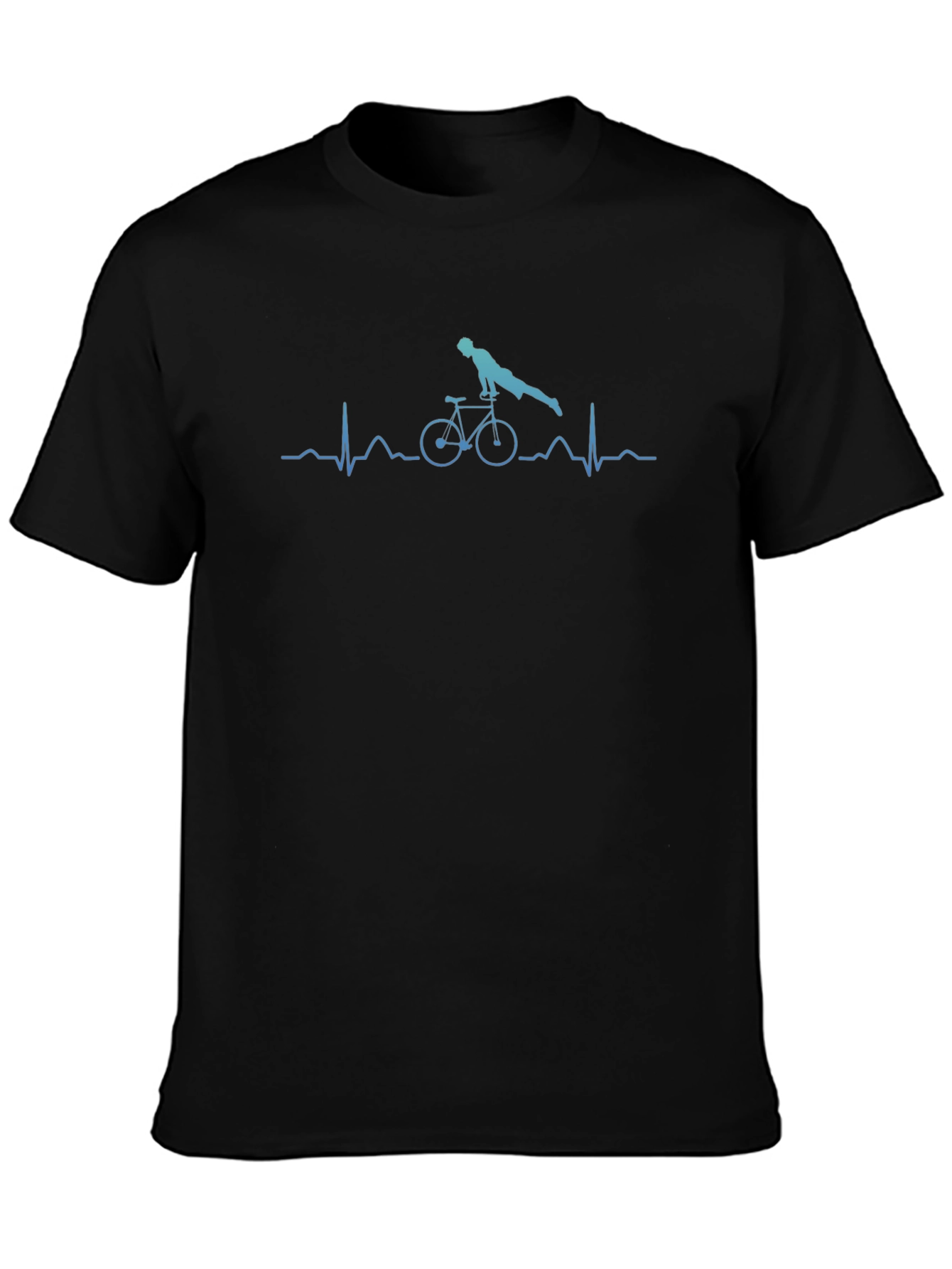 Show off your passion for cycling with this unique graphic t-shirt. The design features a cyclist balanced on a bike, seamlessly integrated into a heartbeat rhythm line. The shirt is crafted from a soft, comfortable fabric, perfect for everyday wear or hitting the trails. The distinctive print makes it a standout piece, great for casual outings or cycling events. Make a statement about your love for biking with this eye-catching t-shirt. It's an ideal gift for cycling enthusiasts and anyone with a sense of style.