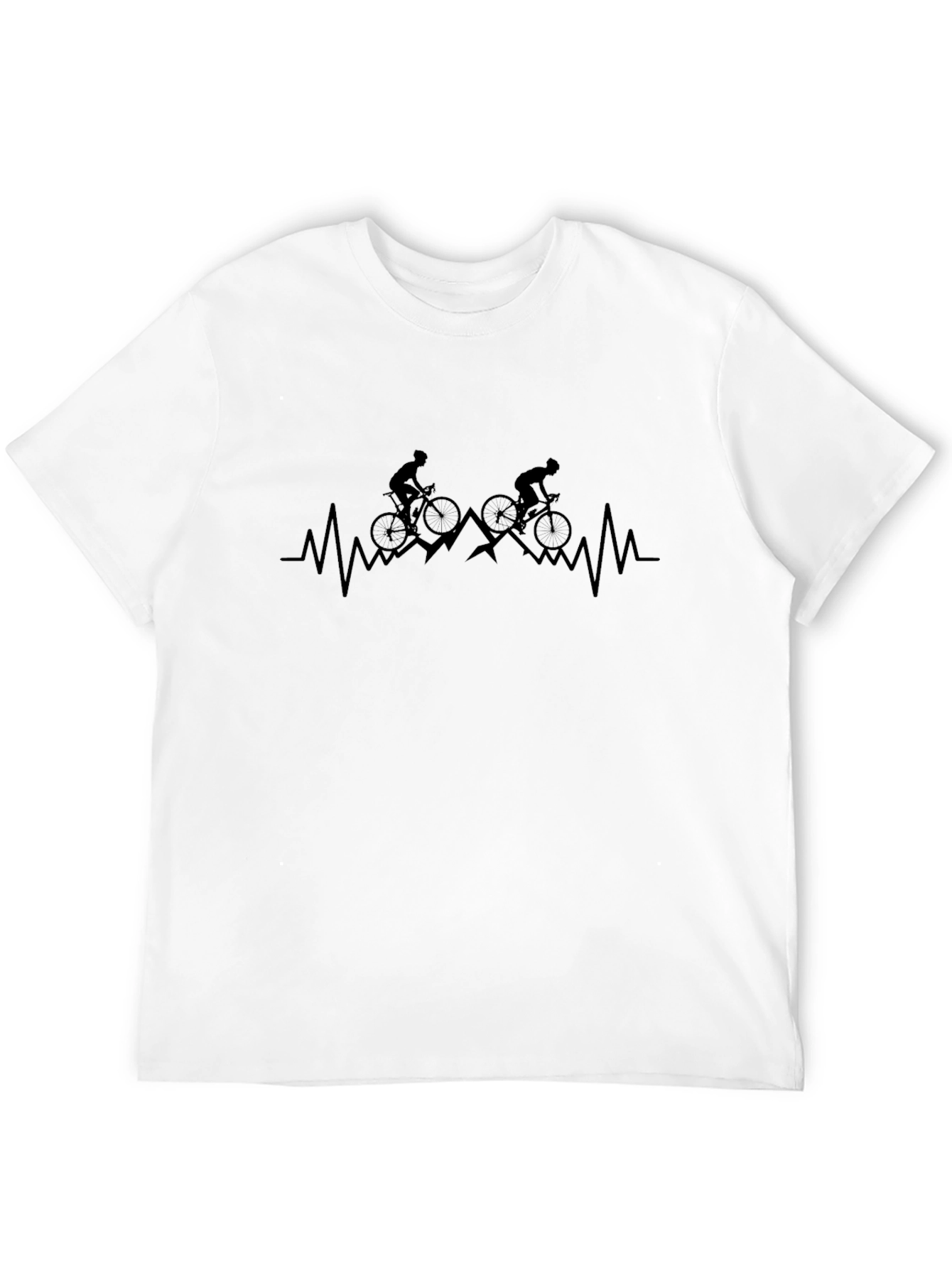 This stylish black t-shirt features a unique design that combines a heartbeat lifeline with mountain biking silhouettes. The graphic showcases two cyclists riding across mountain peaks, cleverly integrated into the heart rhythm pattern. Made from a soft, comfortable fabric, this tee is perfect for everyday wear or a casual bike ride. Show off your passion for cycling and outdoor adventures with this eye-catching t-shirt. It's an ideal gift for cycling enthusiasts, mountain bikers, or anyone who loves the thrill of the ride. Whether you're hitting the trails or just relaxing, this shirt is a great way to express your love for the sport.