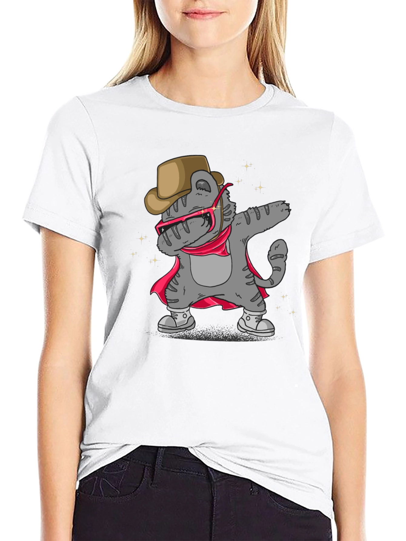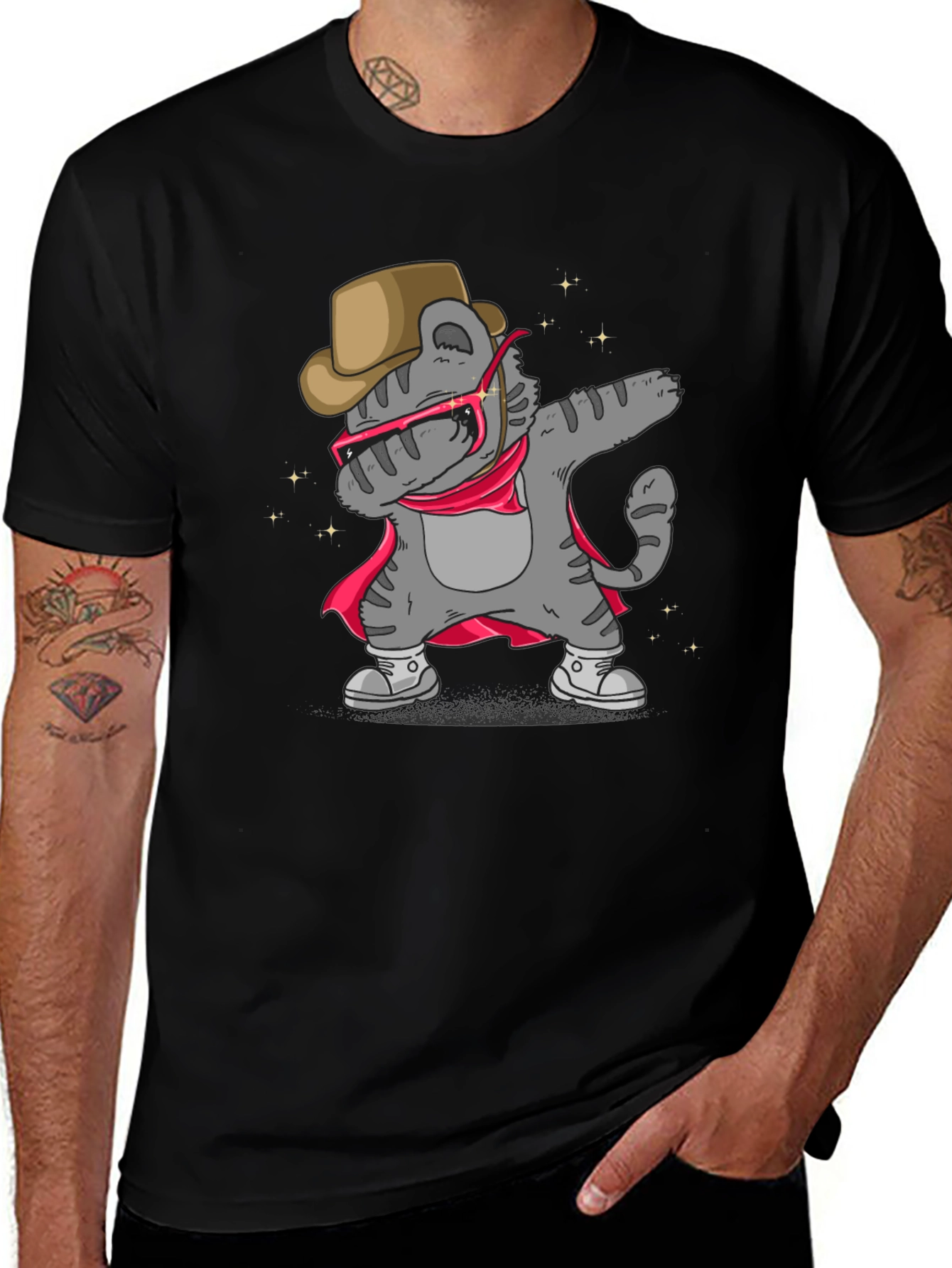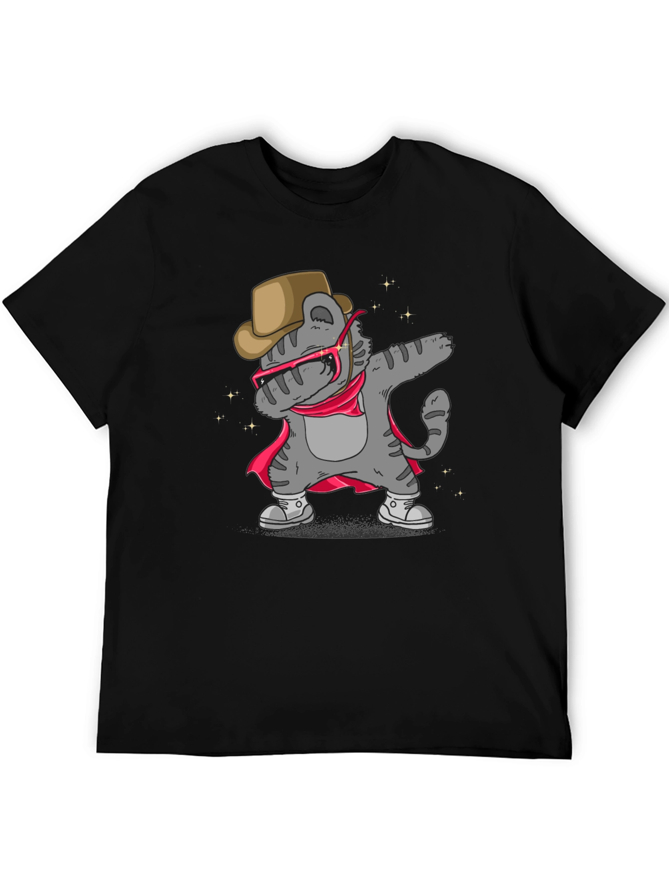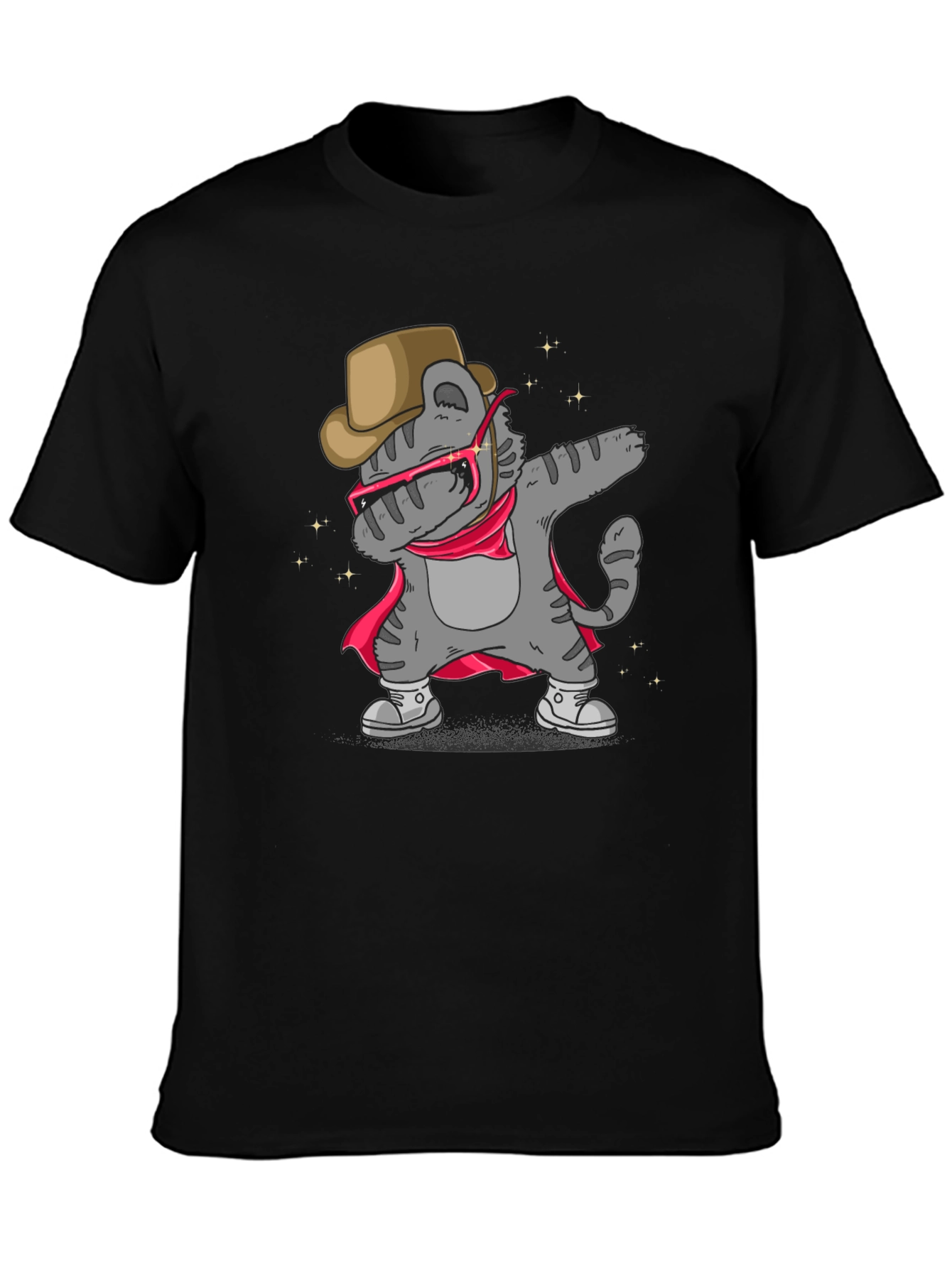 Show off your fun side with this eye-catching T-shirt! This black tee features a cool graphic of a grey tabby cat, dressed as a cowboy with a hat, red scarf, and matching red-rimmed glasses. The cat is striking a 'dab' pose, perfect for anyone who loves cats, humor, or trendy designs. Ideal for casual wear, parties, or as a unique gift, this T-shirt will definitely grab attention and spark conversations. Grab yours now and let the world know you're feline good!