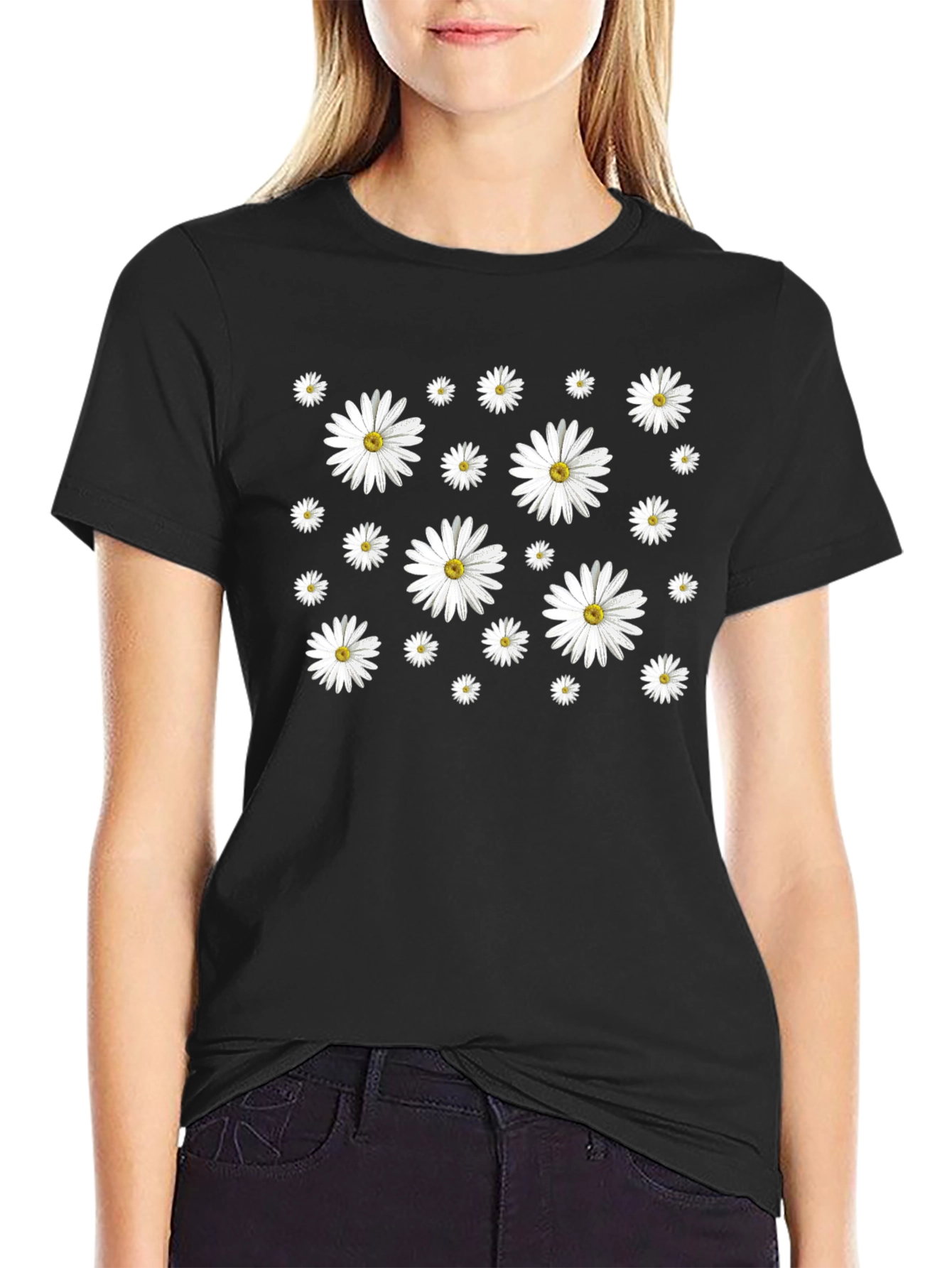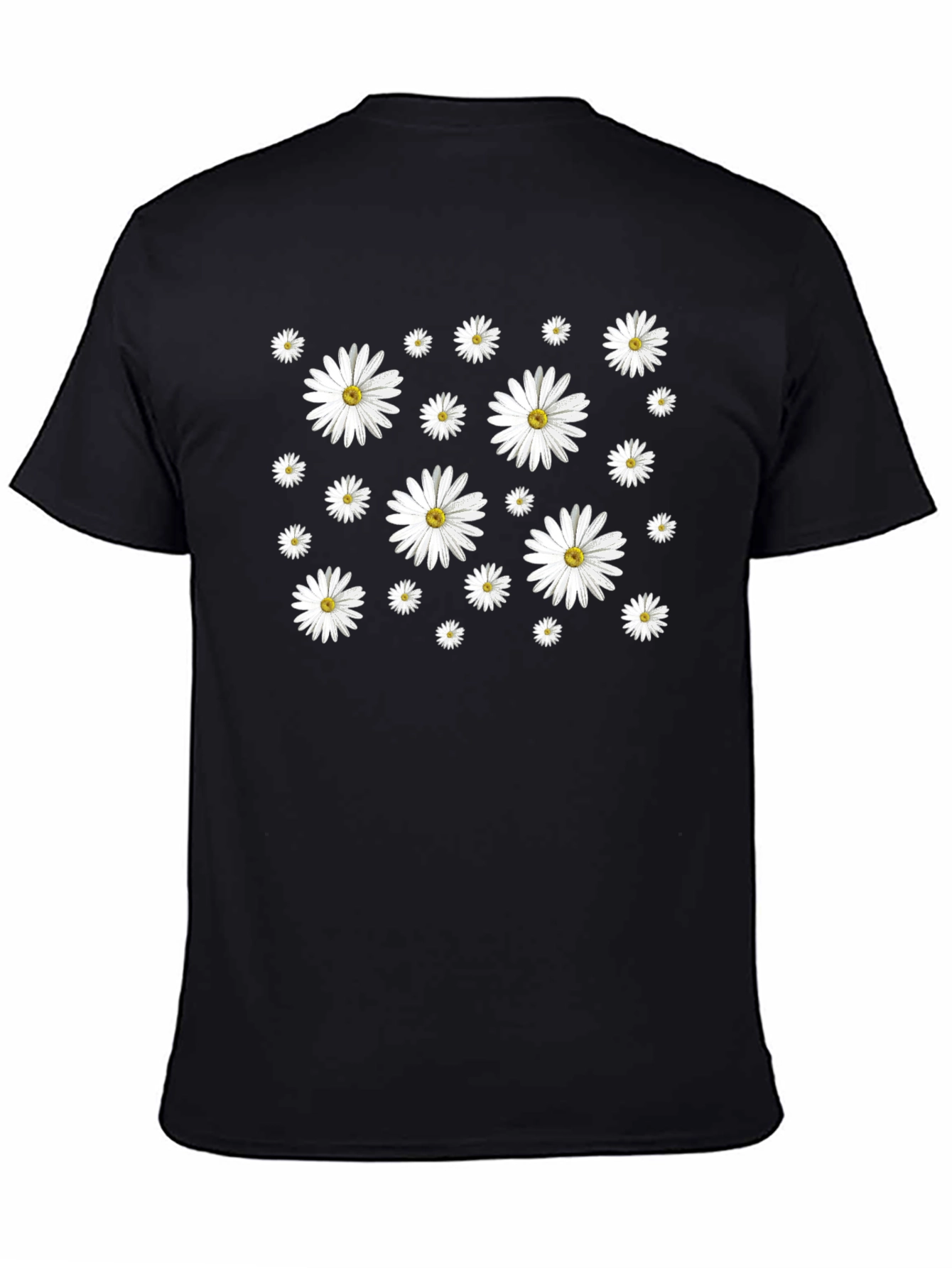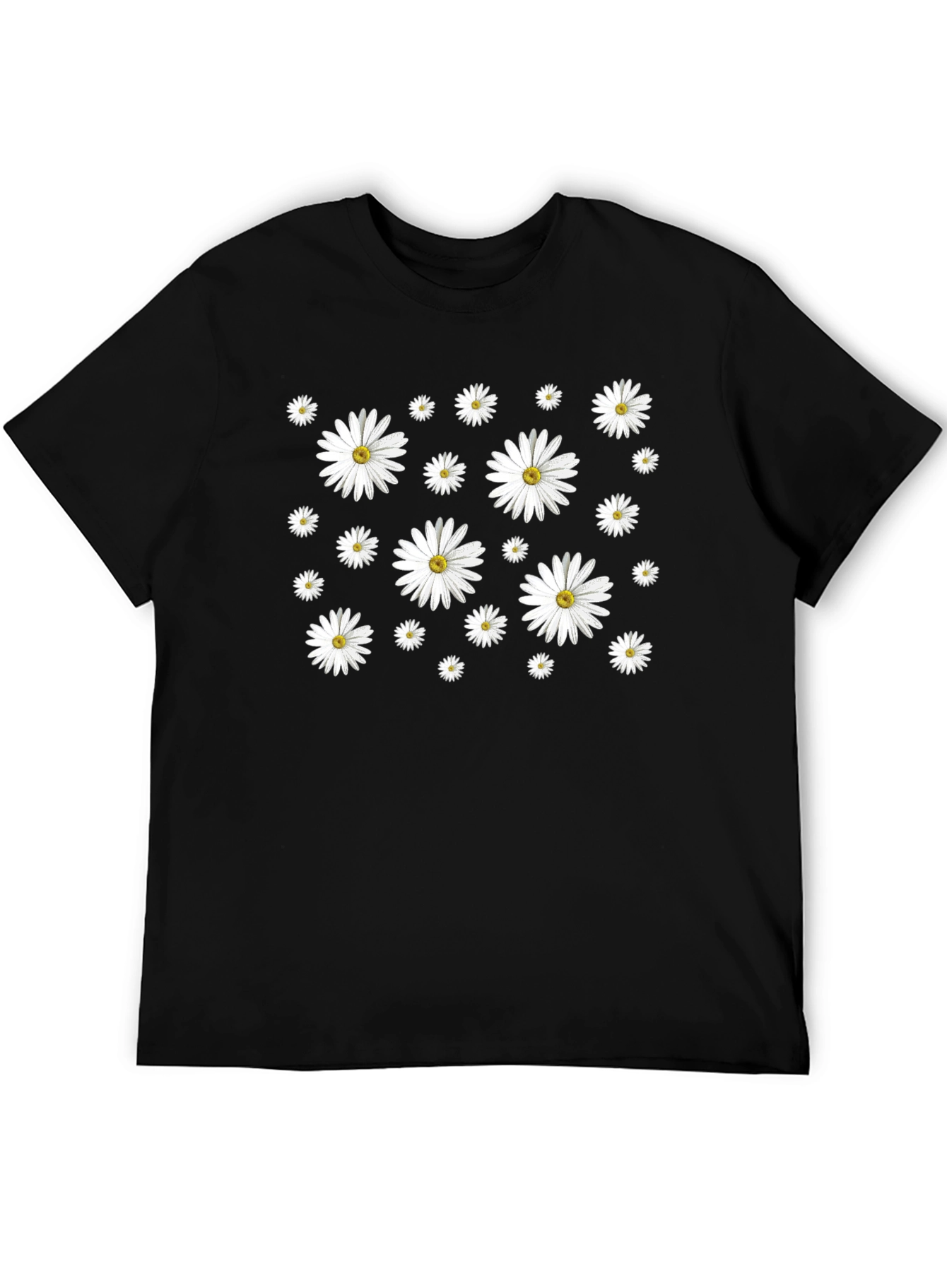 Show off your style with this eye-catching black t-shirt featuring a vibrant daisy pattern. Made from a comfortable and breathable fabric, this tee is perfect for everyday wear. The all-over daisy print adds a touch of floral fun to your wardrobe. The classic crew neck and short sleeves offer a relaxed fit, making it ideal for casual outings, summer festivals, or simply lounging at home. Pair it with jeans, shorts, or a skirt for a versatile and stylish look. Add a fresh, floral vibe to your closet with this standout daisy t-shirt!
