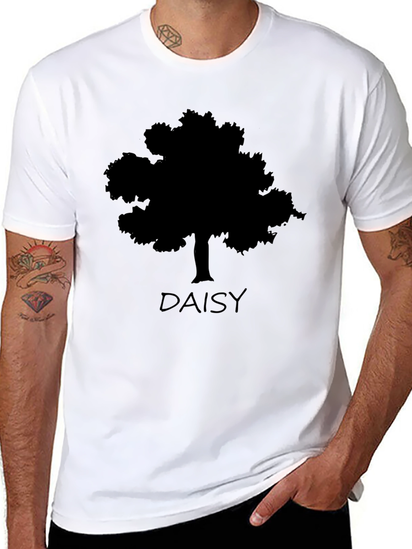 Show your love for nature with this stylish black t-shirt featuring a tree silhouette and the word "DAISY." Made from comfortable, breathable fabric, this tee is perfect for everyday wear. The simple yet elegant design makes it a versatile addition to any wardrobe. Whether you're out for a casual stroll or relaxing at home, this t-shirt offers both comfort and style. Makes a great gift for gardeners, nature enthusiasts, or anyone who appreciates unique apparel. The bold black color and eye-catching design ensure you'll stand out from the crowd.