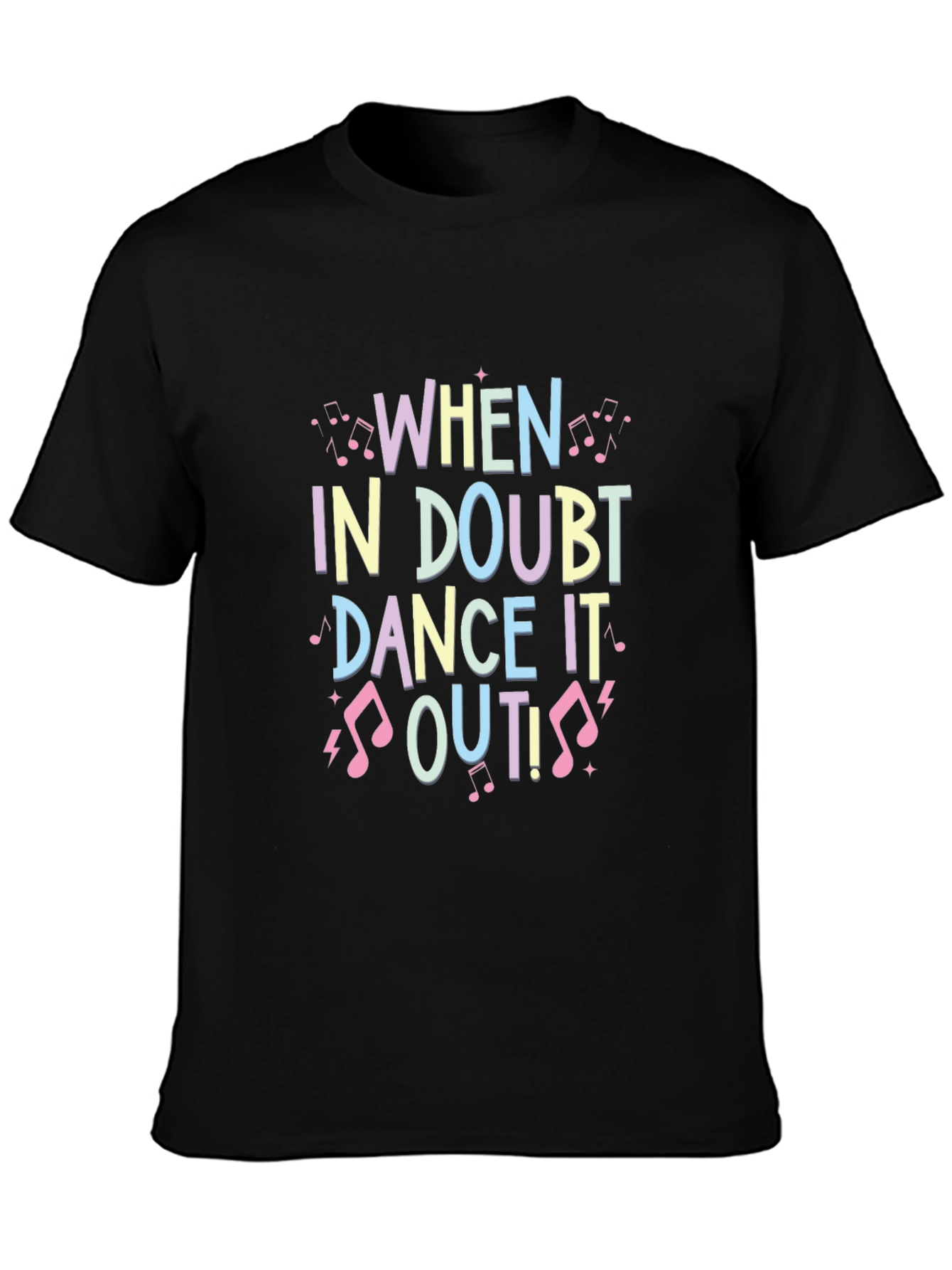 Rock this fun and motivational black t-shirt featuring the phrase "When In Doubt Dance It Out!" The design incorporates musical notes and pastel lettering for a vibrant and playful look. Made from comfortable, breathable fabric, this short-sleeved tee is perfect for casual wear, dance classes, or expressing your love for music and movement. Pair it with jeans, shorts, or leggings for a relaxed yet stylish outfit. This tee is a great conversation starter and is sure to bring a smile to everyone you meet!