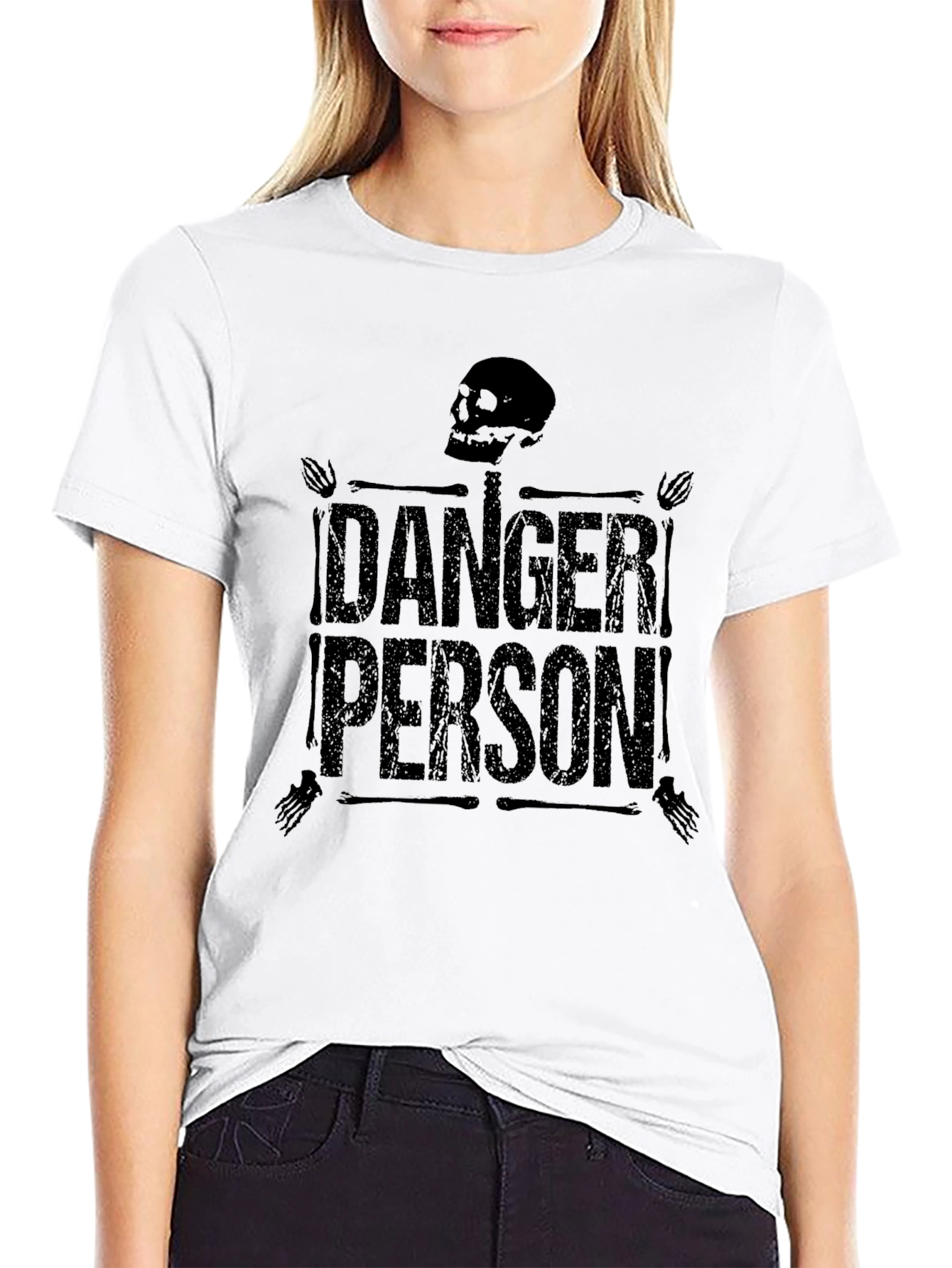 Show off your edgy side with this striking black graphic t-shirt. Featuring a bold "DANGER PERSON!" design with a stylized skeleton motif, this shirt is sure to turn heads. The design is printed in a distressed black ink, giving it a cool, vintage feel. Made from a soft, comfortable fabric, this t-shirt is perfect for casual wear, concerts, or expressing your unique personality. Pair it with jeans or shorts for a casual, stylish look. Make a statement and let everyone know you're a "Danger Person!"