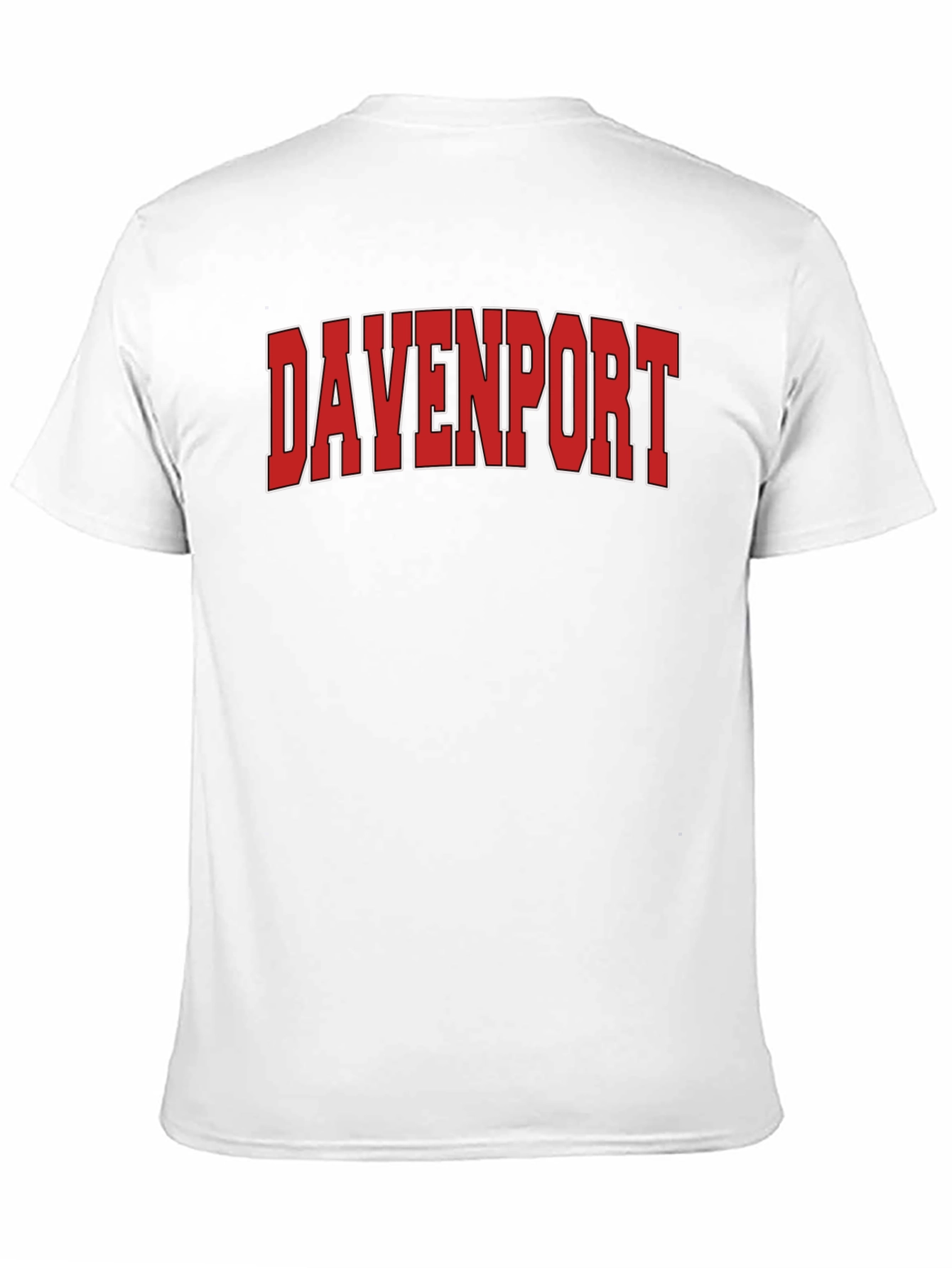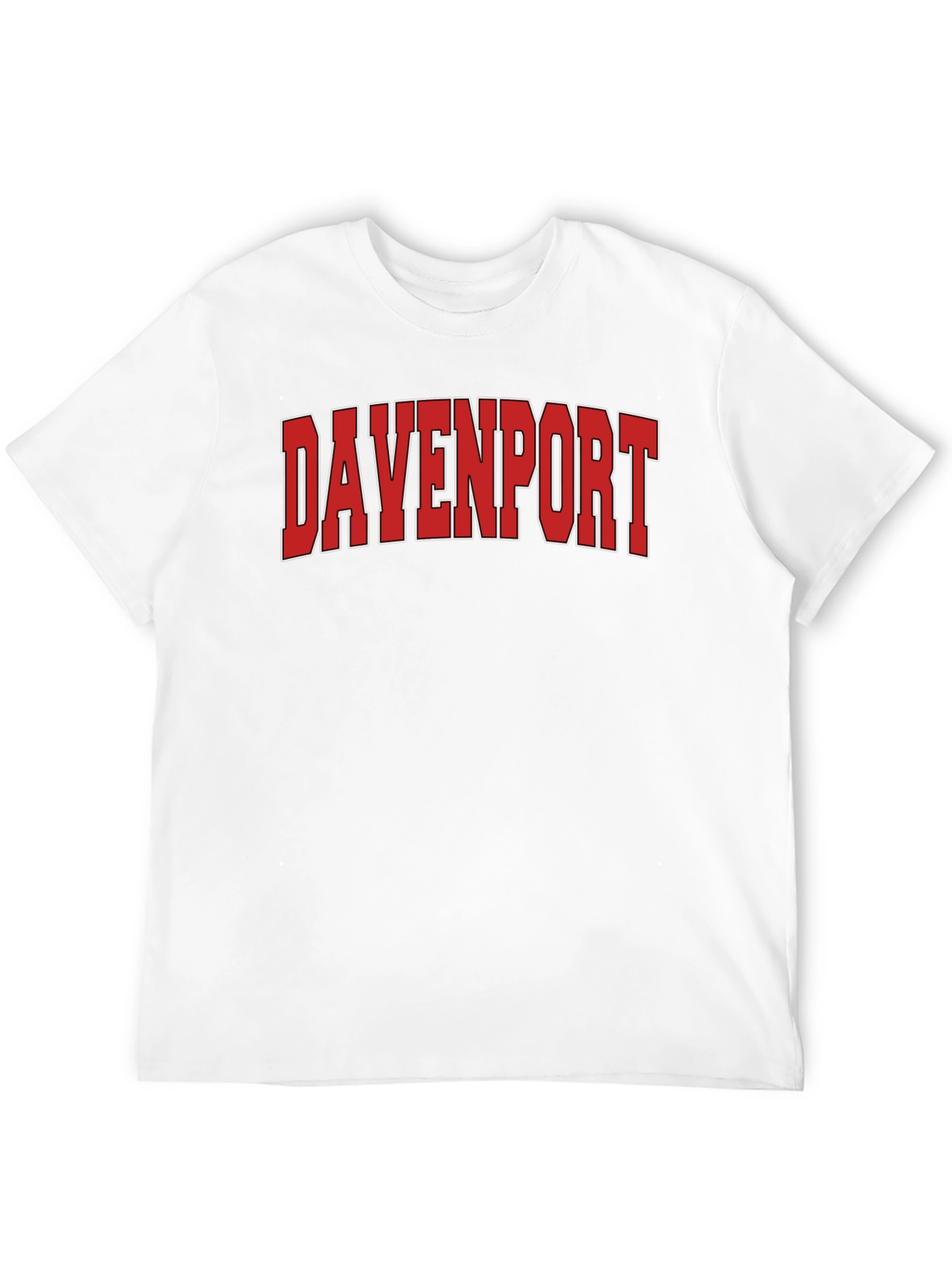 Showcase your city pride with this classic black t-shirt. The bold, red "Davenport" lettering, outlined in crisp white, makes a statement. Crafted from a comfortable, breathable fabric, this tee offers both style and comfort. Its versatile design pairs effortlessly with jeans, shorts, or casual pants, making it a wardrobe essential. Whether you're strolling around town or hanging out with friends, this t-shirt is a stylish way to represent your love for Davenport. The shirt features a classic crew neck and short sleeves for a timeless look. Wear it with pride and embrace your Davenport connection!