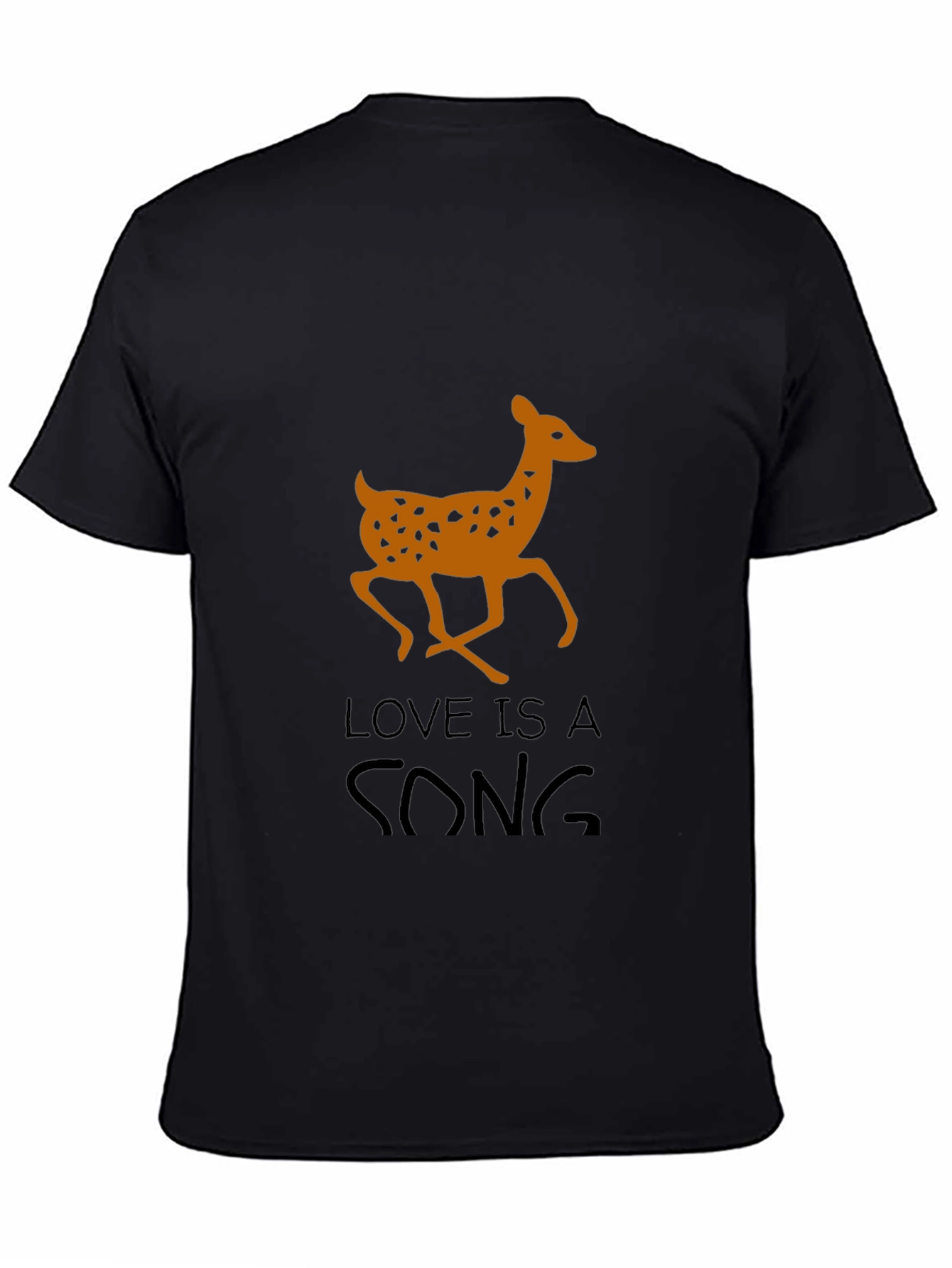 Express your love for nature and music with this stylish men's t-shirt. This black tee features a unique graphic of a deer silhouette with playful spots, accompanied by the words 'LOVE IS A SONG'. The design offers a creative and artistic twist on a classic theme. Crafted from a soft, comfortable fabric, this shirt is perfect for everyday wear or casual outings. The classic crew neck and short sleeves ensure a relaxed fit. Pair it with jeans, shorts, or your favorite casual bottoms for a cool and effortless look. Add a touch of whimsy to your wardrobe with this eye-catching tee!