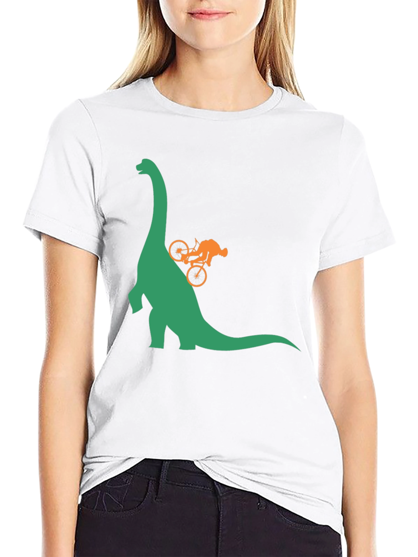 This black cotton t-shirt features a unique graphic of a green dinosaur with a person riding a bike on its back. The simple yet eye-catching design makes it a great conversation starter and a fun addition to any wardrobe. Made from comfortable cotton, this tee is perfect for casual wear, outdoor adventures, or simply lounging at home. Show off your love for dinosaurs and biking with this stylish and playful t-shirt. Its classic fit makes it suitable for various body types and a versatile piece for everyday wear.