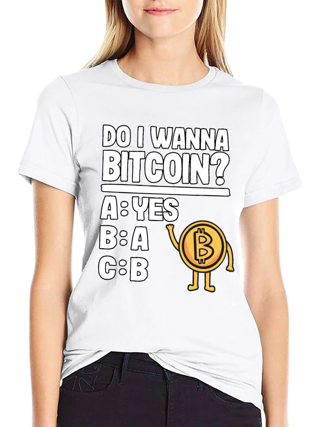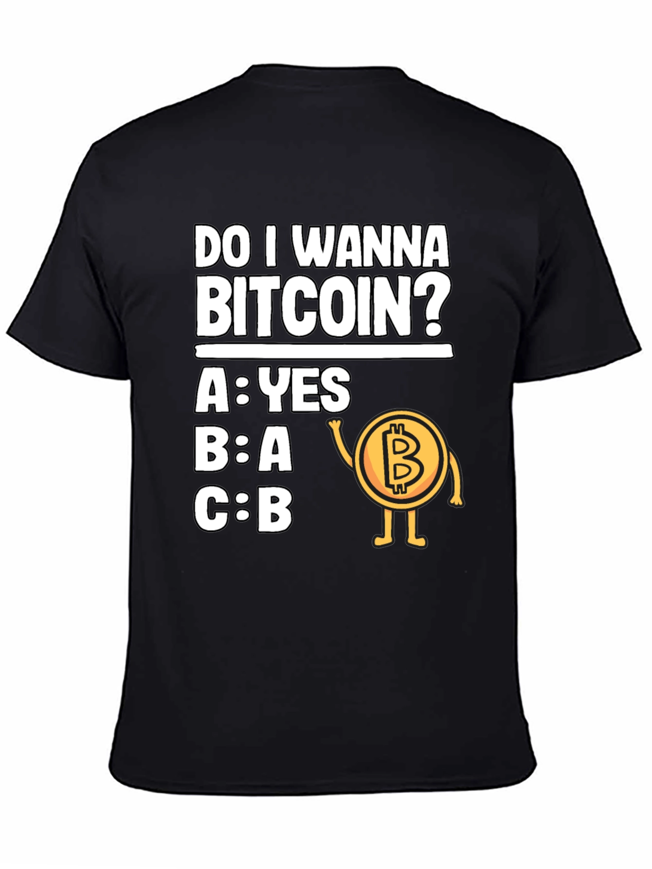 This black t-shirt features a humorous graphic that's sure to catch the eye of cryptocurrency enthusiasts. The design presents a multiple-choice question, "Do I Wanna Bitcoin?" with the answer options A: YES, B: A, and C: B, alongside a cartoon-style Bitcoin character with arms and legs. Made from what appears to be a comfortable cotton blend, this tee is ideal for casual wear. Whether you're at a crypto meetup, running errands, or just relaxing at home, this t-shirt lets you express your interest in Bitcoin with a touch of humor. It's a fun and unique addition to any wardrobe, and a great conversation starter for fellow crypto fans.
