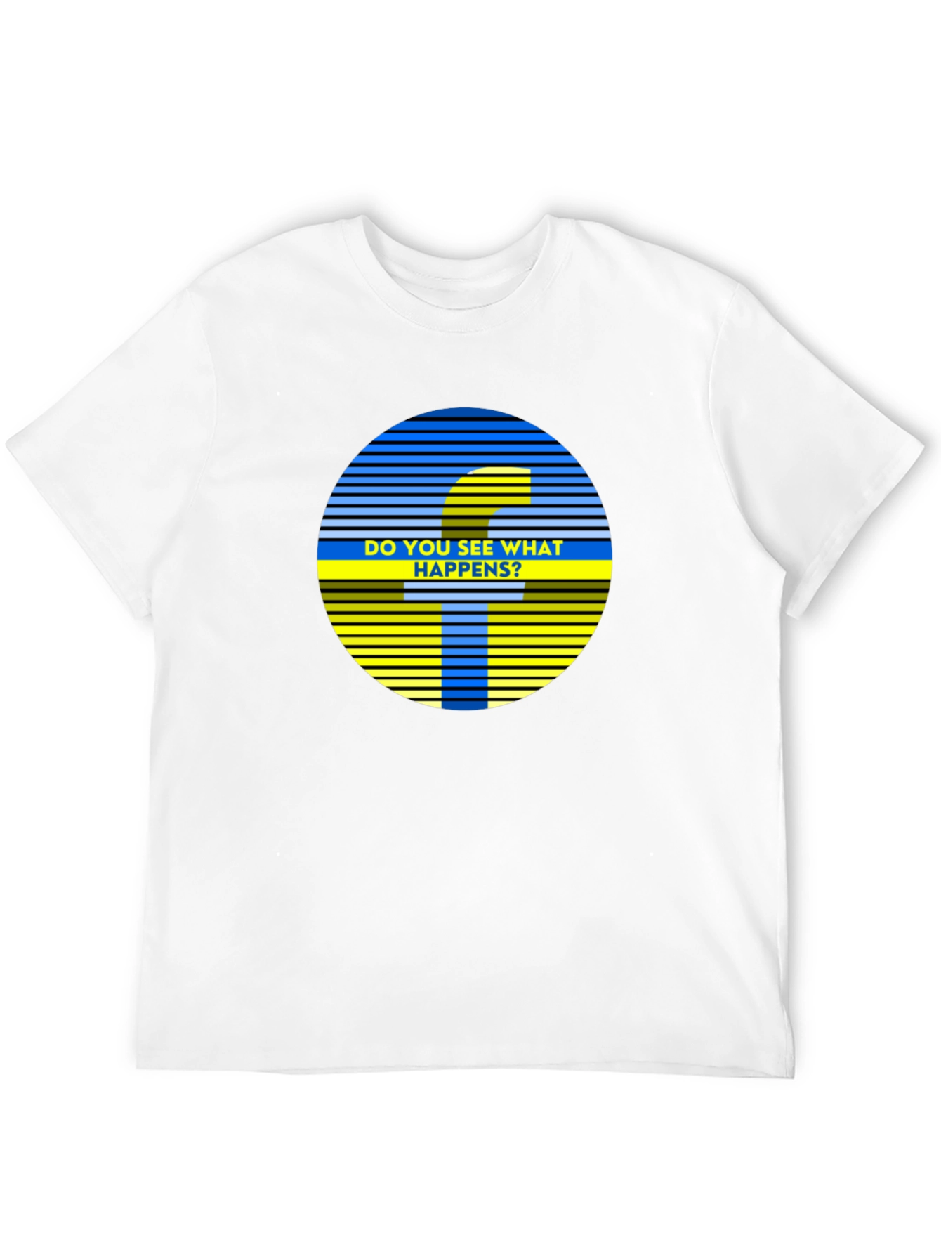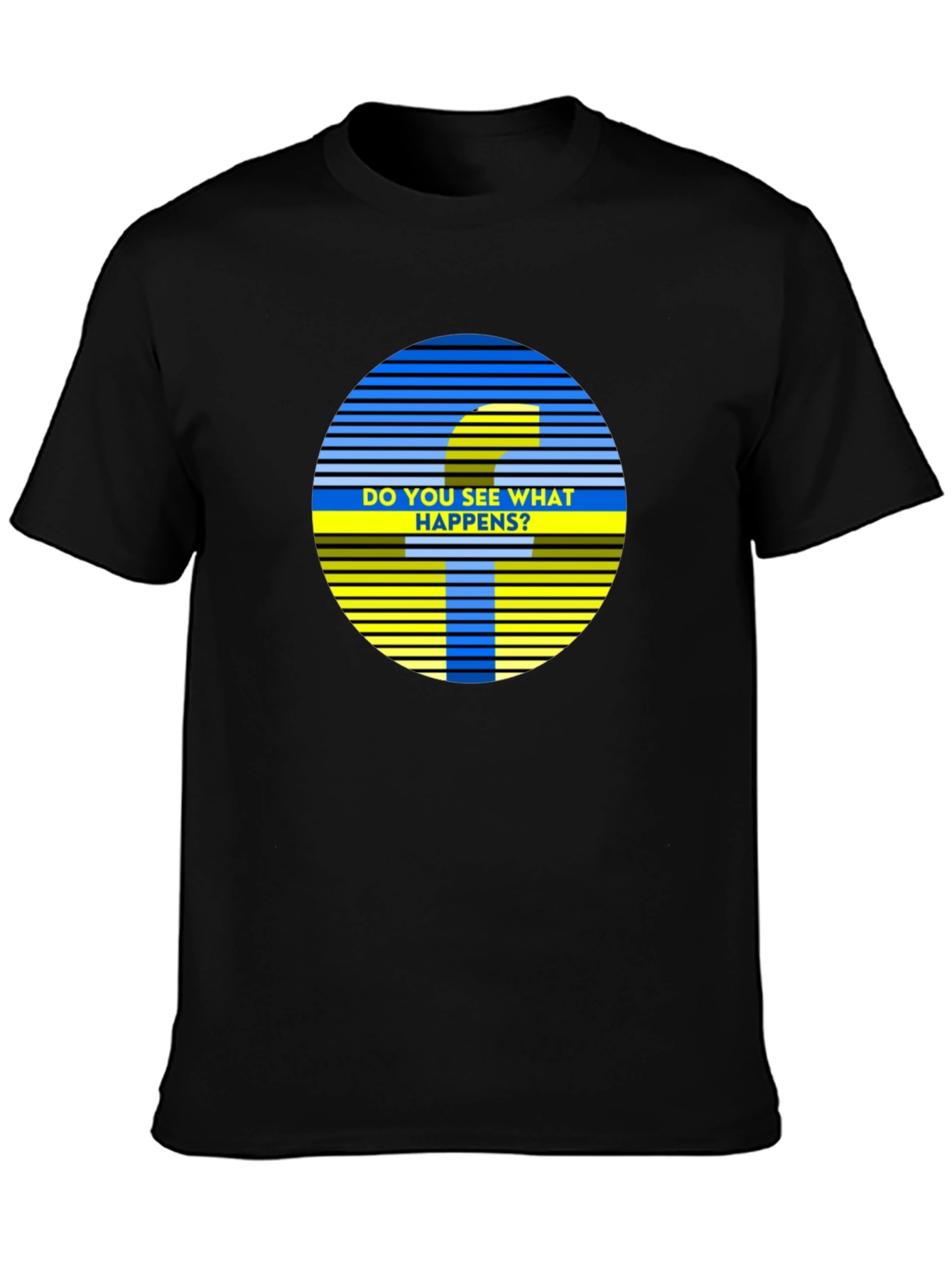 This eye-catching black t-shirt features a unique graphic design on the chest. The circular design incorporates blue and yellow horizontal stripes with an interesting F shape in the center, asking "Do You See What Happens?". The shirt appears to be made from a comfortable, breathable fabric. It is a casual short-sleeved style and appears to be a standard fit. The striking graphic and contrasting colors make it a great conversation starter. Perfect for casual wear, social gatherings, or as a statement piece, this tee offers both style and comfort.