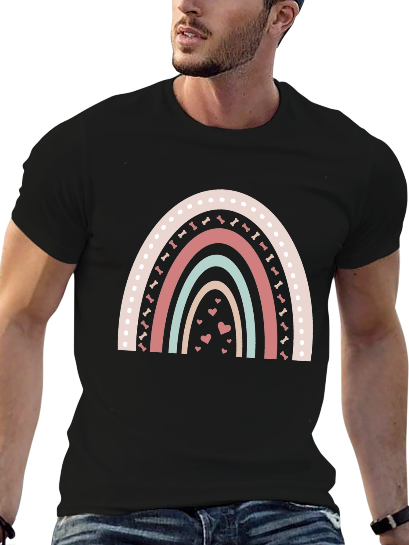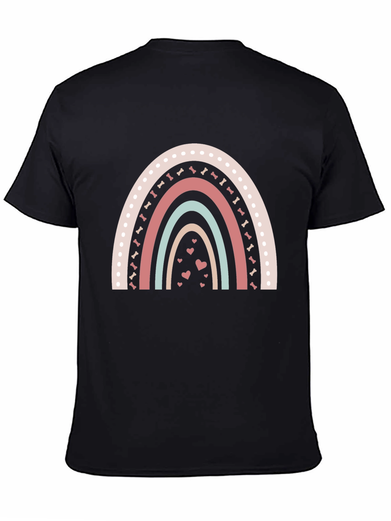 Show your love for dogs with this adorable t-shirt! The black tee features a charming rainbow design with alternating stripes of pastel colors. The rainbow's top layer is decorated with delightful polka dots and bone-shaped embellishments. Below, sweet little hearts add an extra touch of charm. This comfortable and stylish tee is perfect for casual wear, dog walks, or just lounging at home. Made from a soft, breathable fabric, it will keep you comfortable all day long. It's a must-have for any dog lover's wardrobe! Get yours today!
