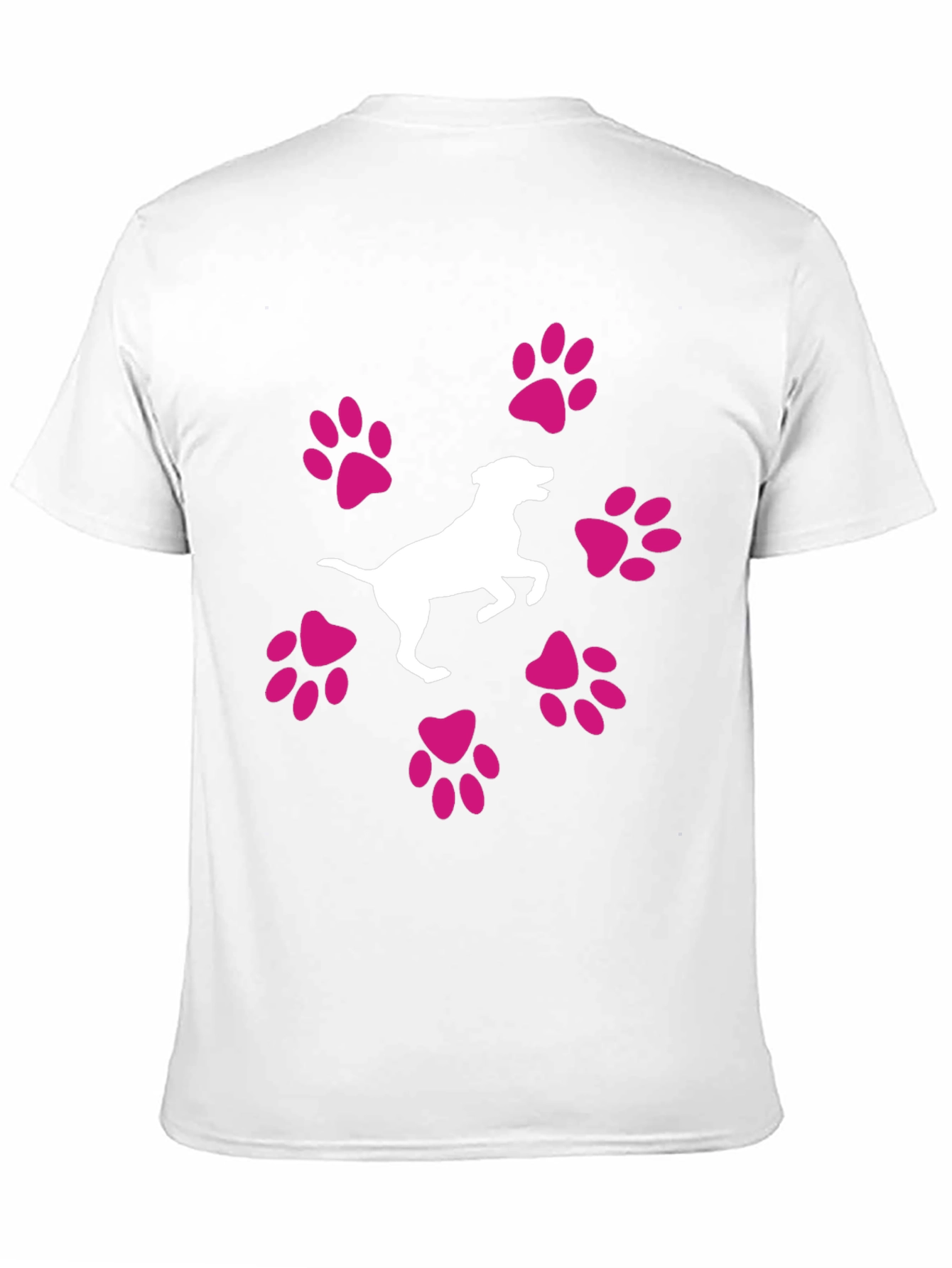 Show your love for dogs with this stylish black T-shirt! Featuring a playful white dog silhouette surrounded by vibrant pink paw prints, this tee is perfect for casual wear. The design is eye-catching and fun, making it a great conversation starter for any dog enthusiast. Made from a comfortable, breathable fabric, this shirt is ideal for everyday activities, dog walks, or simply lounging around. Express your passion for your furry friend with this unique and charming T-shirt. A must-have addition to any dog lover's wardrobe!