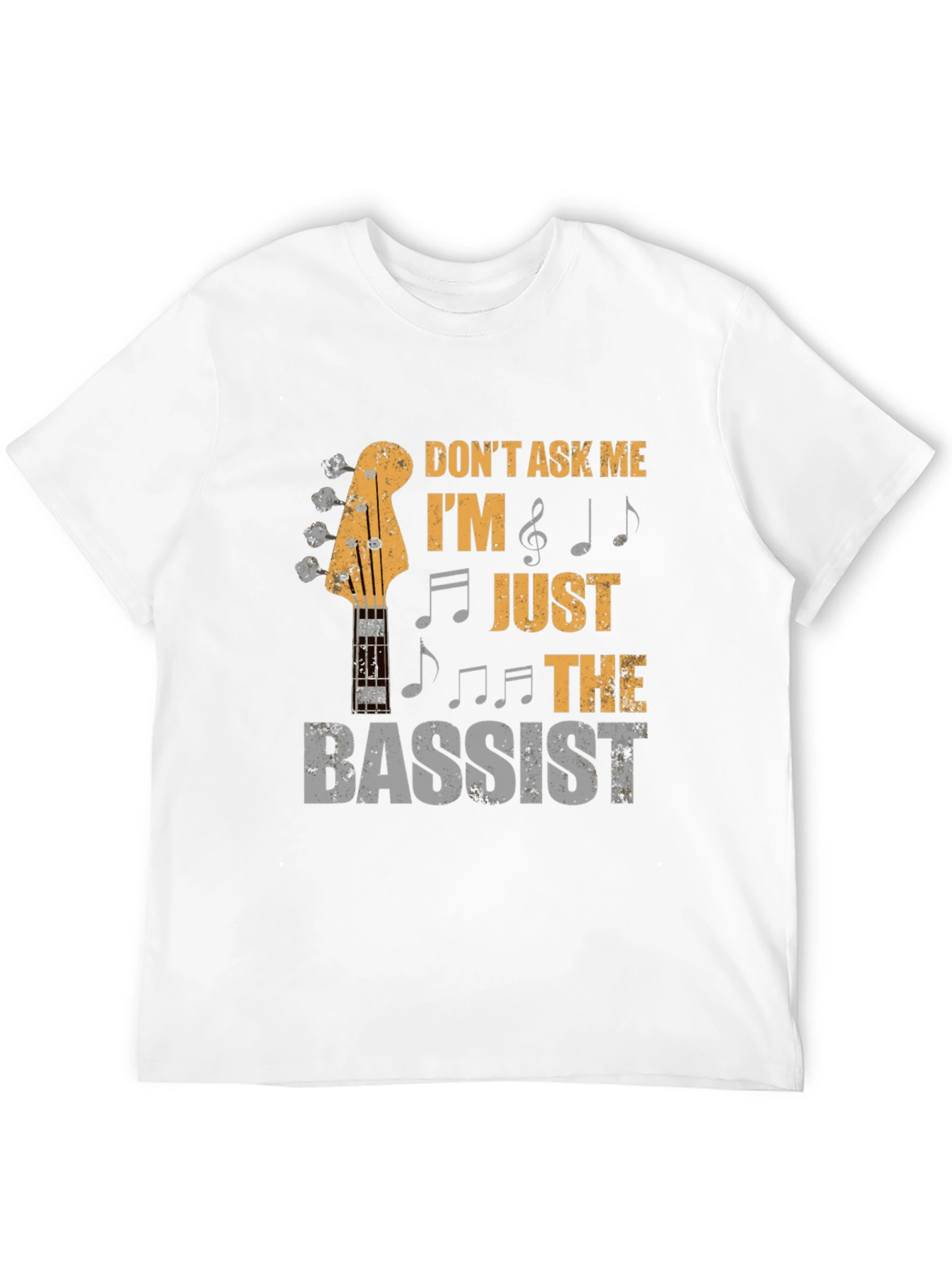 Show off your love for music with this stylish black t-shirt! Featuring a creative graphic of a bass guitar neck, musical notes, and the humorous text "DON'T ASK ME I'M JUST THE BASSIST," this shirt is perfect for musicians and music lovers alike. The design has a slightly distressed, vintage feel, adding to its appeal. Comfortable and eye-catching, it's ideal for casual wear, band practice, concerts, or just hanging out with friends. Makes a great gift for the bassist in your life!