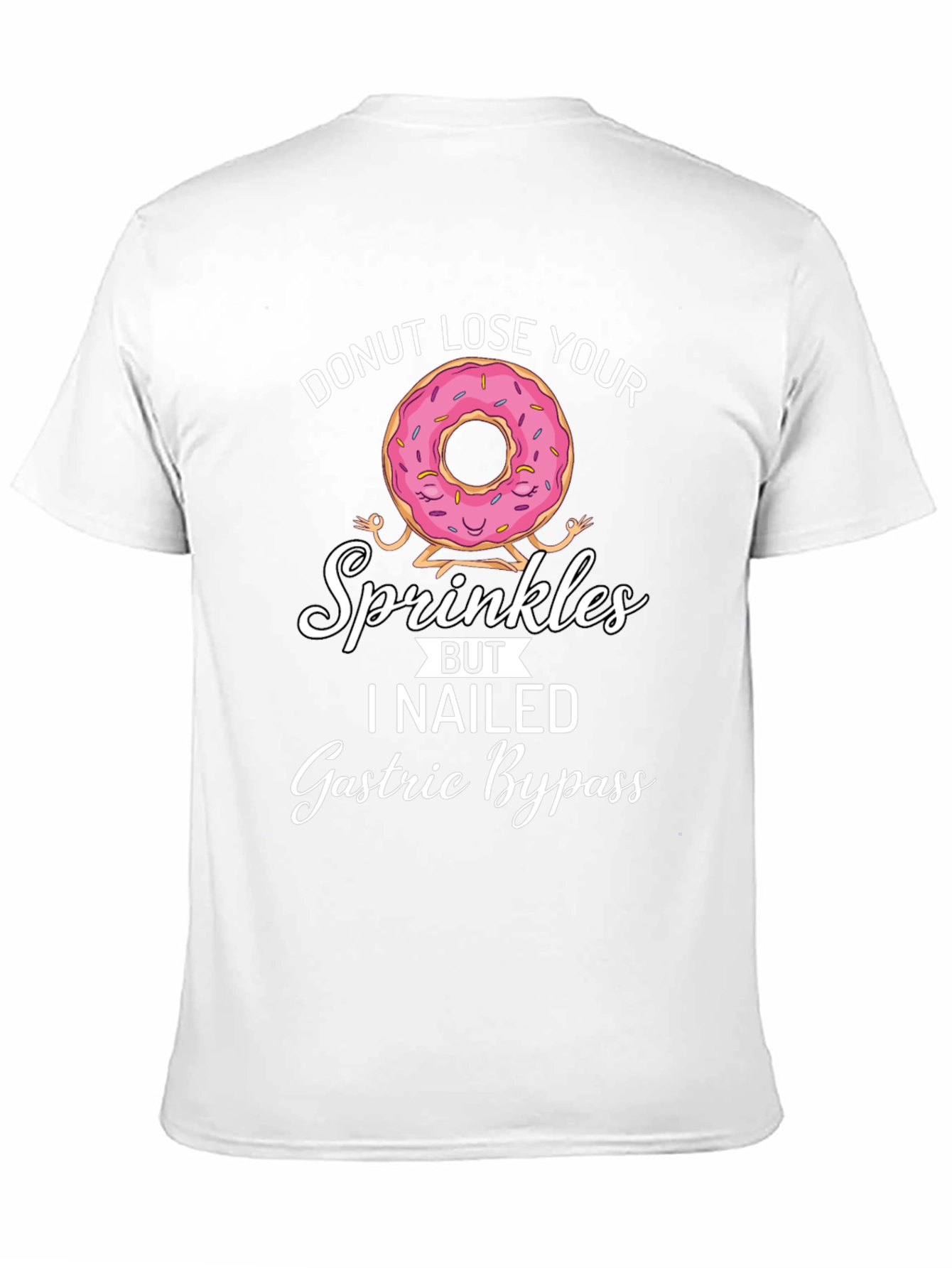 This black t-shirt features a playful graphic of a donut doing yoga, accompanied by the text "DONUT LOSE YOUR SPRINKLES BUT I NAILED Gastric Bypass." The design is printed in white and features a pink donut with sprinkles and a joyful expression. Ideal for individuals who have undergone gastric bypass and want to express their accomplishment with a touch of humor. Made from a soft and breathable fabric, this t-shirt offers a comfortable fit and relaxed style. Wear it casually or give it as a thoughtful gift to someone celebrating their weight loss journey.