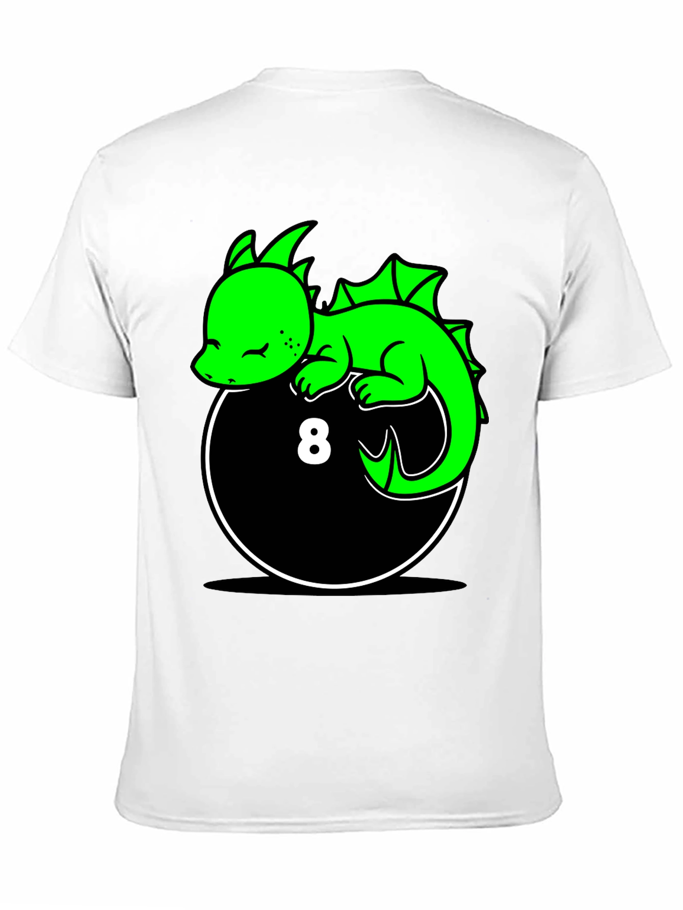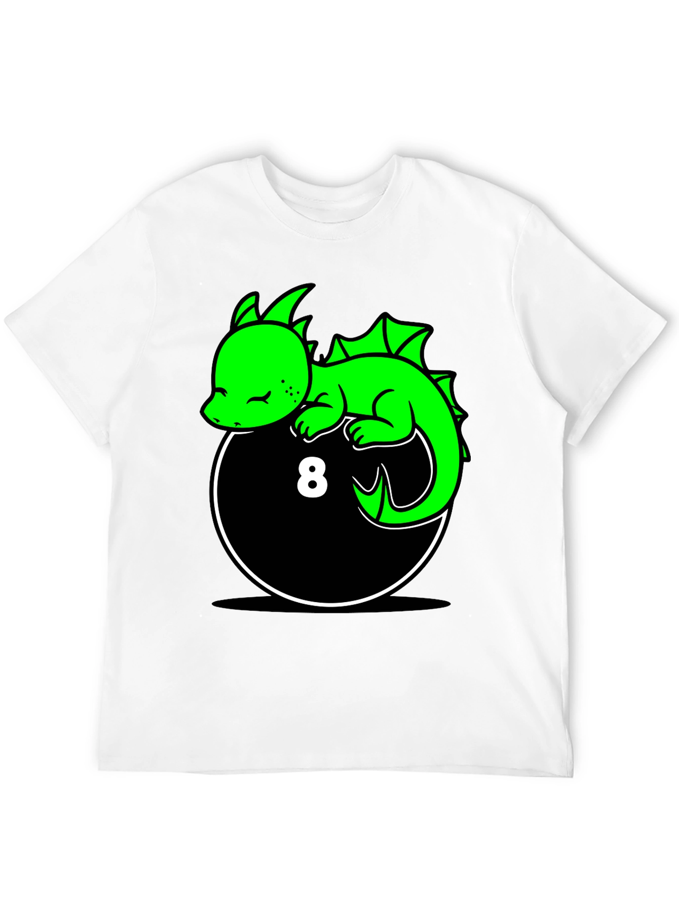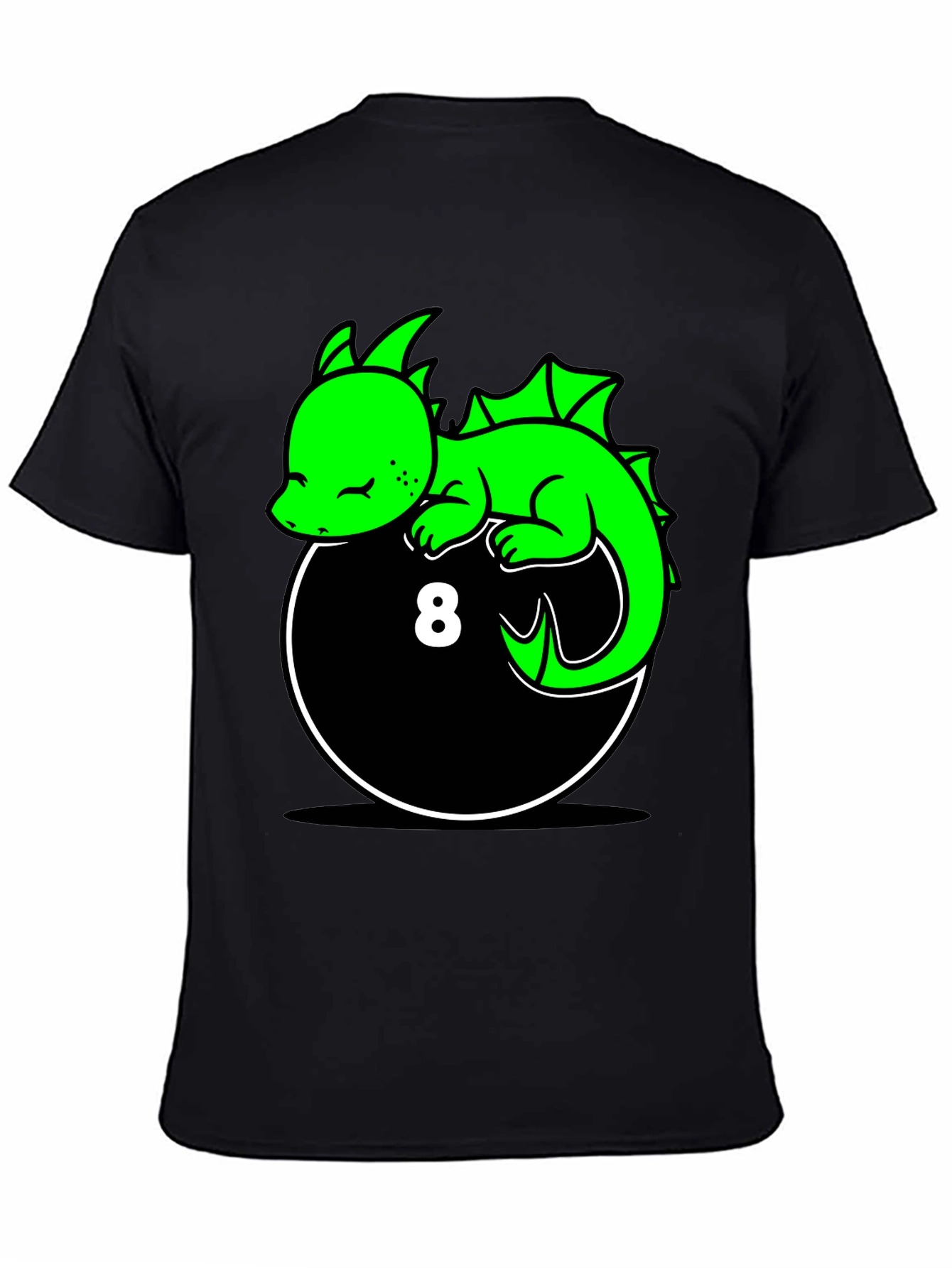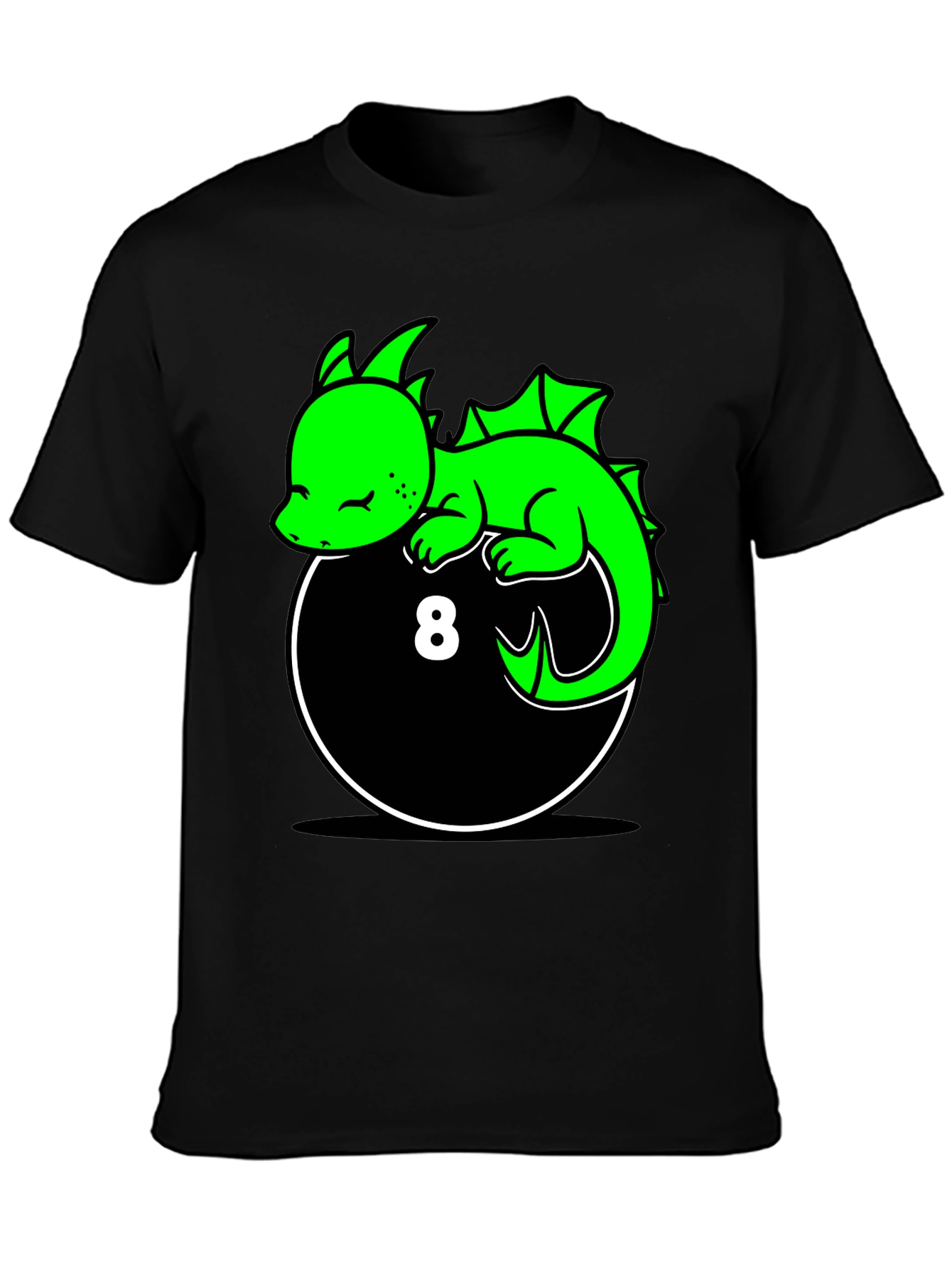 Show off your unique style with this eye-catching graphic tee! The black shirt features a vibrant green cartoon dragon resting atop an 8-ball design. The whimsical illustration is perfect for those who love fantasy creatures or billiards. The shirt appears to be made from a soft, comfortable material, making it ideal for everyday wear. Whether you're lounging at home, heading to a casual hangout, or looking for a conversation starter, this tee is sure to make a statement. Add a touch of fun and personality to your wardrobe with this awesome dragon tee!