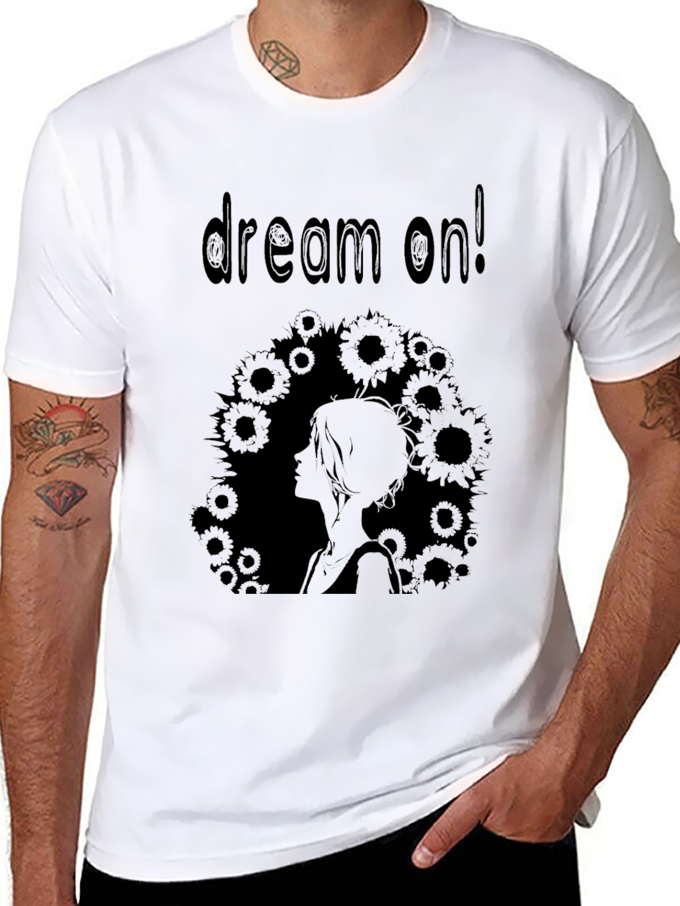 This stylish black t-shirt features a unique graphic design. "Dream On!" is displayed above an artistic silhouette of a woman surrounded by sunflower-like shapes. The dark color of the tee makes the graphic stand out, offering a bold and fashionable look. Made from a comfortable material, this tee is perfect for everyday wear. Wear it casually with jeans or dress it up with a jacket, this tee adds a touch of individuality to any outfit. Show off your unique style and inspire others to dream big with this statement-making tee!