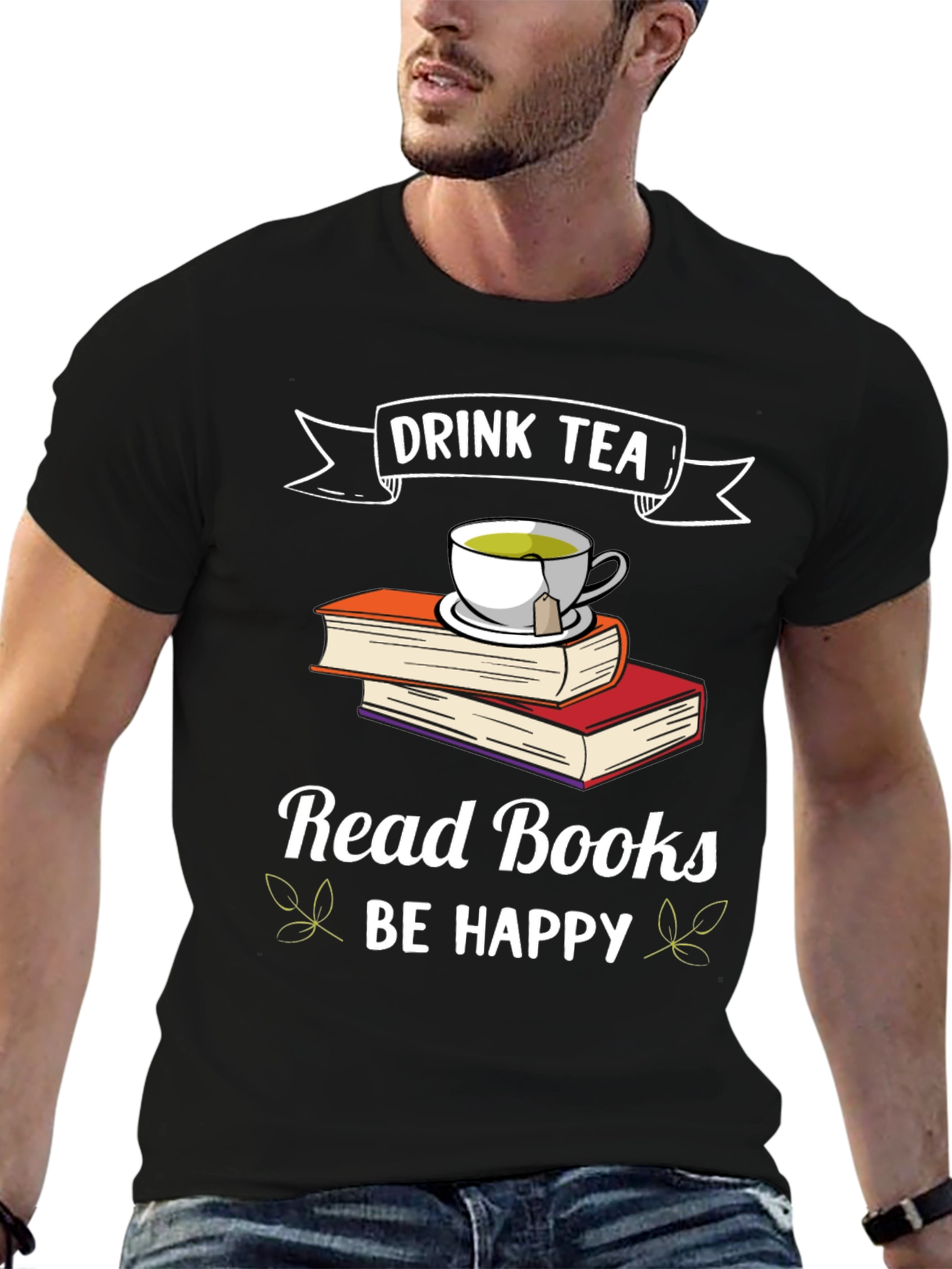 Embrace your love for tea and reading with this unique graphic tee! The black t-shirt features a charming design with a steaming cup of tea sitting atop a stack of books. Bold white lettering proclaims "Drink Tea Read Books BE HAPPY," making it a perfect conversation starter. This comfortable tee is ideal for casual wear, library visits, or cozy reading sessions at home. Show off your passions with style and enjoy the comfort of this eye-catching t-shirt. A must-have for bookworms and tea lovers alike!