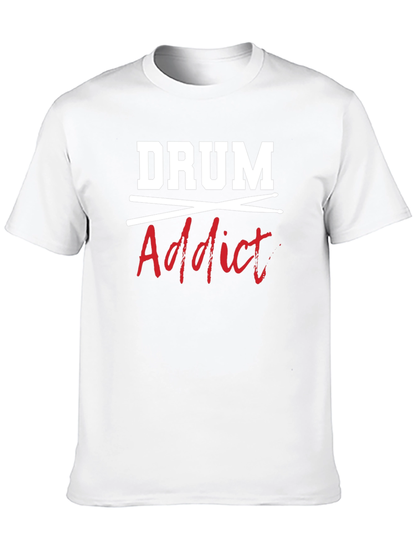 Showcase your passion with this Drum Addict T-shirt. Crafted from a comfortable fabric, this tee features a bold graphic design with the words "DRUM" above two drumsticks and "Addict" in a red font below the drumsticks. This eye-catching shirt is perfect for drummers and music lovers alike. The design makes it a great conversation starter, and the tee itself is ideal for casual outings, band practices, or everyday wear. Make a statement about what moves you with this fun and stylish graphic tee.